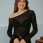 Een licht en luchtig shirt met een speels asymmetrisch schouderdetail voor een verrassend effect. Door de see-through stof voelt het extra zomers en elegant tegelijk. Perfect om over een top of bandeau te dragen en je lente-look een moderne twist te geven.