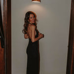 Een feestelijke zwarte halterjurk die fonkelt dankzij de glinsterende sequins. Het elegante model met halternek geeft een stijlvolle en opvallende uitstraling. Perfect om tijdens de feestdagen vol glamour en zelfvertrouwen te stralen.