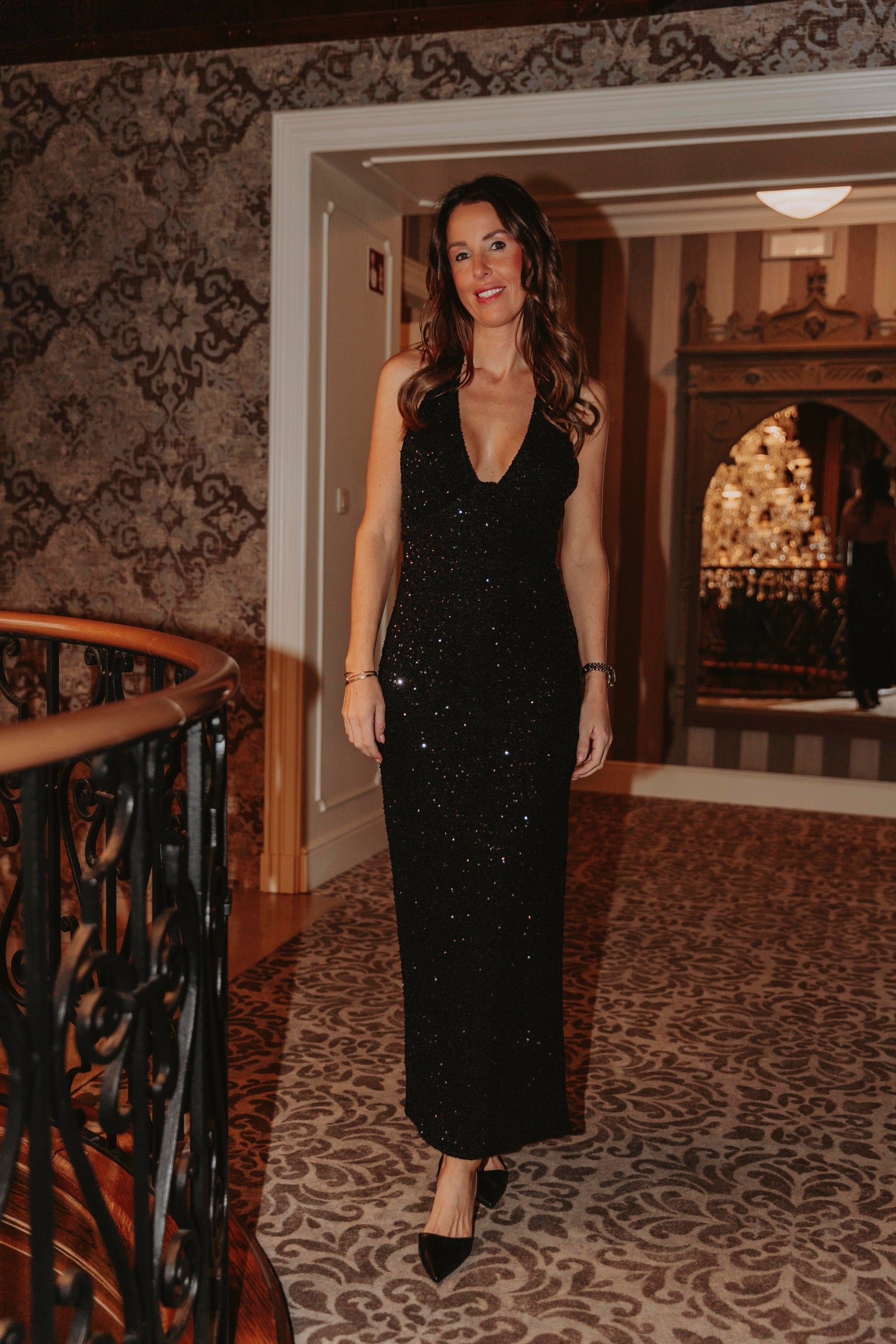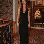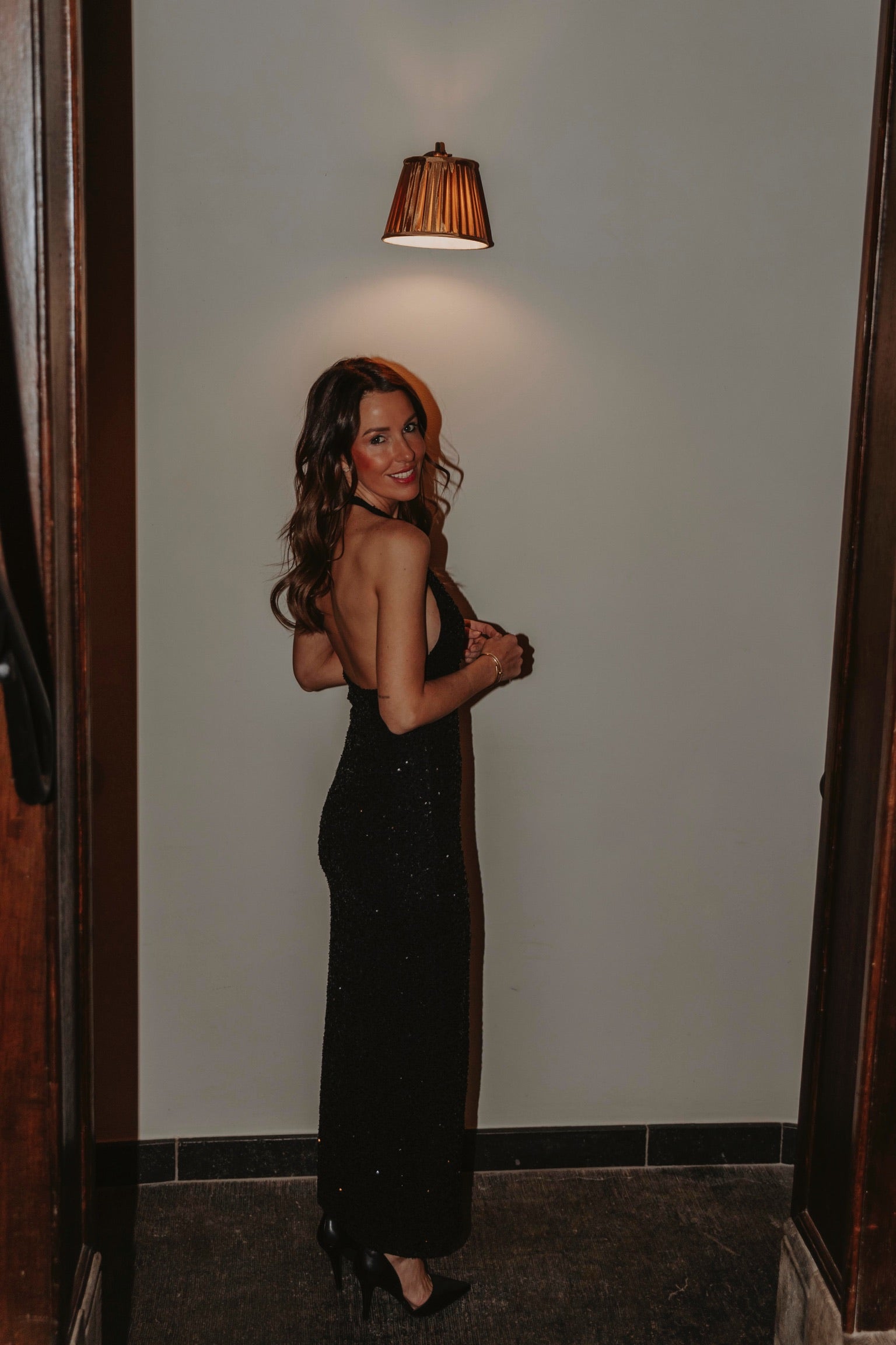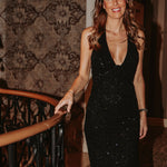 HOLIDAY MAGIC BLACK SEQUIN HALTER DRESS