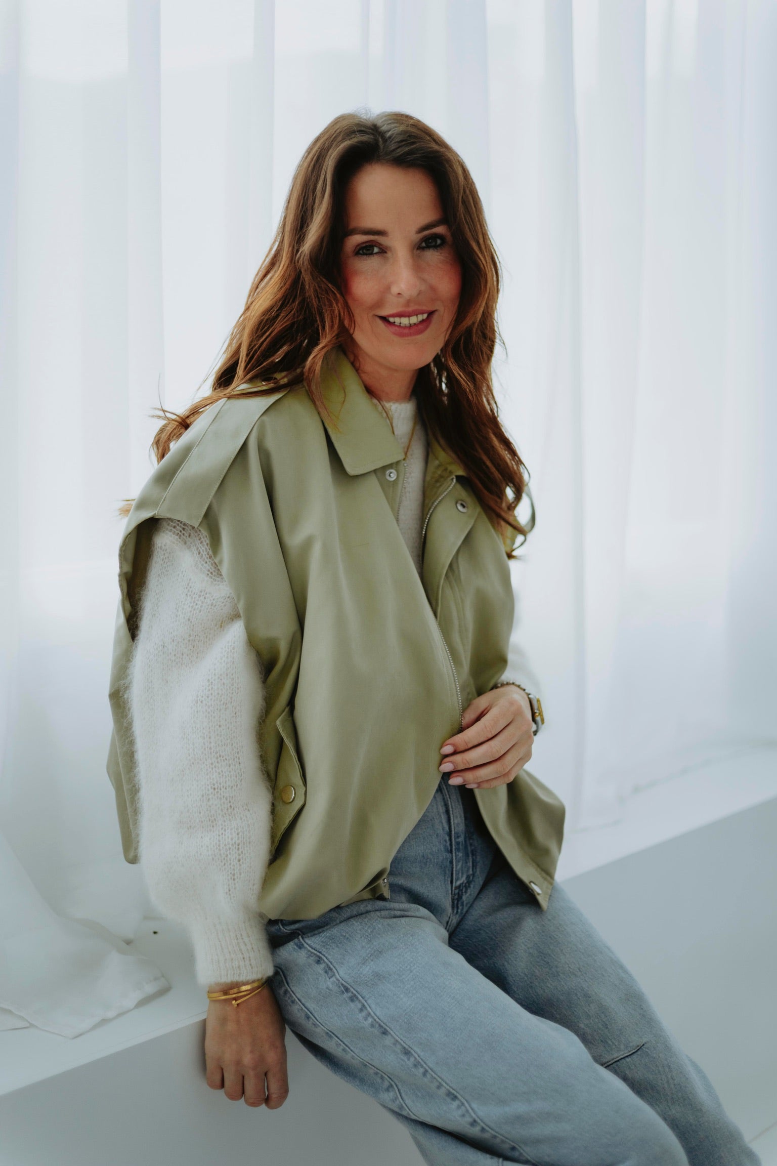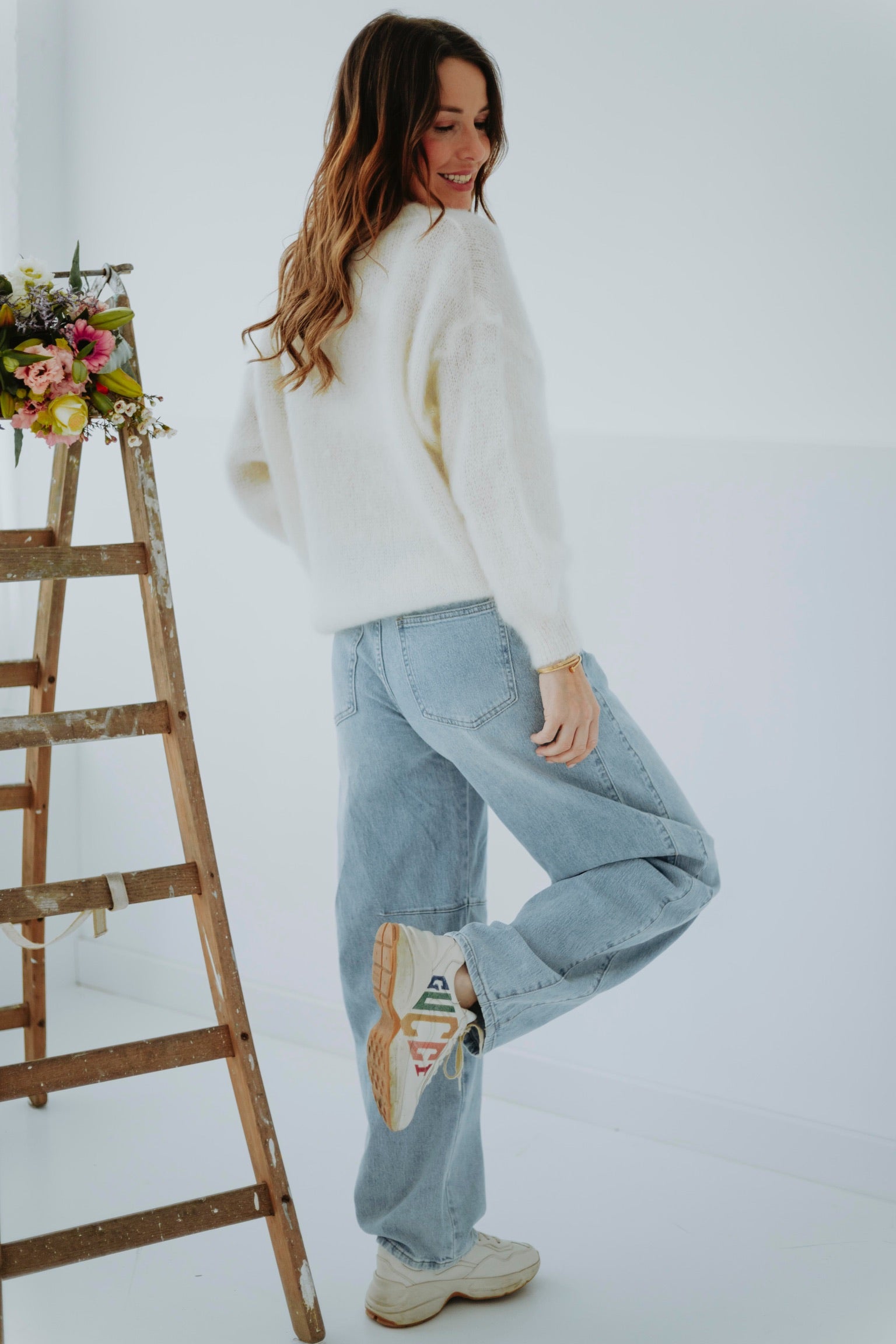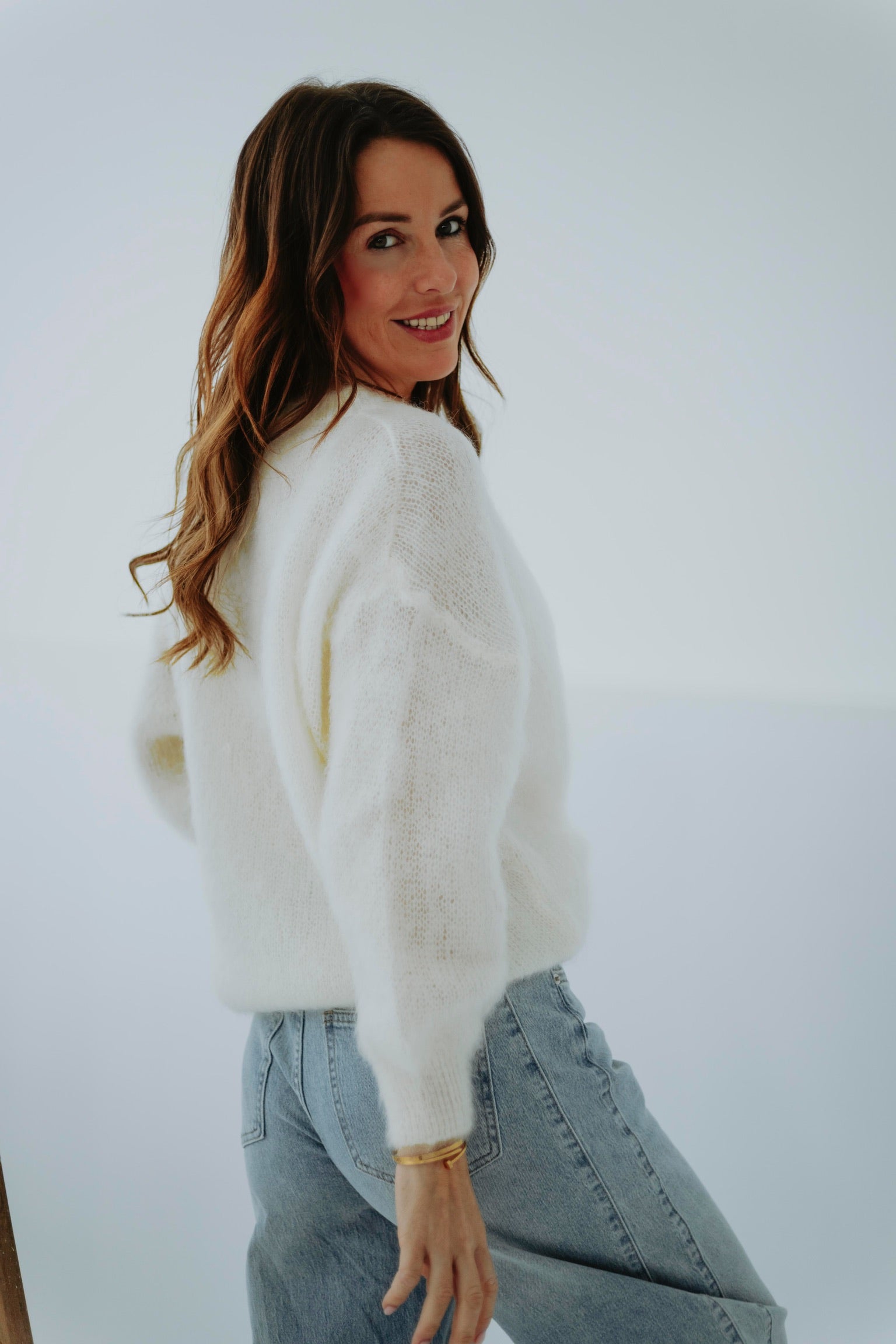 Het zachte mohairmateriaal voelt licht en cosy aan, perfect voor frisse lentedagen. De ecru tint zorgt voor een rustige, elegante uitstraling die makkelijk te combineren is. Een tijdloos en comfortabel item met een zachte, verfijnde touch.