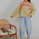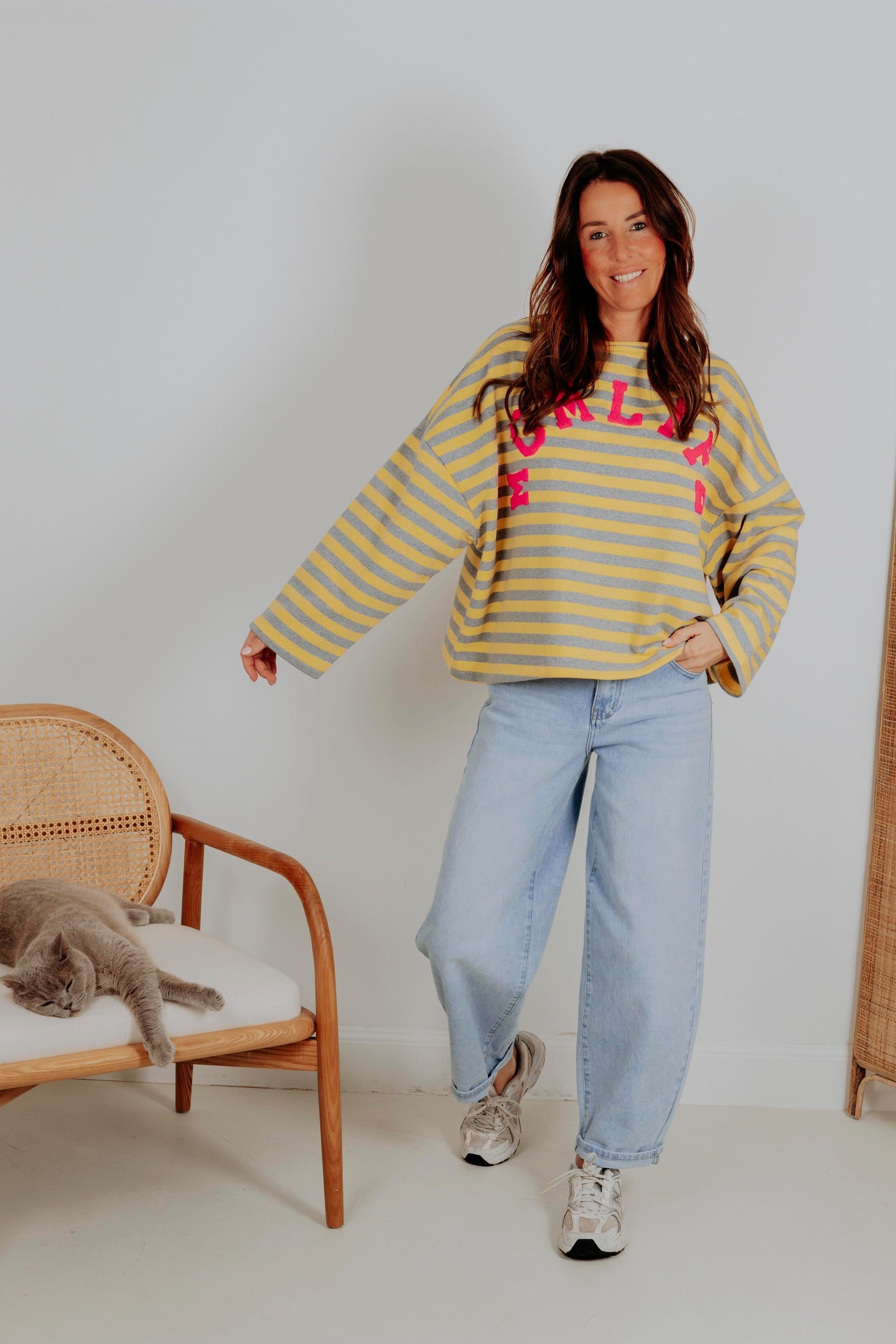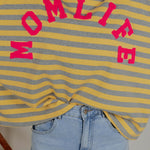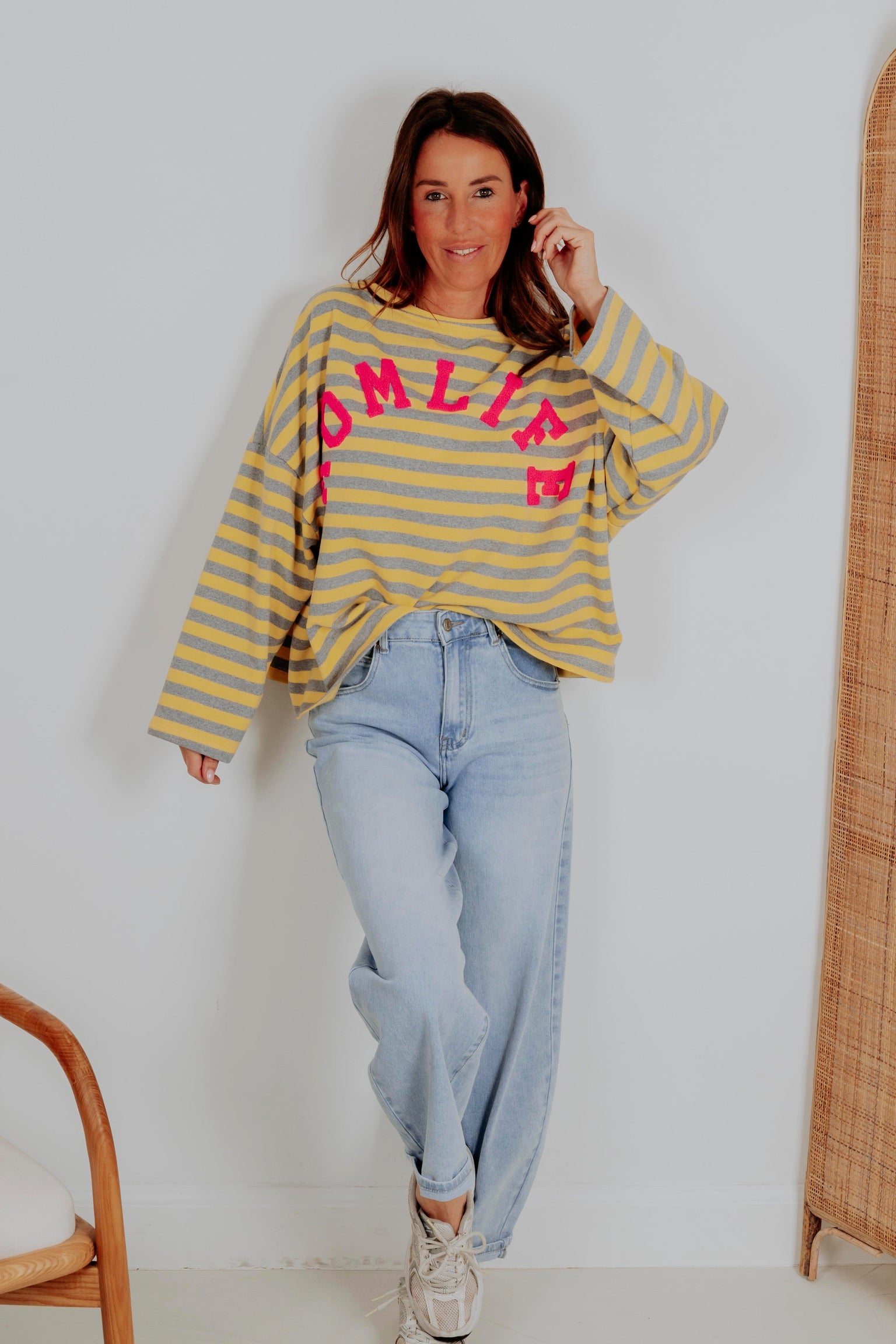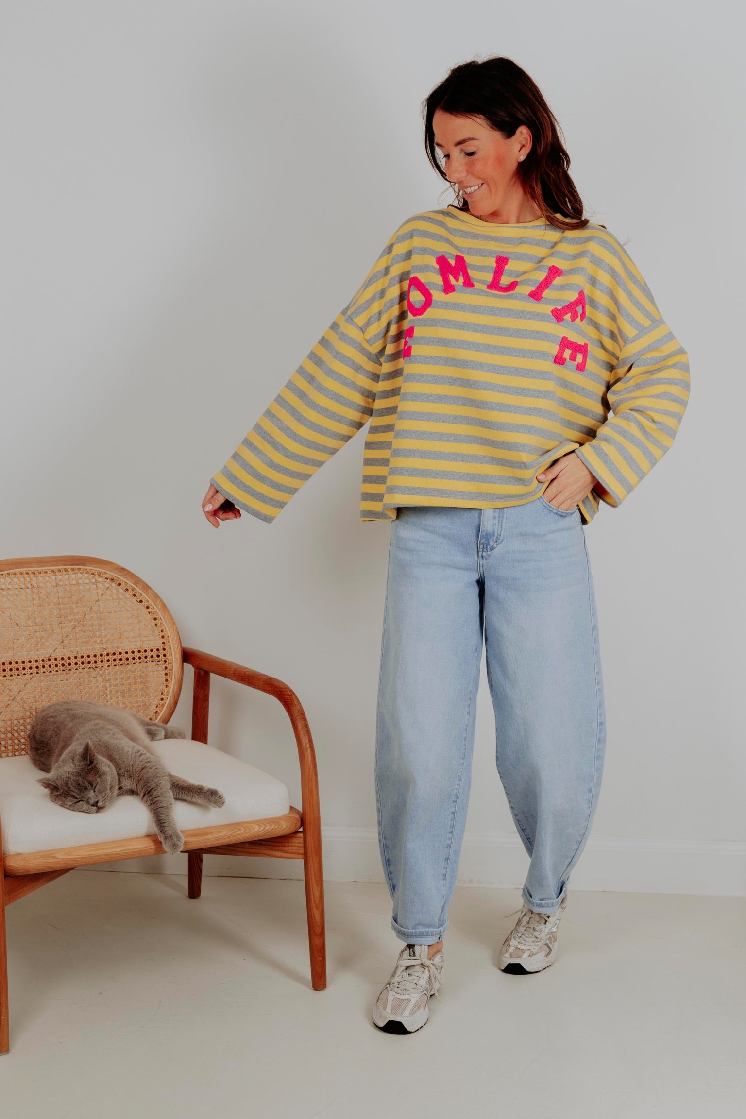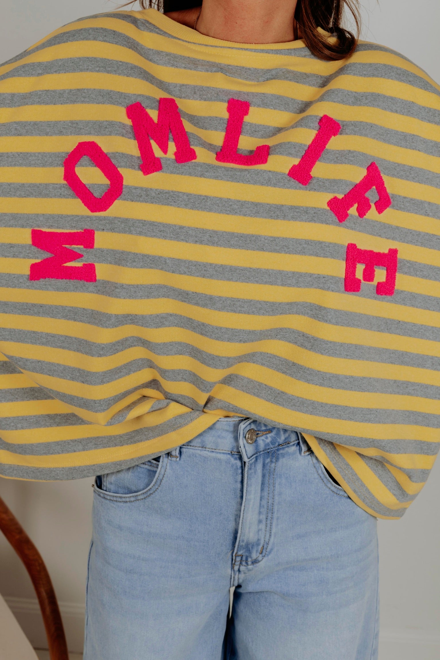 Een gezellige geel/grijs gestreepte trui met een vrolijk, kleurrijk opschrift MOMLIFE dat je zowel aan de voorkant als op de rug kunt laten zien. Het speelse ontwerp en de zachte stof geven een frisse, luchtige vibe aan elke casual voorjaarslook.