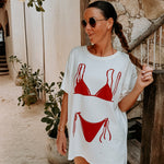 Een wit T-shirt met een speels rode bikini-print die zomerse energie uitstraalt. Perfect om casual te dragen tijdens zonnige dagen aan het strand.