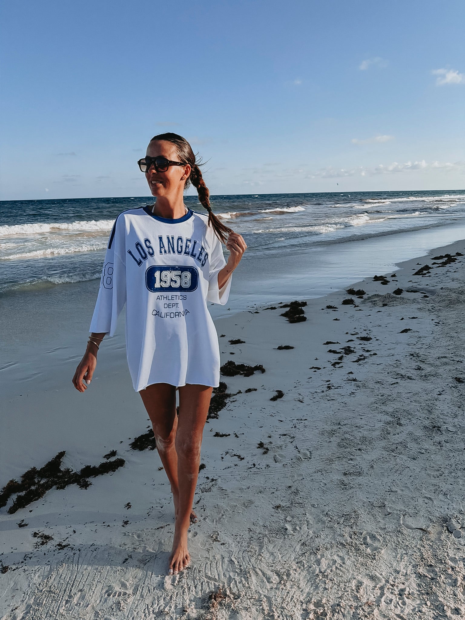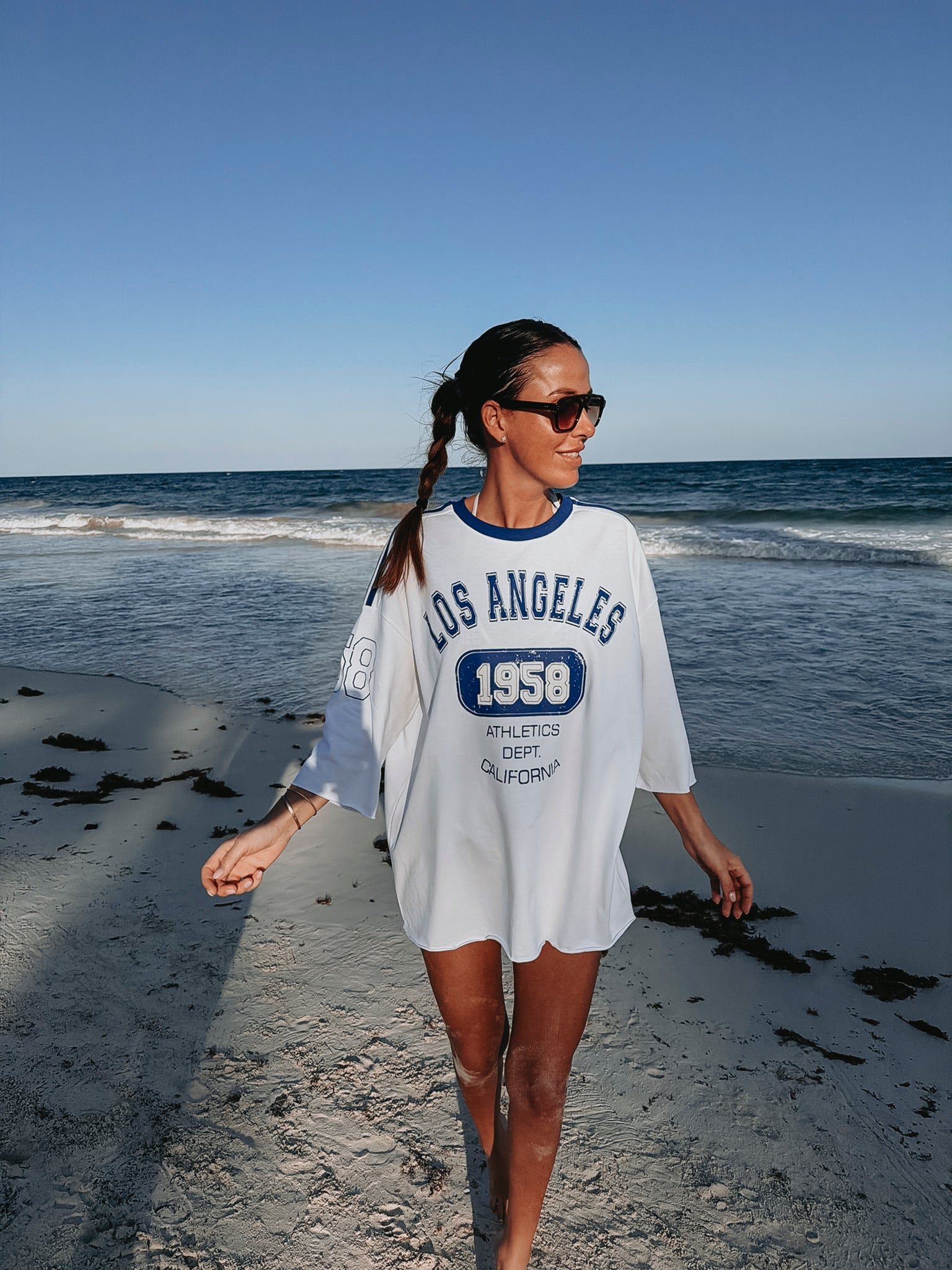 Wit T-shirt met een kobaltblauw opschrift en een lange, losse pasvorm. Perfect om nonchalant over je bikini te dragen tijdens zonnige stranddagen.