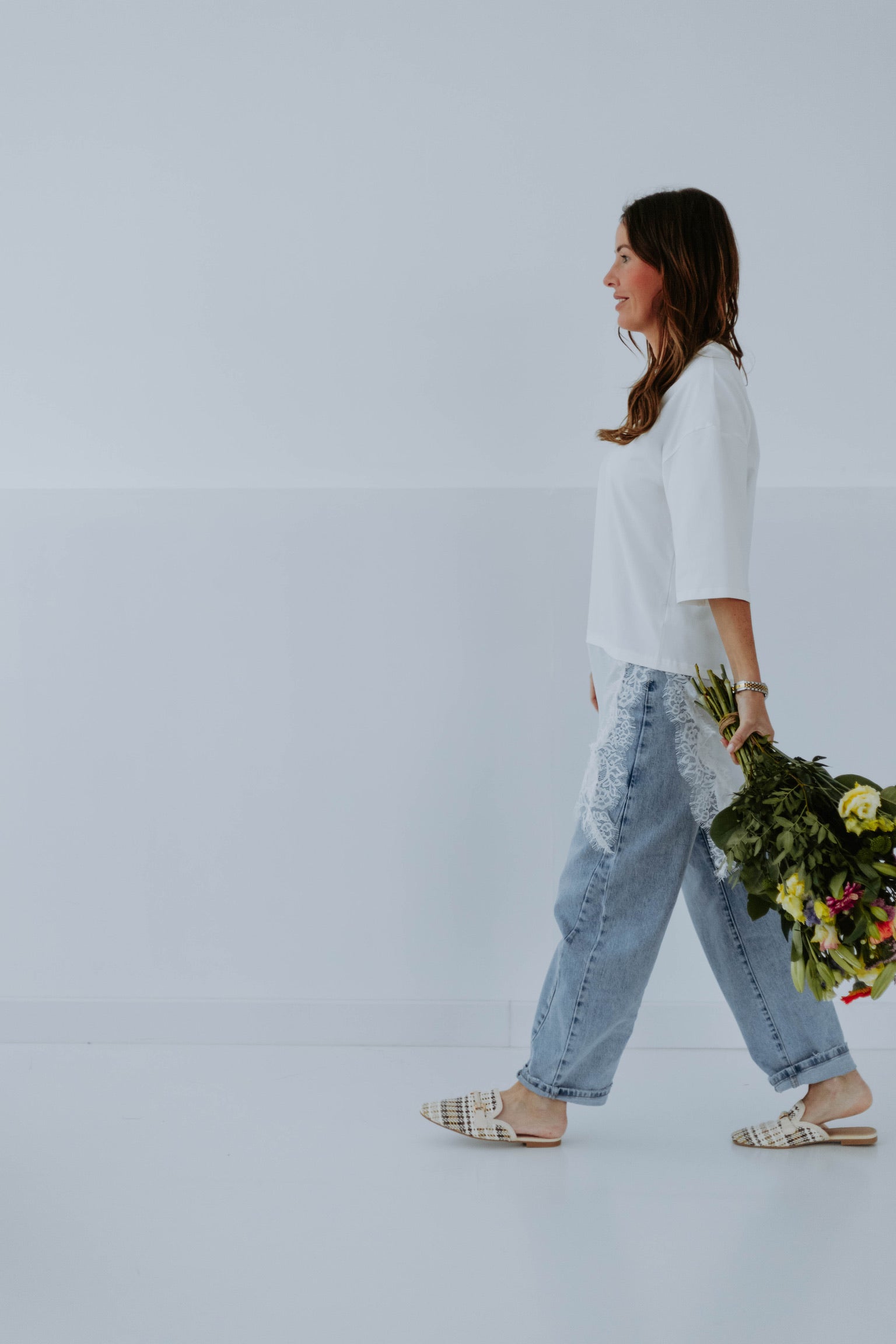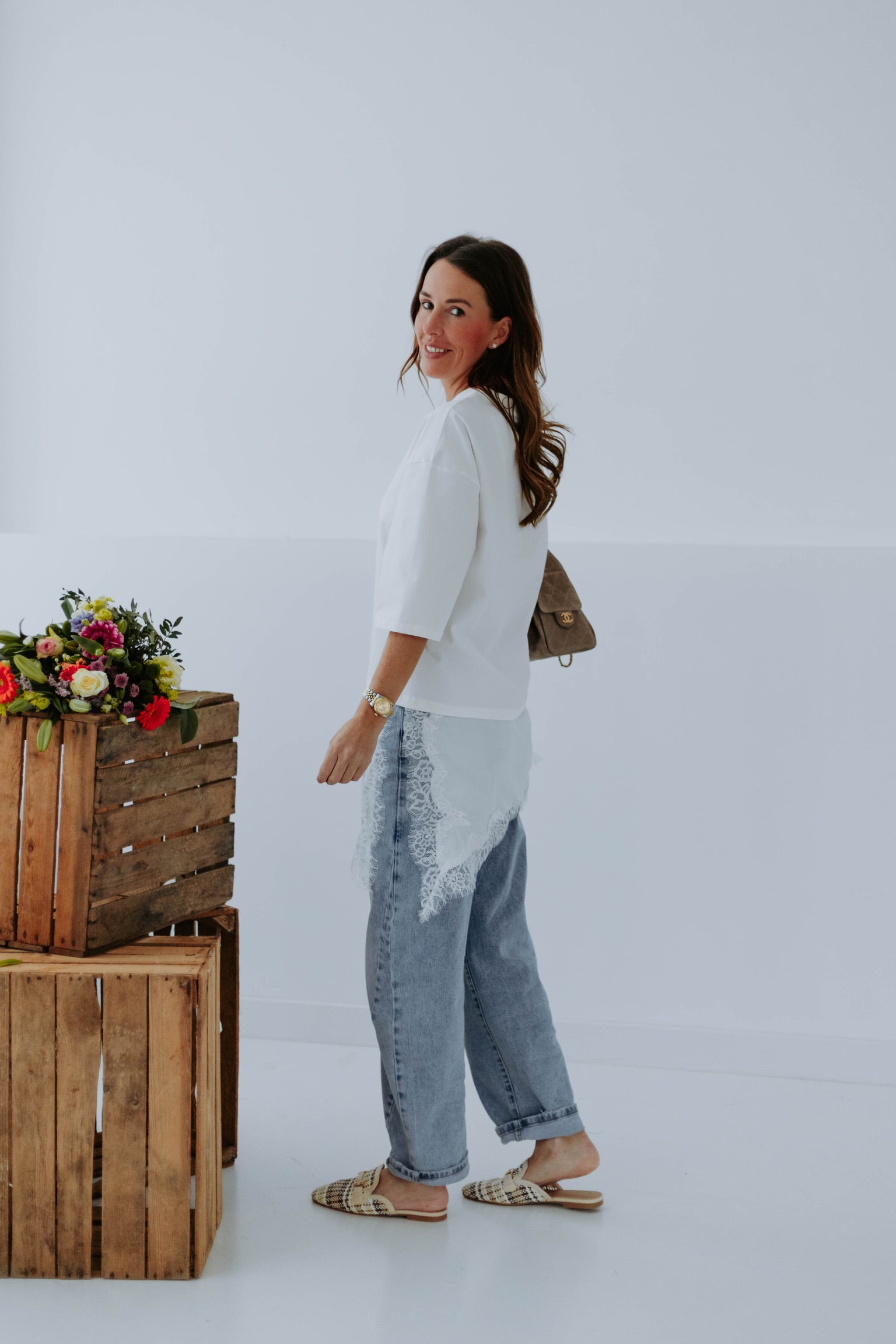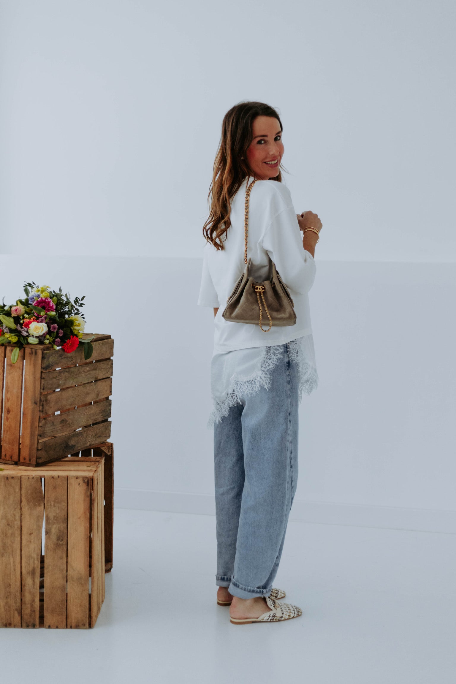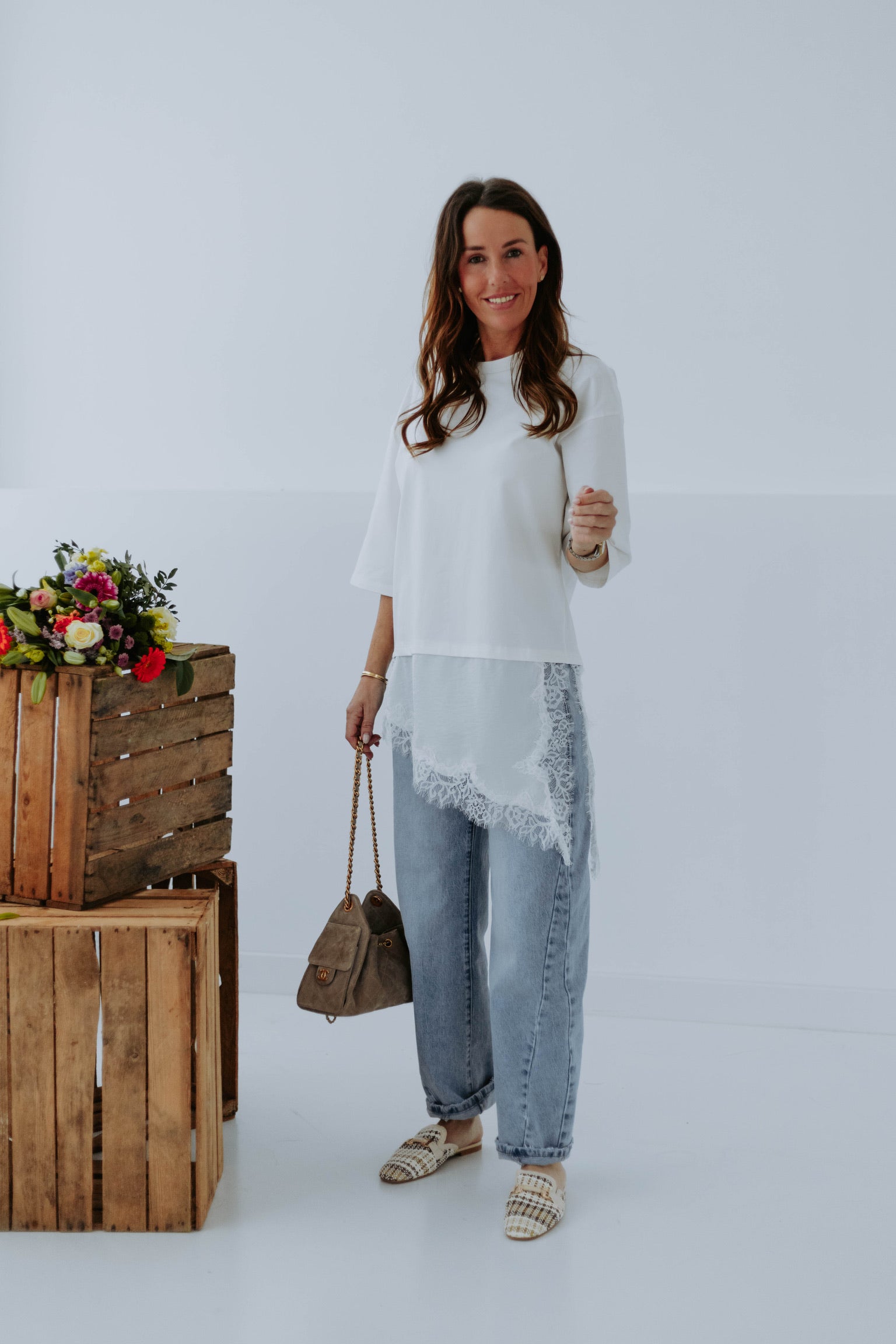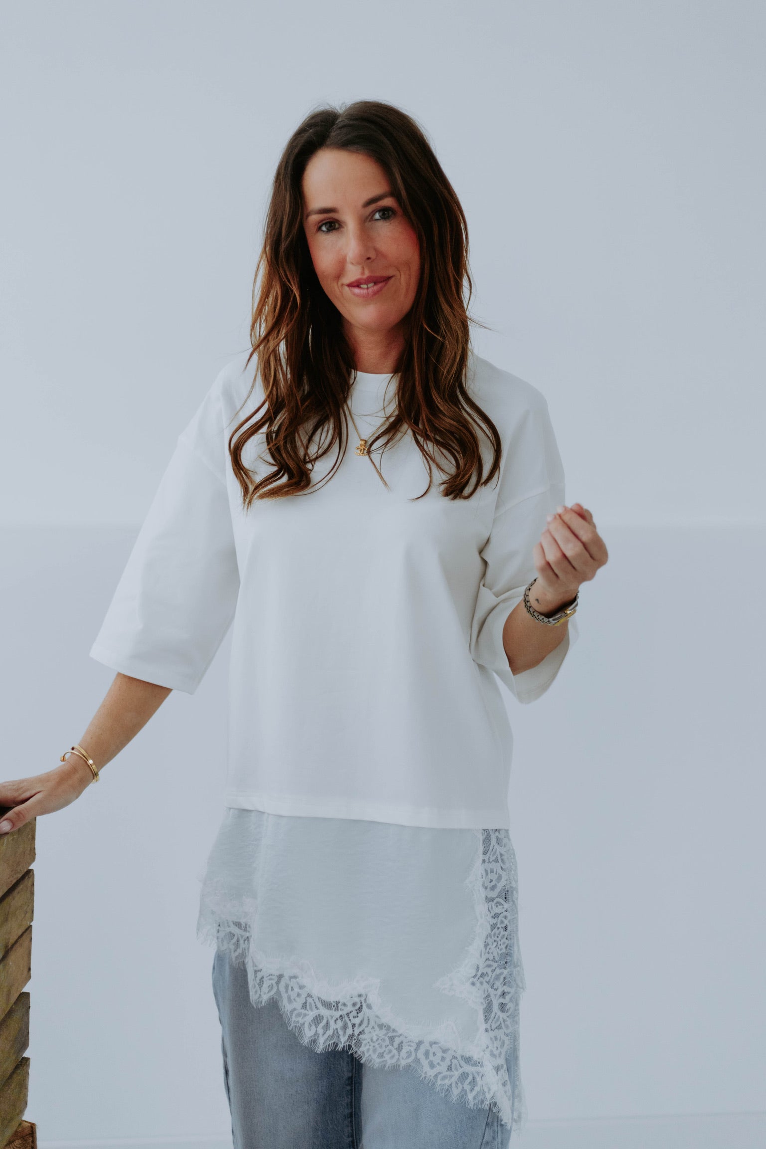 Het lange silhouet in combinatie met de asymmetrische kanten laag geeft een speels en verfijnd effect. Het delicate kant zorgt voor een luchtige, lente-achtige touch terwijl het comfortabel blijft. Perfect om nonchalant op een jeans te dragen en toch een elegante twist toe te voegen.