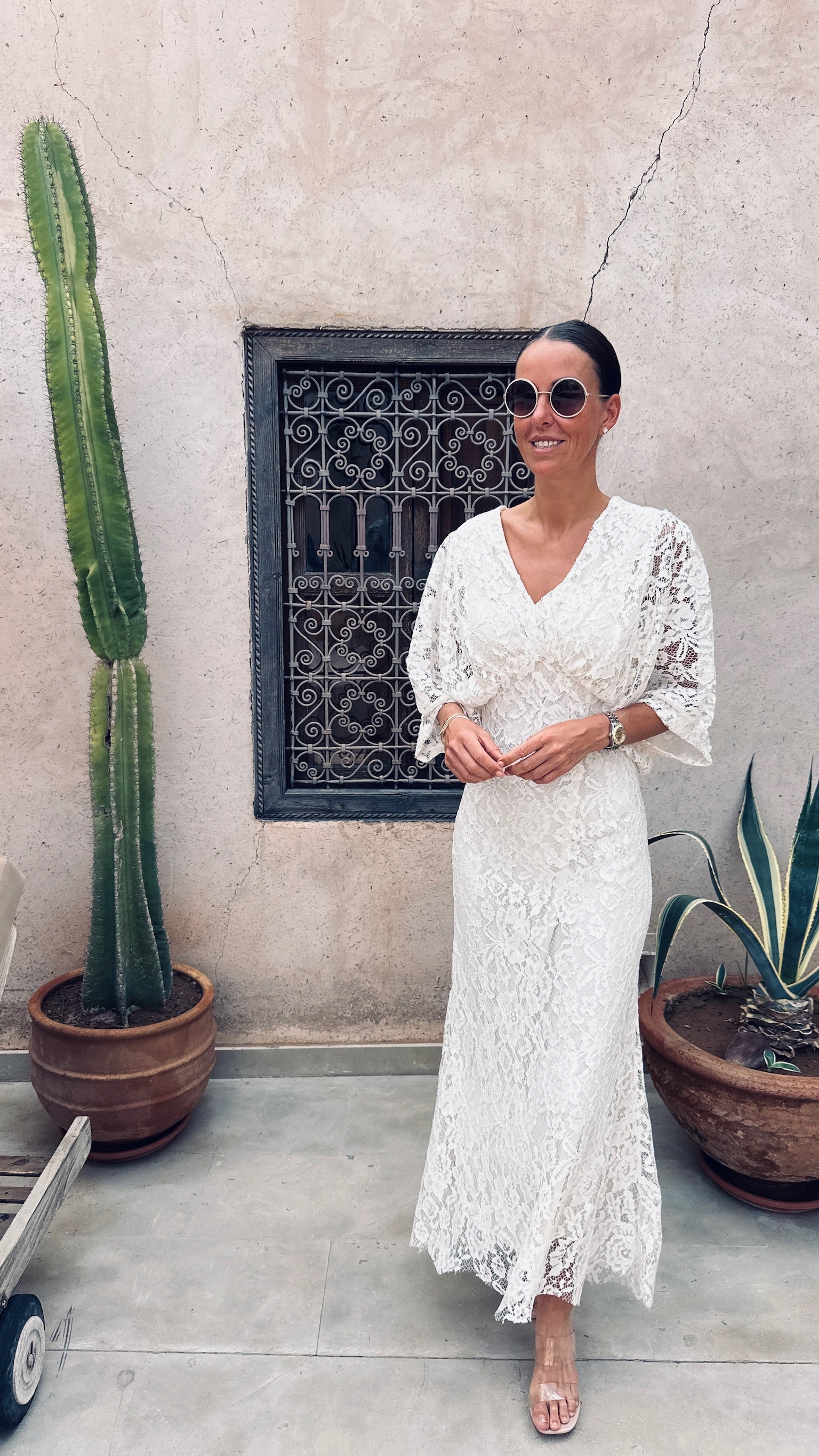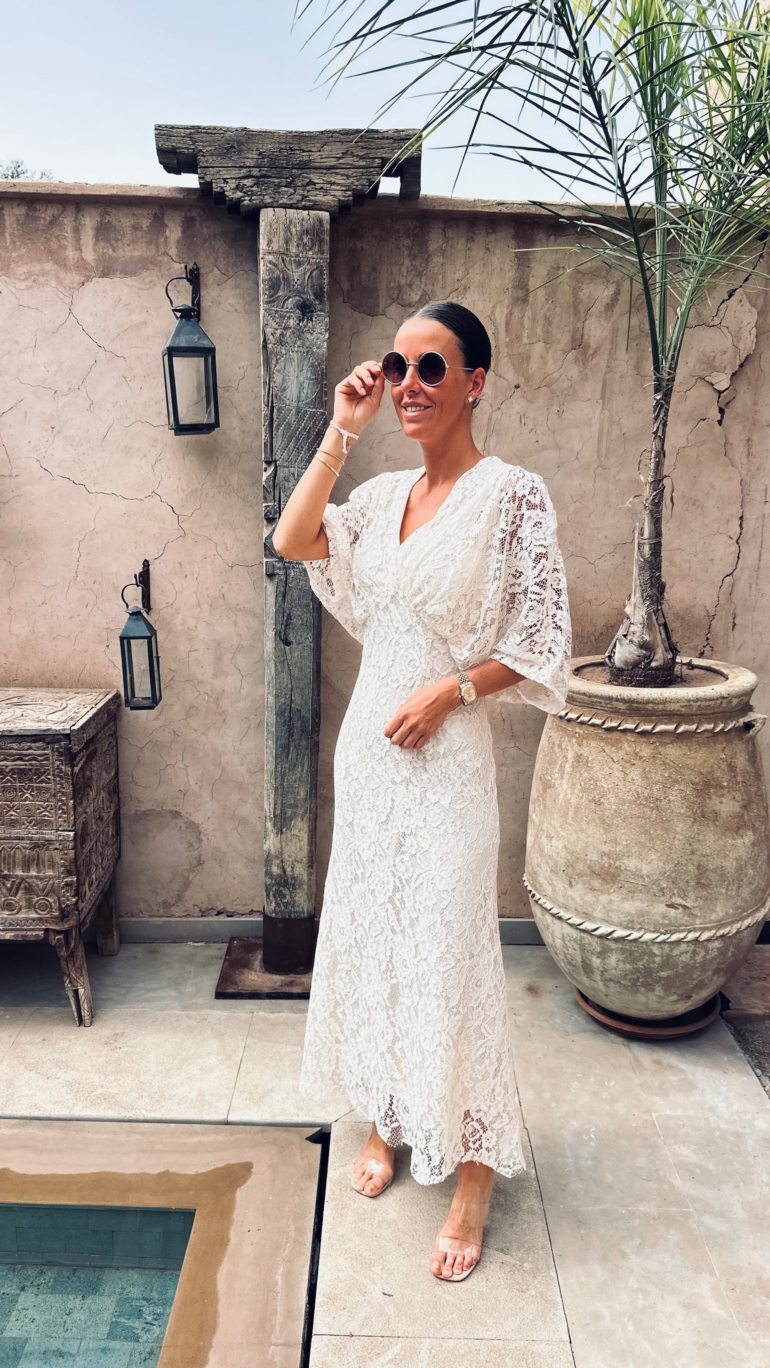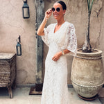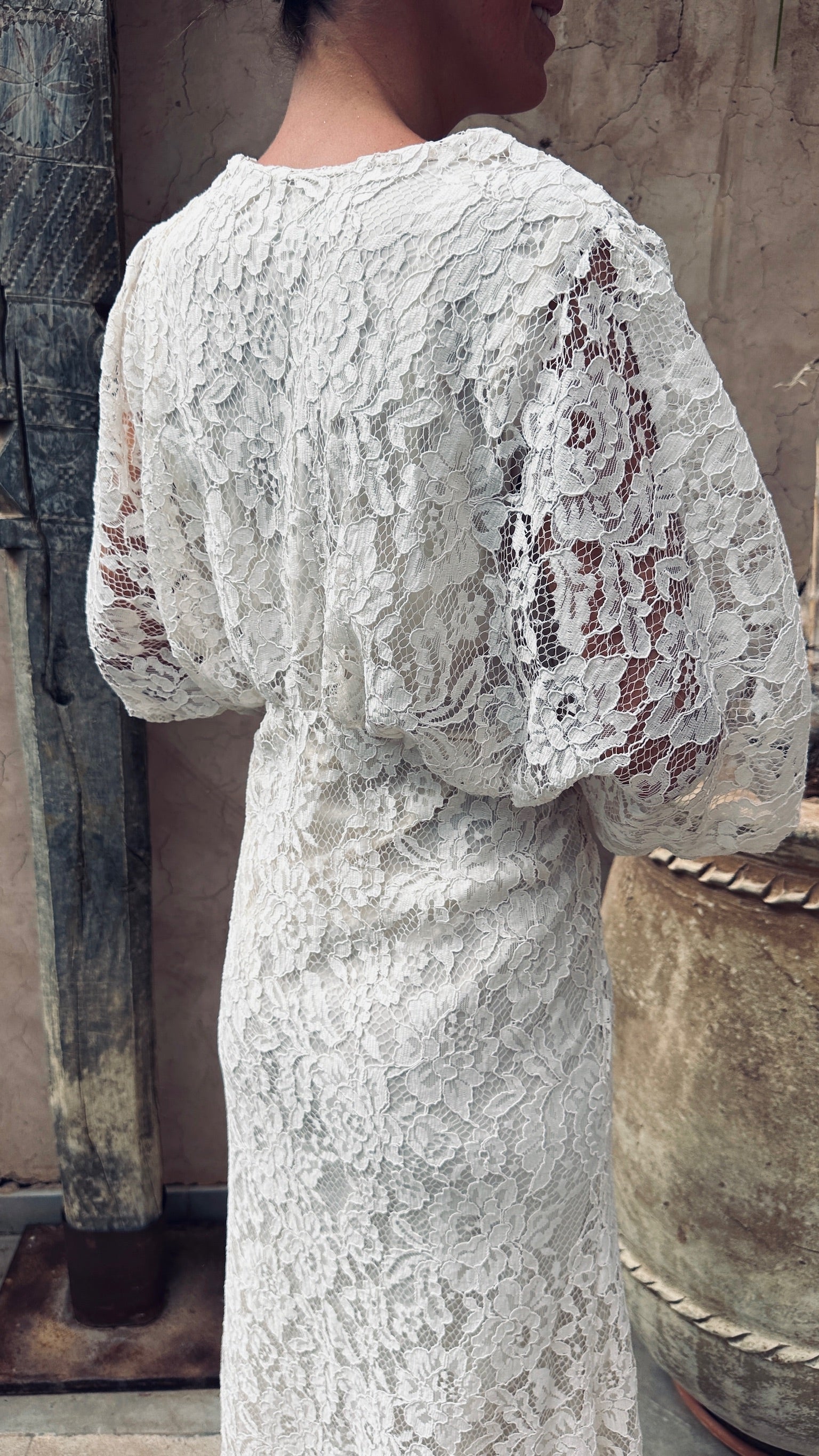 Deze volledig kanten jurk met zwierige mouwen ademt pure elegantie en karakter.