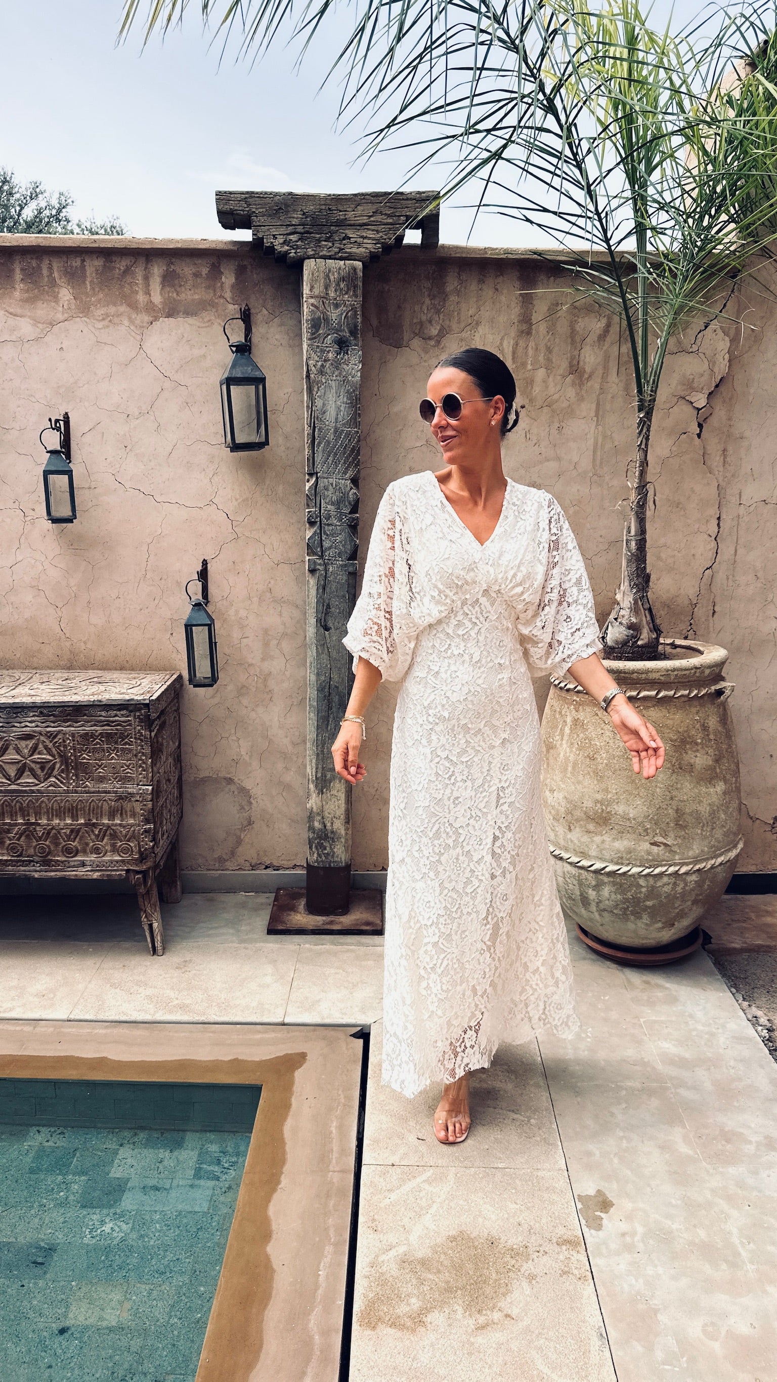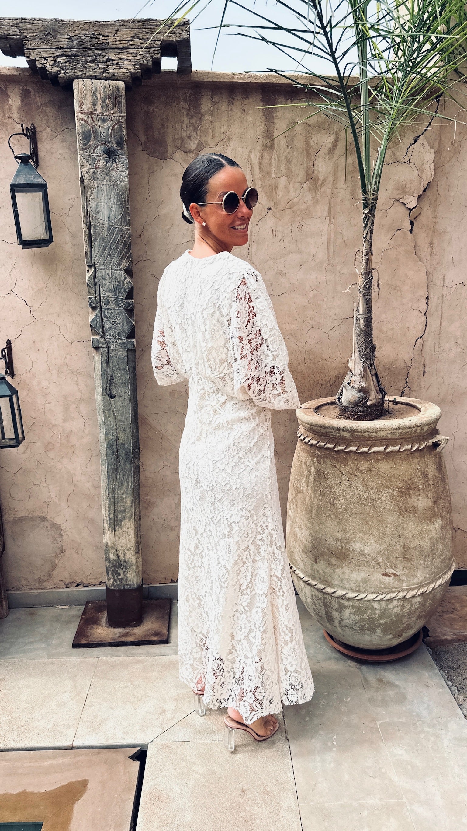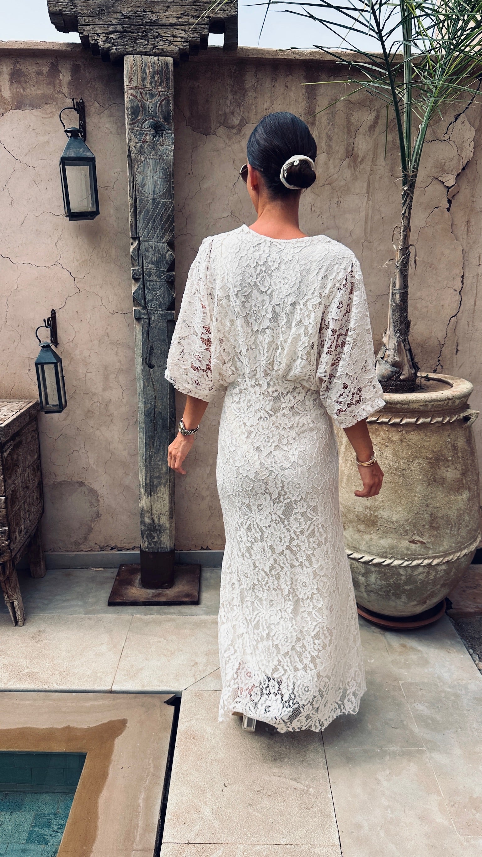 Deze volledig kanten jurk met zwierige mouwen ademt pure elegantie en karakter.