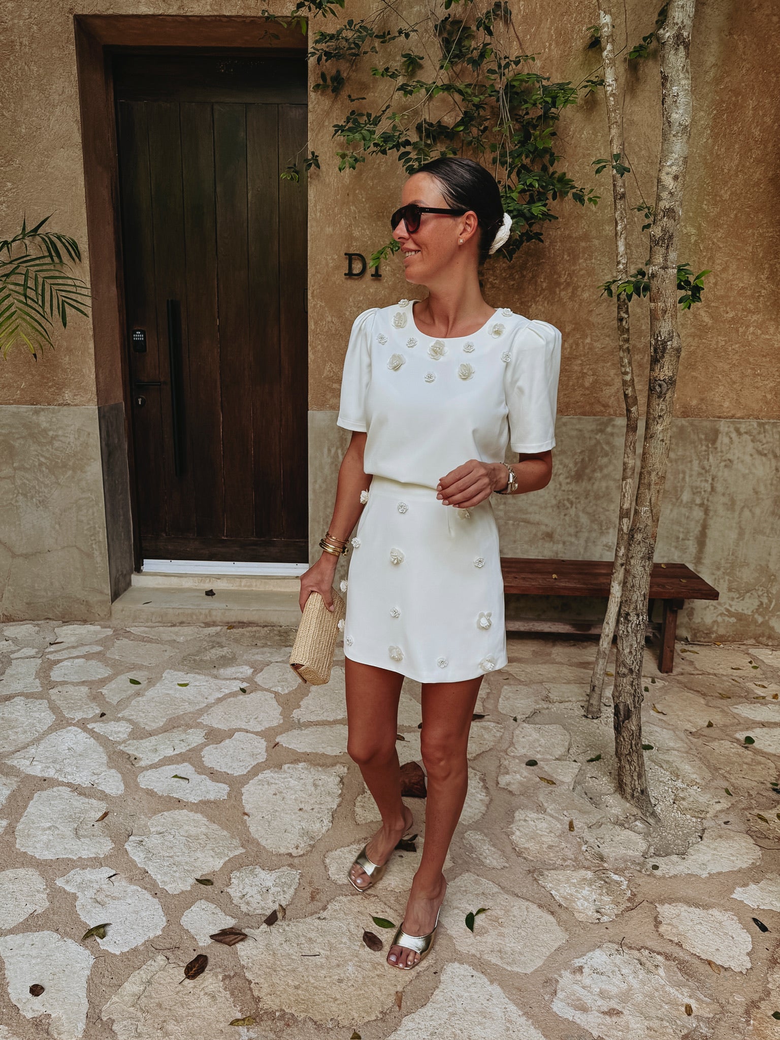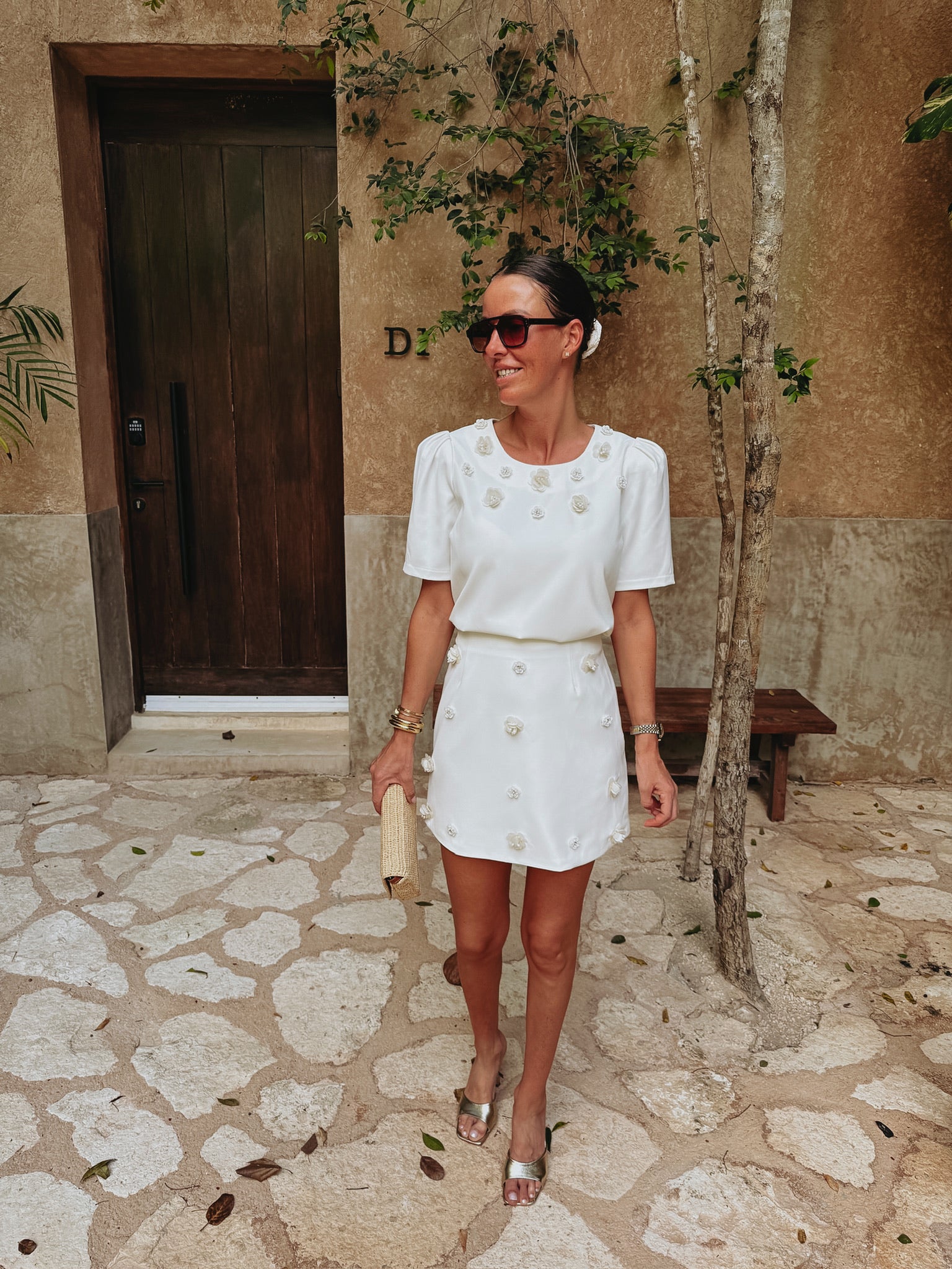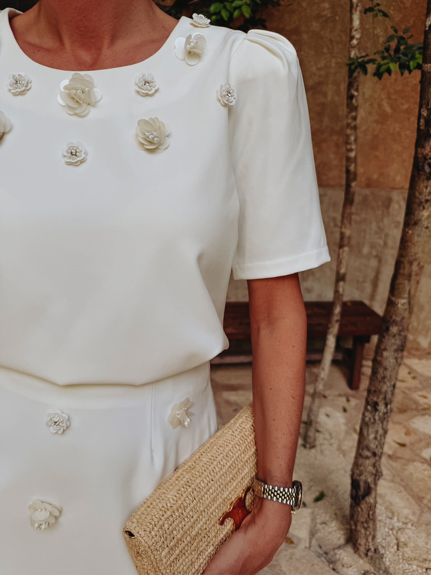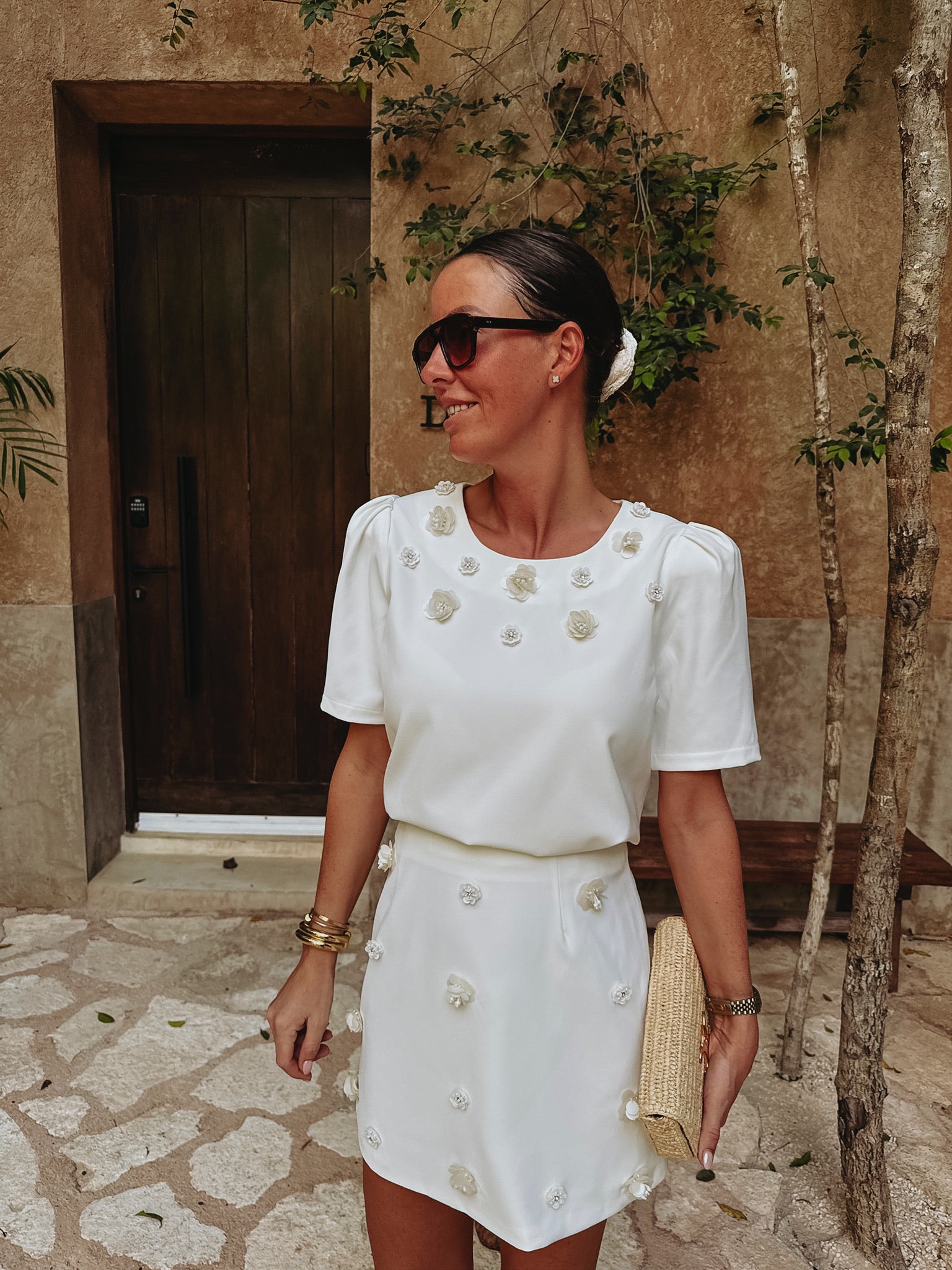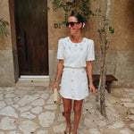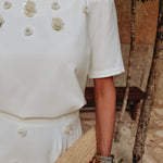 Een frisse witte basis met gehaakte bloemen die verfijnd zijn afgewerkt met parels, wat zorgt voor een subtiele maar bijzondere touch. De korte mouwen geven een luchtige, zomerse uitstraling die perfect past bij zonnige dagen. Mooi te combineren met de bijpassende rok voor een complete look, maar ook eenvoudig te dragen als opvallend stuk op zichzelf.