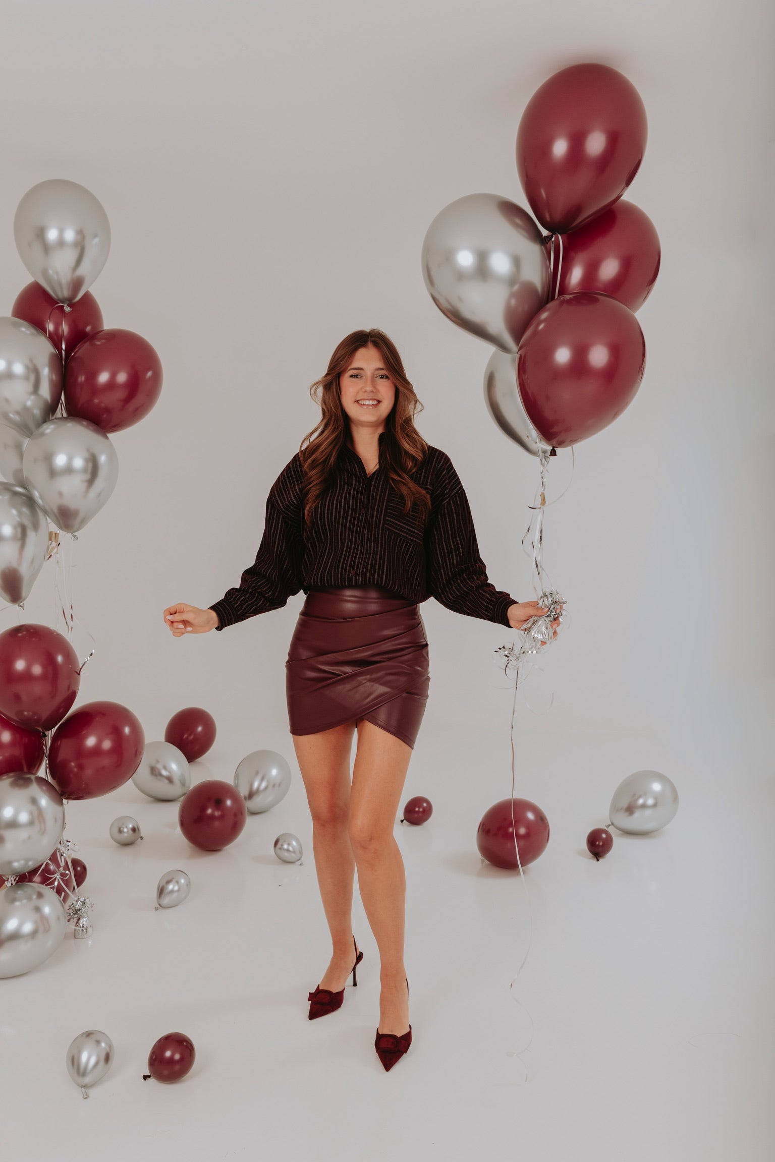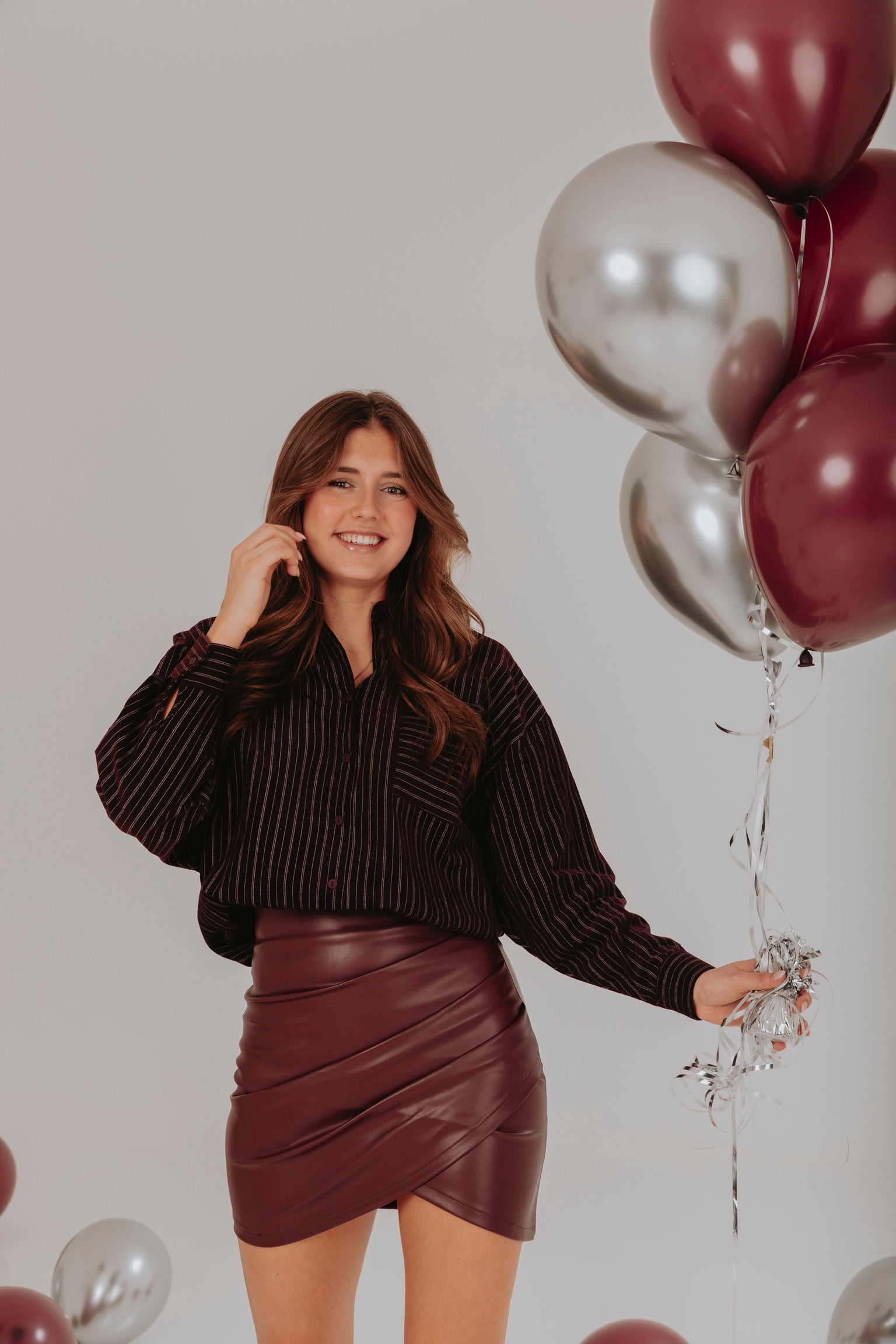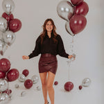 Deze rok straalt pure elegantie en kracht uit dankzij de diepe bordeauxrode tint en de verfijnde lederlook. Een feestelijke eyecatcher die elke outfit meteen een glamoureuze en zelfverzekerde uitstraling geeft.