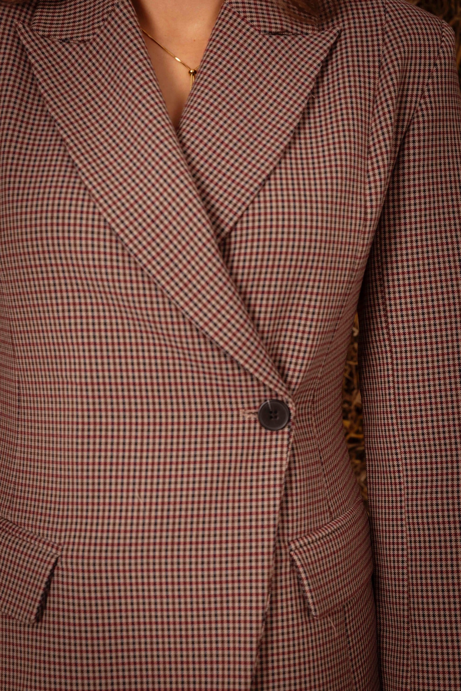 Een getailleerd model met een klassiek ruitdessin dat moeiteloos charme en structuur brengt in je herfstgarderobe. Draag over een knit of met denim voor een look die zowel tijdloos als eigentijds aanvoelt.