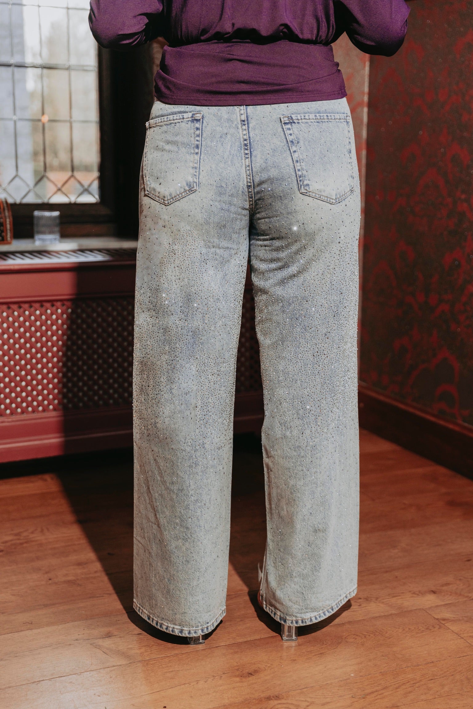Een losse, wide leg jeans in een frisse lichtblauwe tint die een speelse en feestelijke touch krijgt door subtiele steentjes. Het comfortabele model beweegt mee en geeft een ontspannen maar stijlvolle uitstraling. Perfect om tijdens de feestdagen casual chic en sprankelend voor de dag te komen.