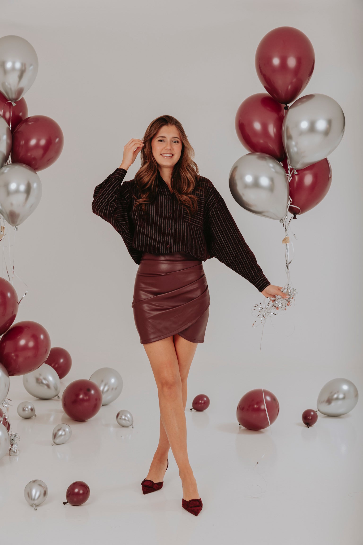 Deze blouse combineert een rijke bordeauxrode kleur met subtiele glanzende strepen voor een luxueuze en feestelijke look. Het luchtige model geeft elke outfit een sprankelende en elegante uitstraling, perfect voor bijzondere momenten.