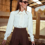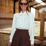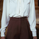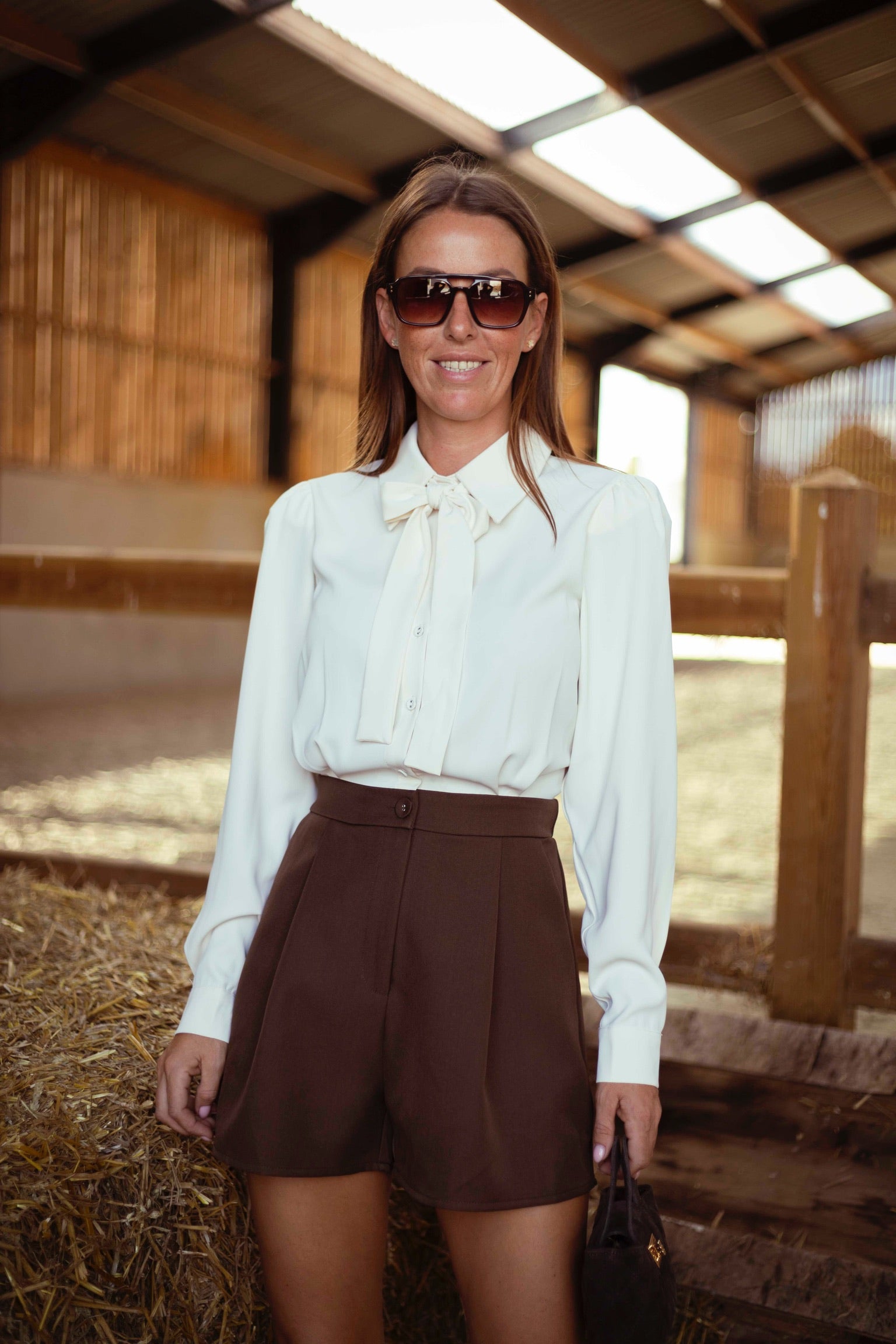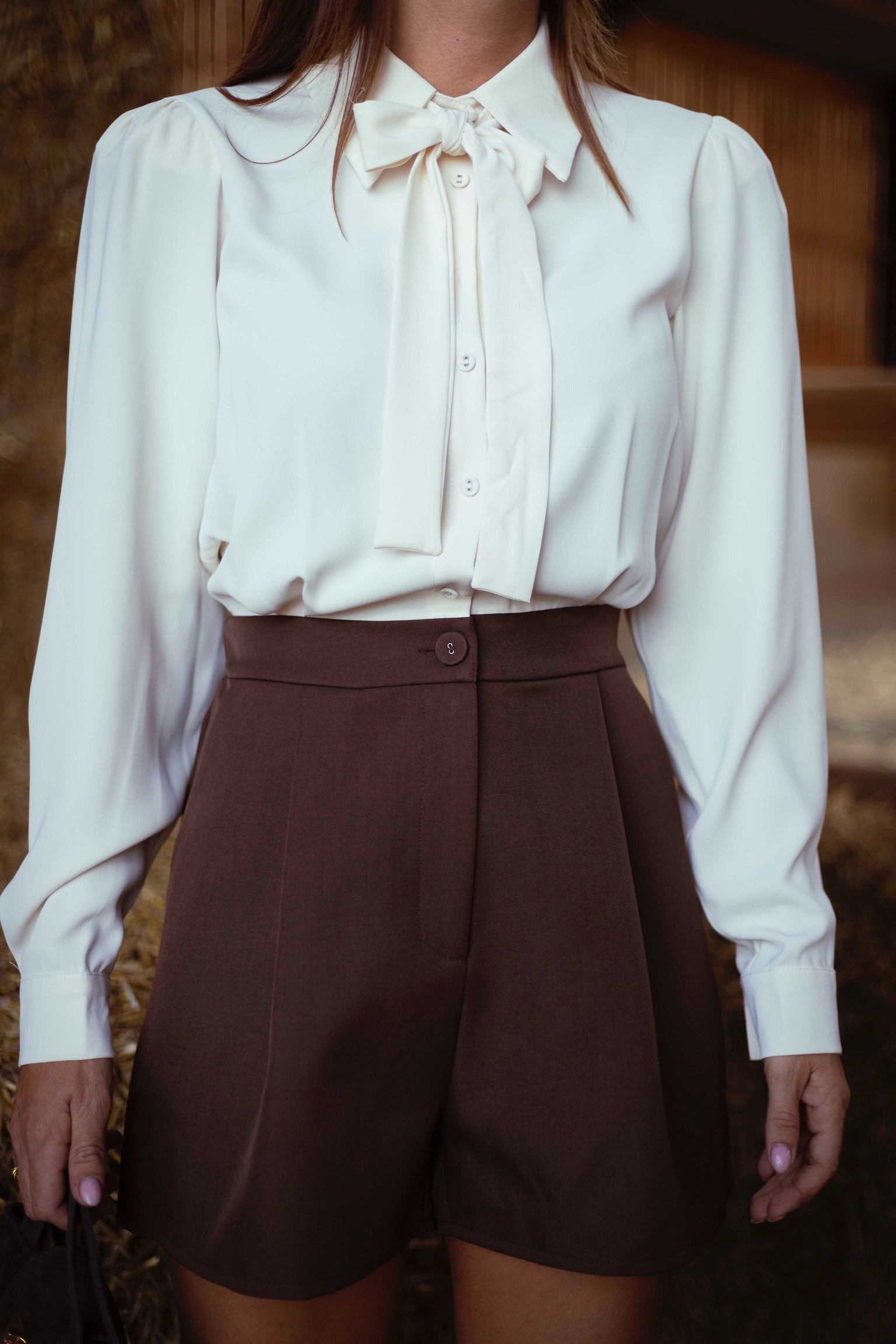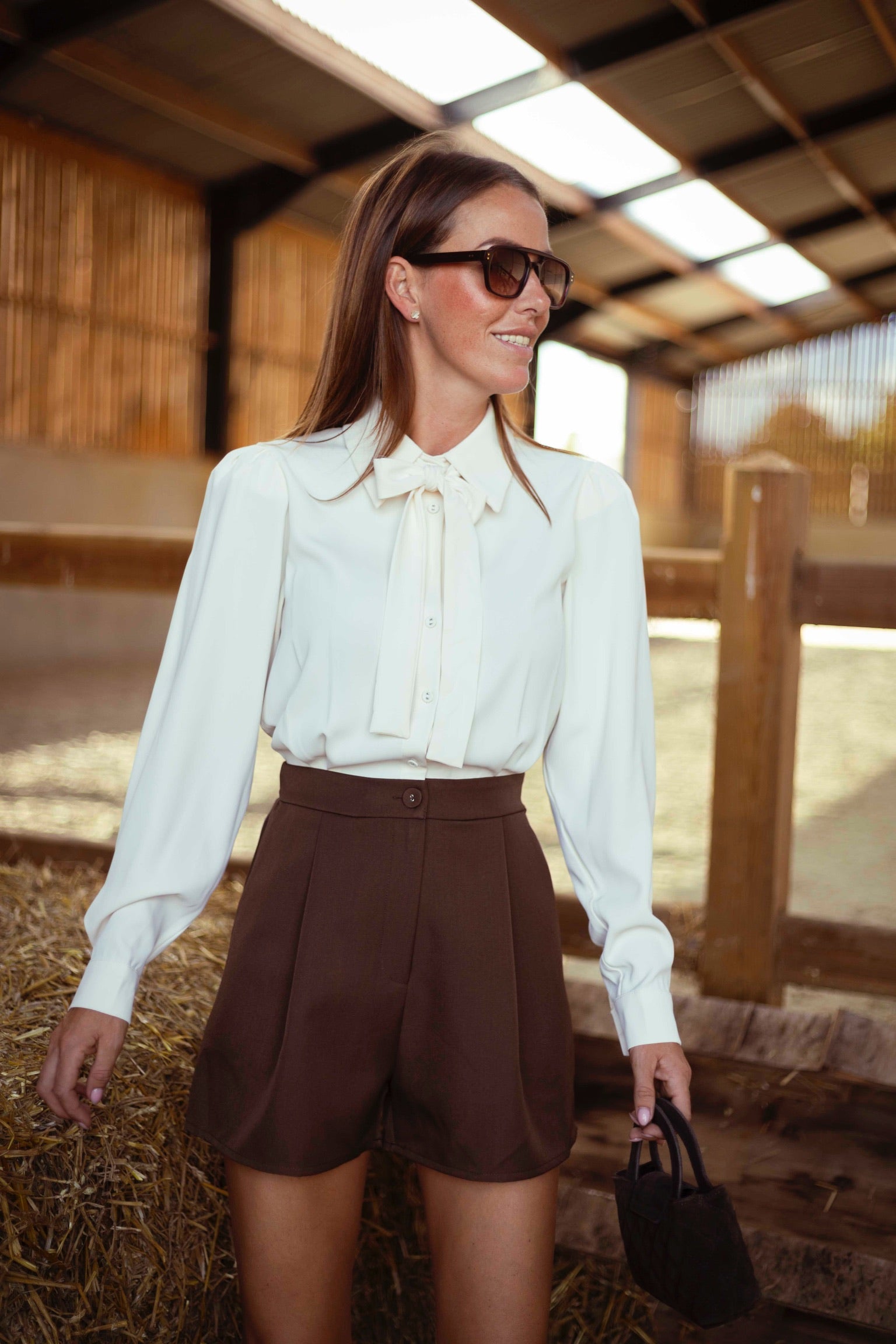 Speels én stijlvol in één: deze combinatie van ecru en bruin oogt als een blouse en short, maar zit als één geheel. Gemaakt voor vroege herfstdagen waarop je nog nét zonder jas naar buiten kunt.
