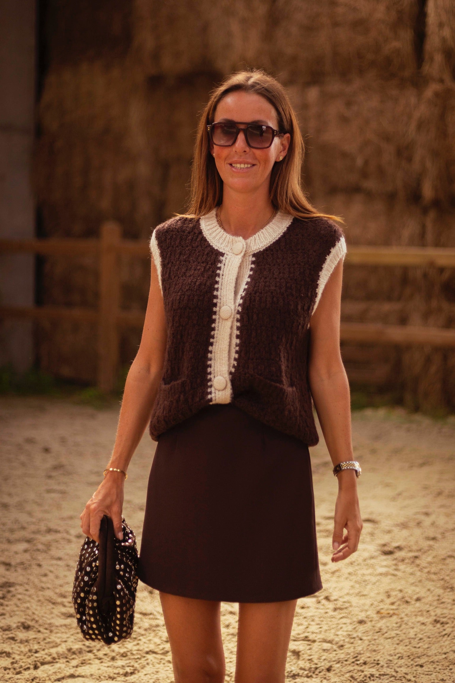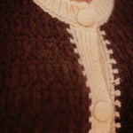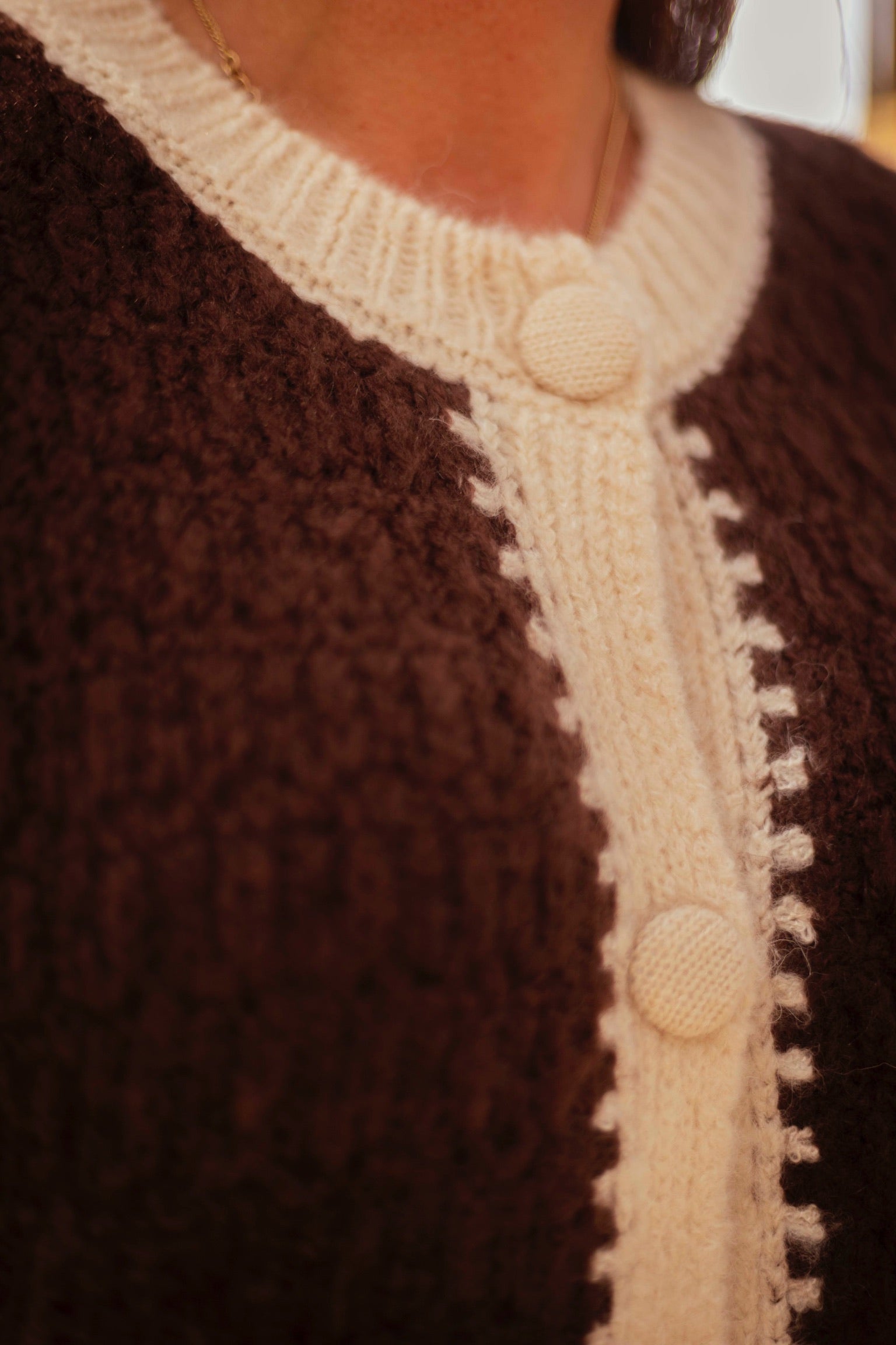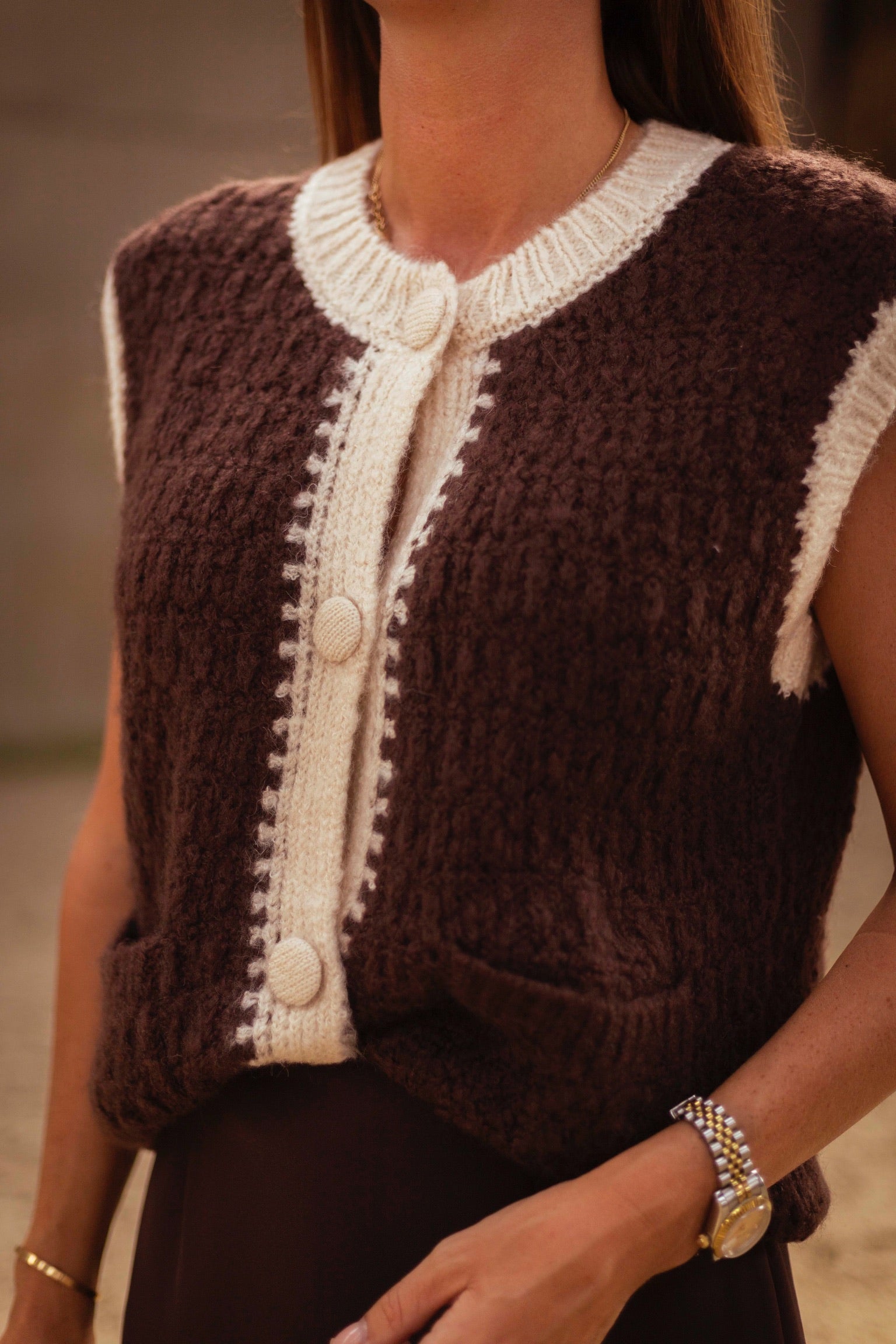 Een mouwloze cardigan in ecru en bruin die warmte en stijl combineert. De grote knopen geven dit veelzijdige stuk een stoere en opvallende touch.
