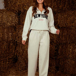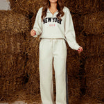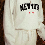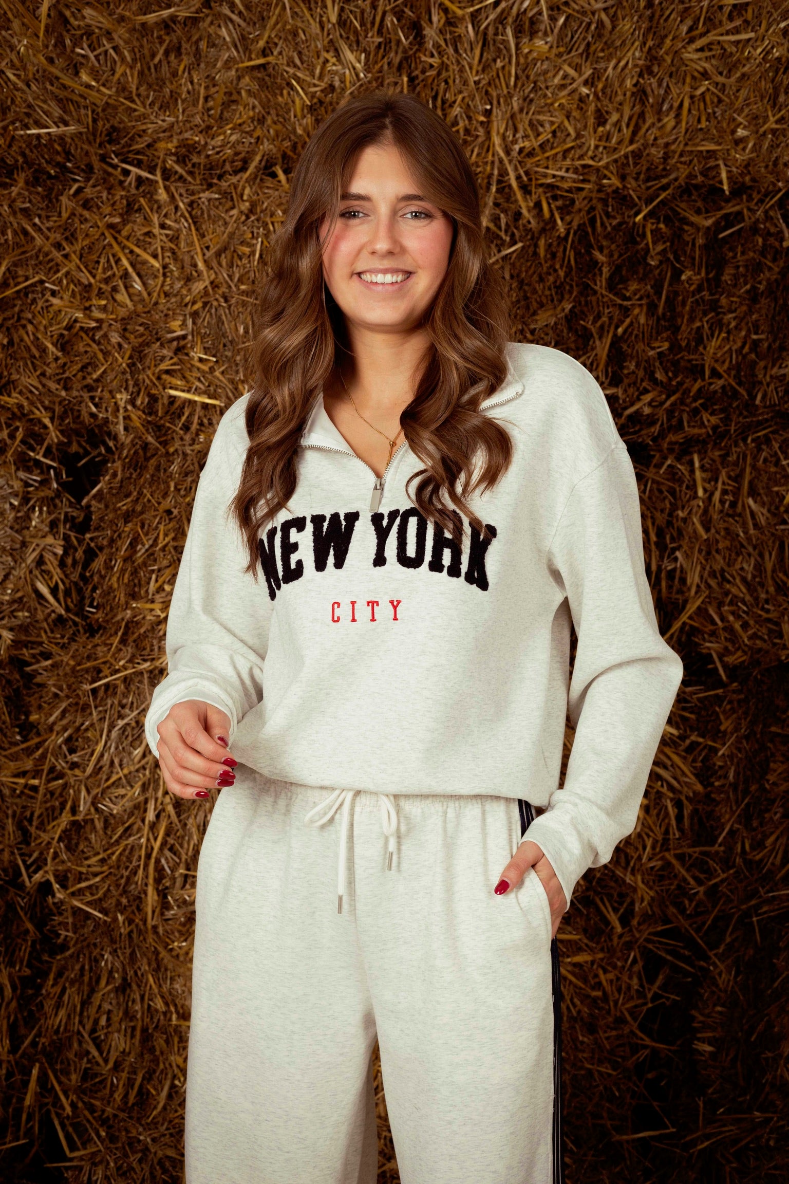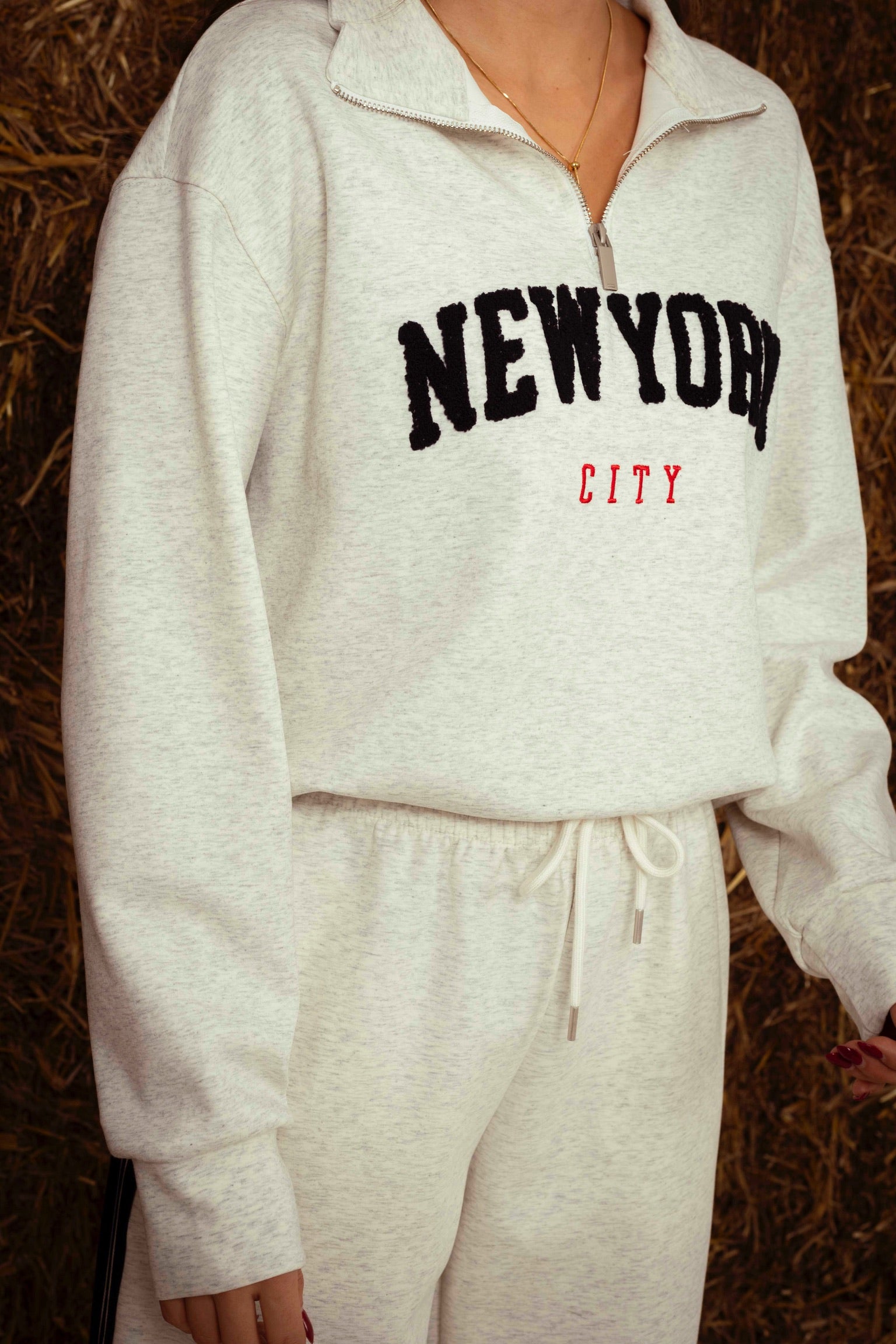 Een comfortabele grijstint die uitnodigt tot ontspannen dagen met een urban touch. De opvallende New York print op de trui en de strepen langs de broek geven het geheel een sportieve uitstraling met een frisse herfstvibe.