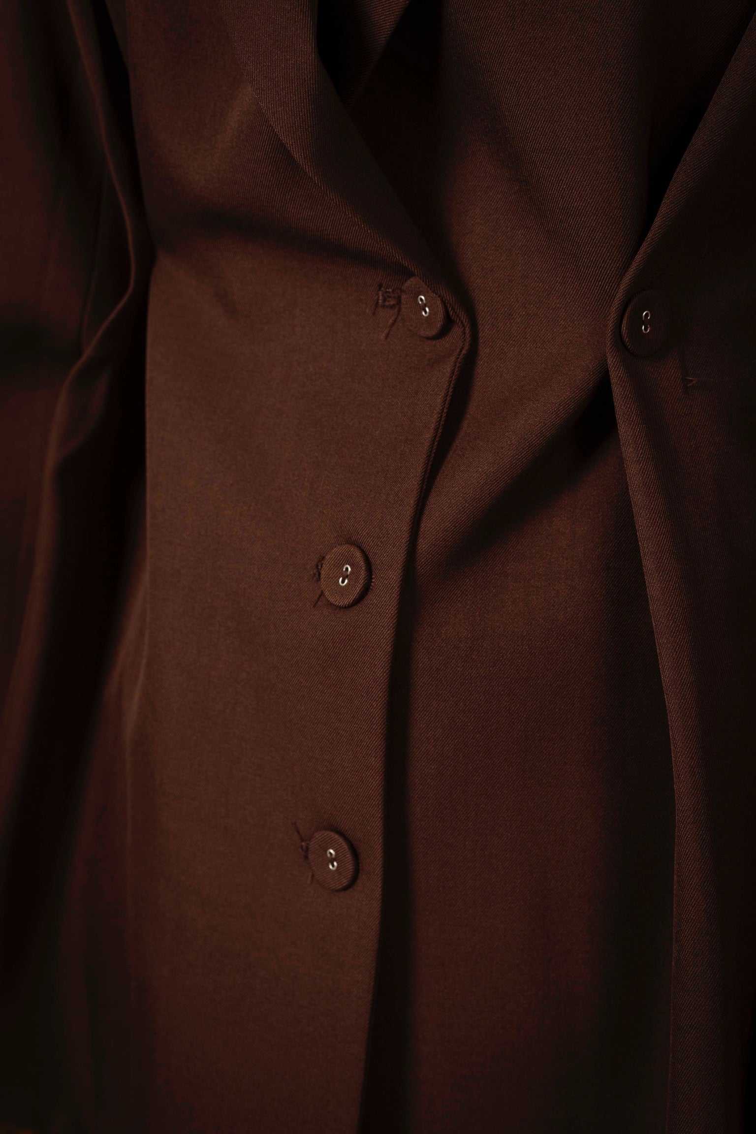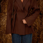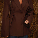 Een uitgesproken silhouet in warme bruintint dat elegantie en kracht moeiteloos combineert. De verfijnde knoopjes en nauw aansluitende taille zorgen voor een vrouwelijke vorm die deze blazer allesbehalve alledaags maakt.