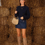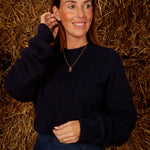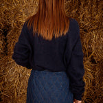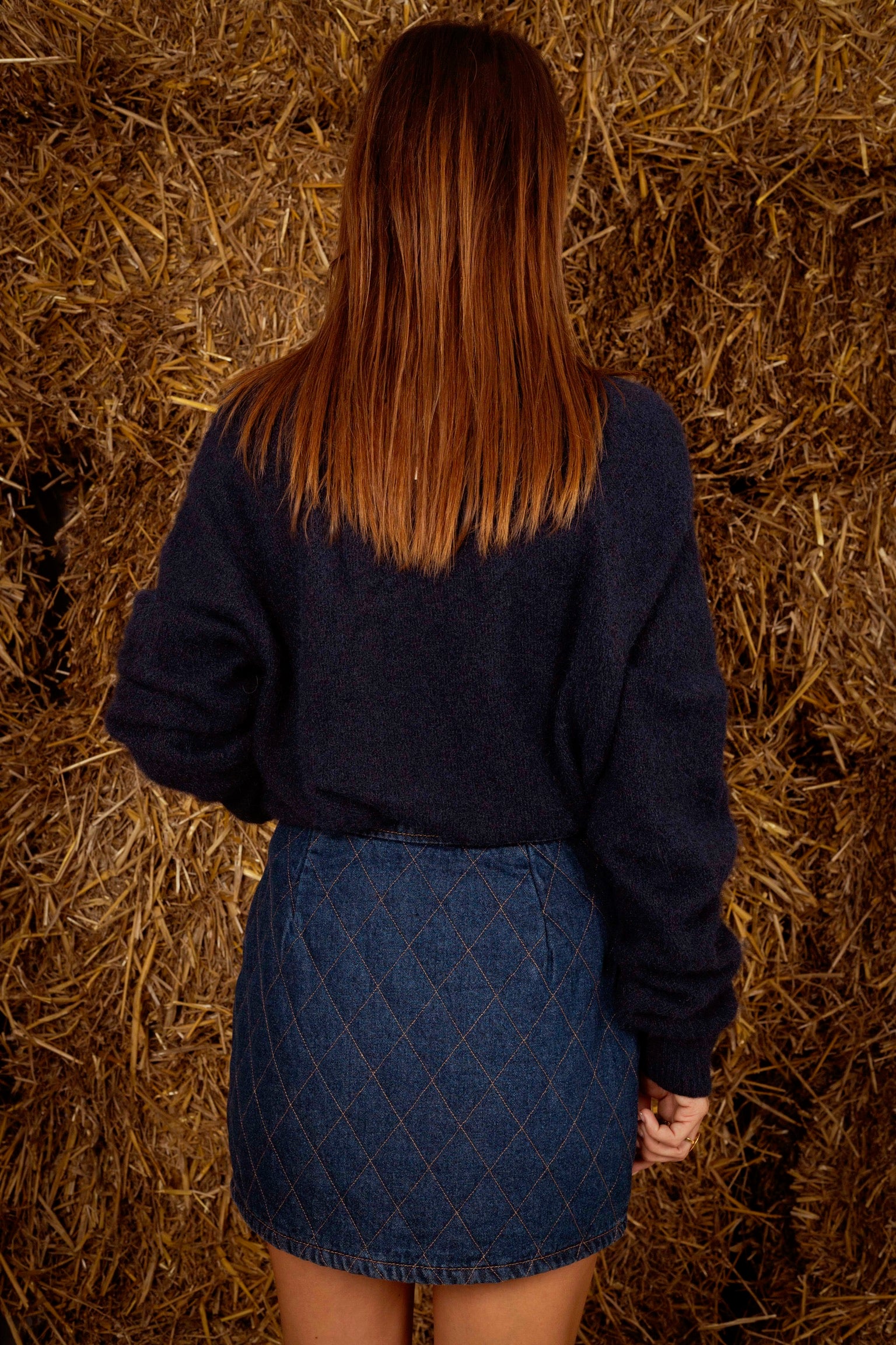Een warme, grofgebreide trui in blauwe tinten, ideaal om de kou van het herfstseizoen tegen te gaan. Comfortabel en stoer, makkelijk te combineren met je favoriete jeans of rok.