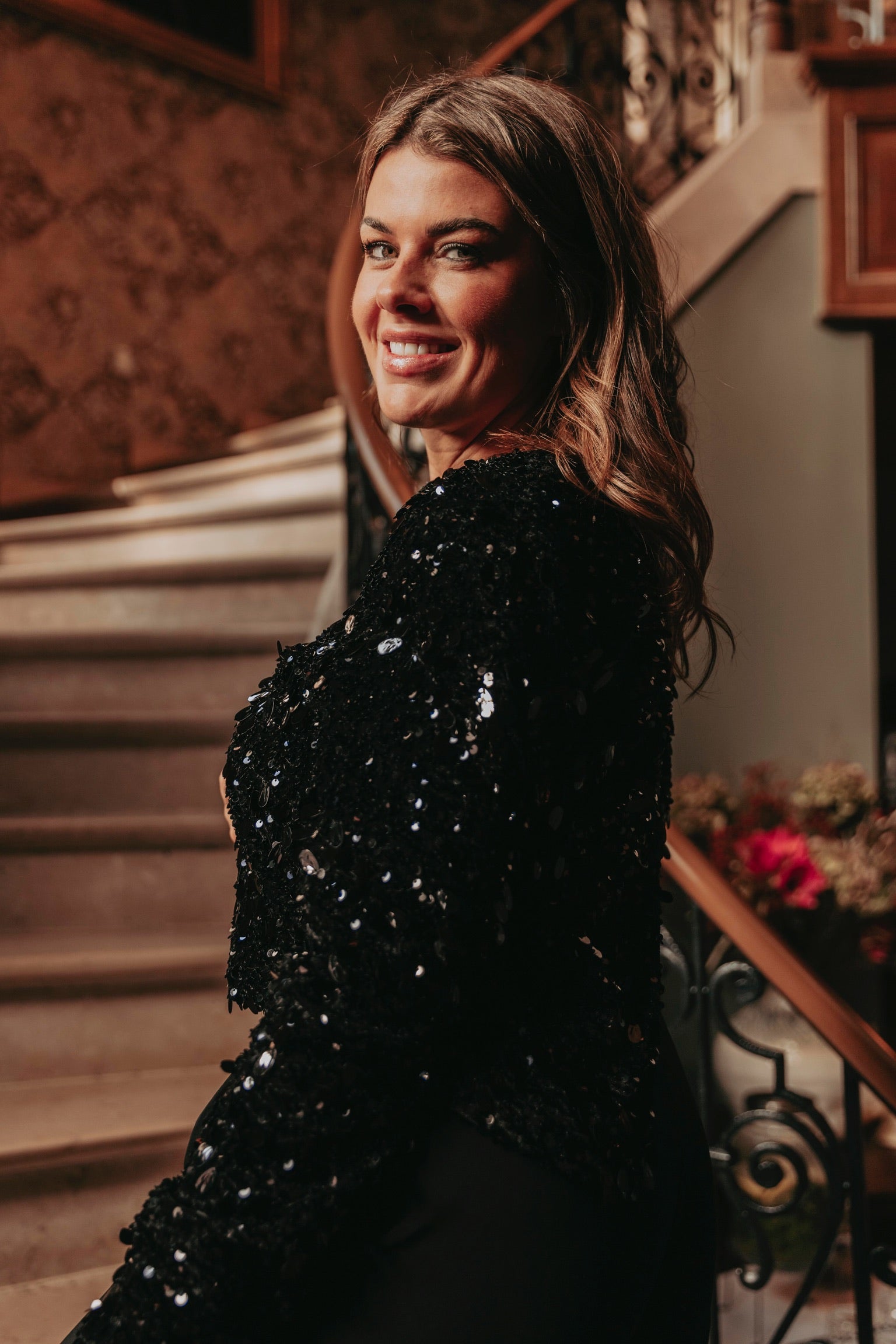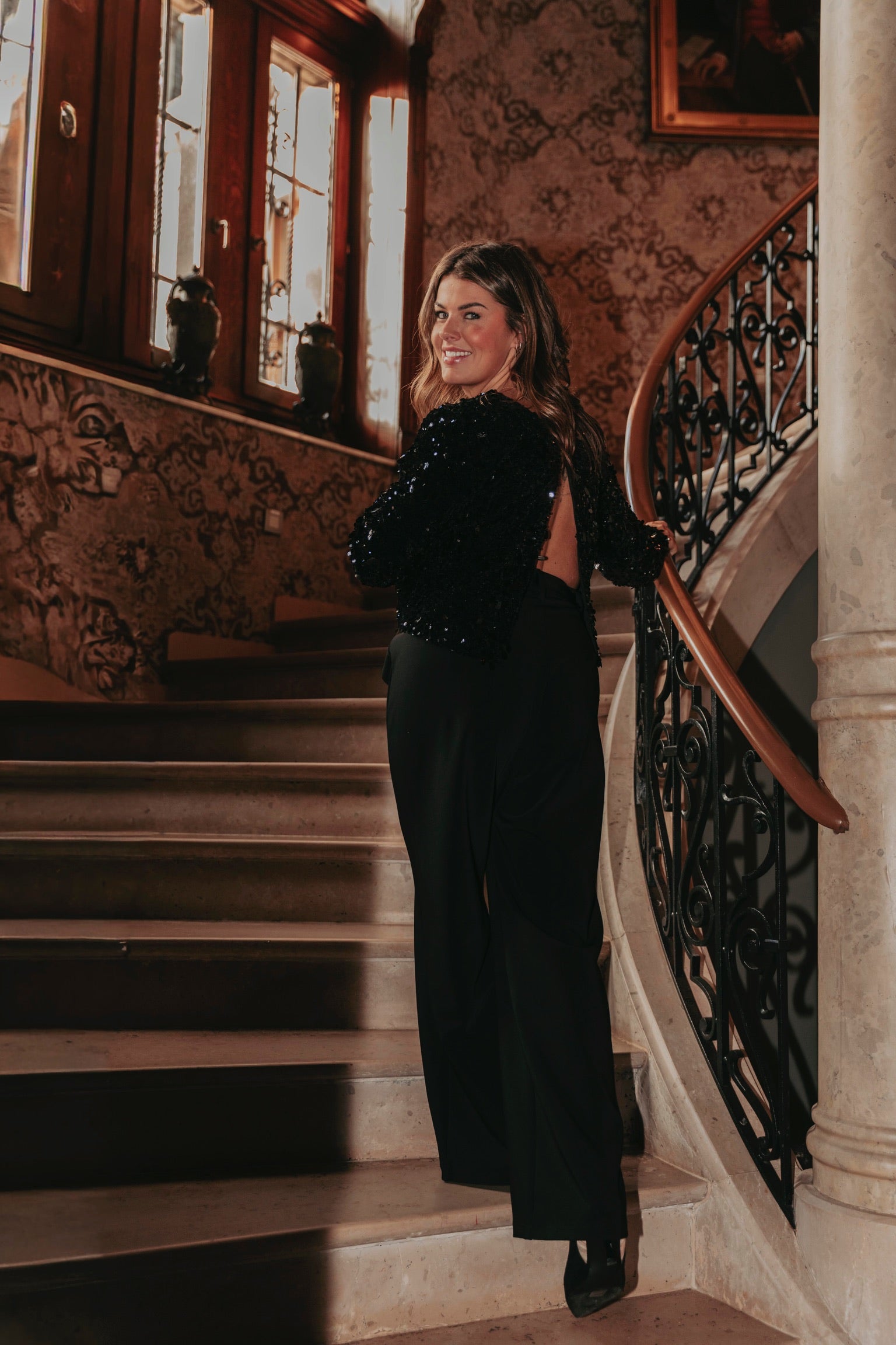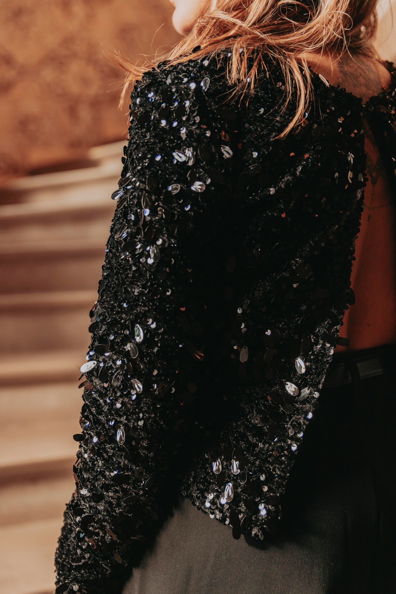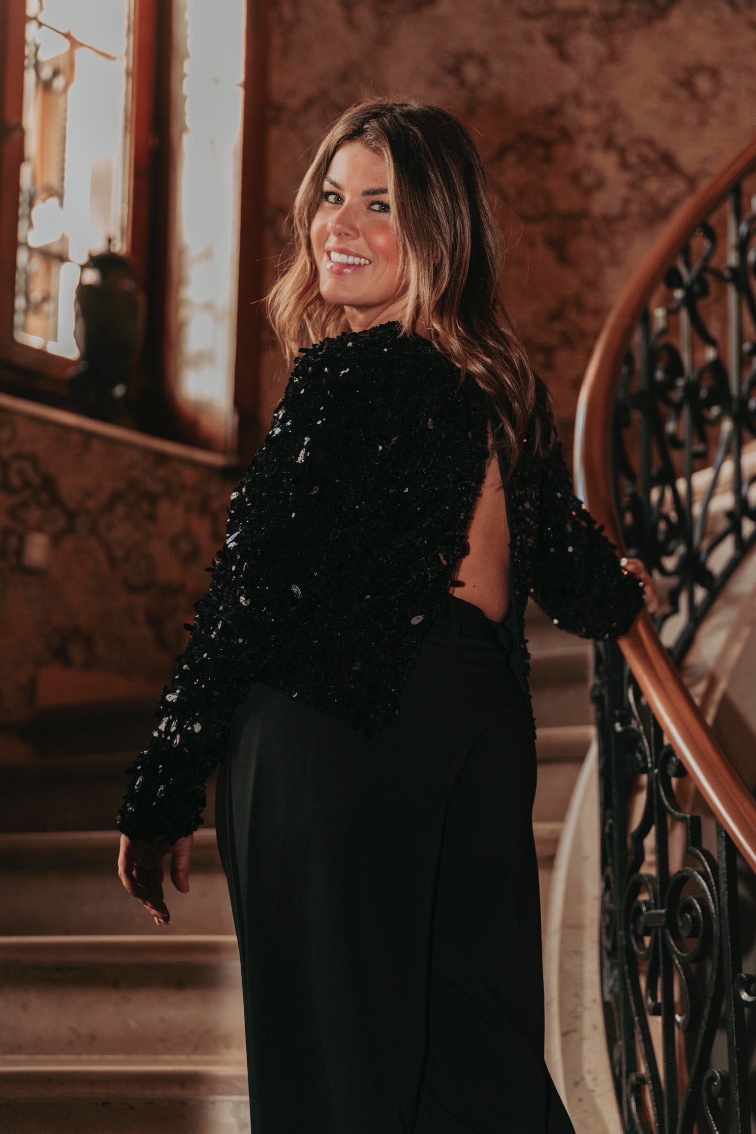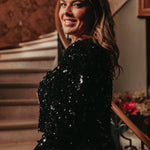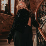 Een feestelijke zwarte blouse met een opvallende open rug die direct glamour uitstraalt. De sequins laten elke beweging sprankelen en geven een energieke, levendige touch. Perfect om tijdens de feestdagen stijlvol en vol zelfvertrouwen te stralen.