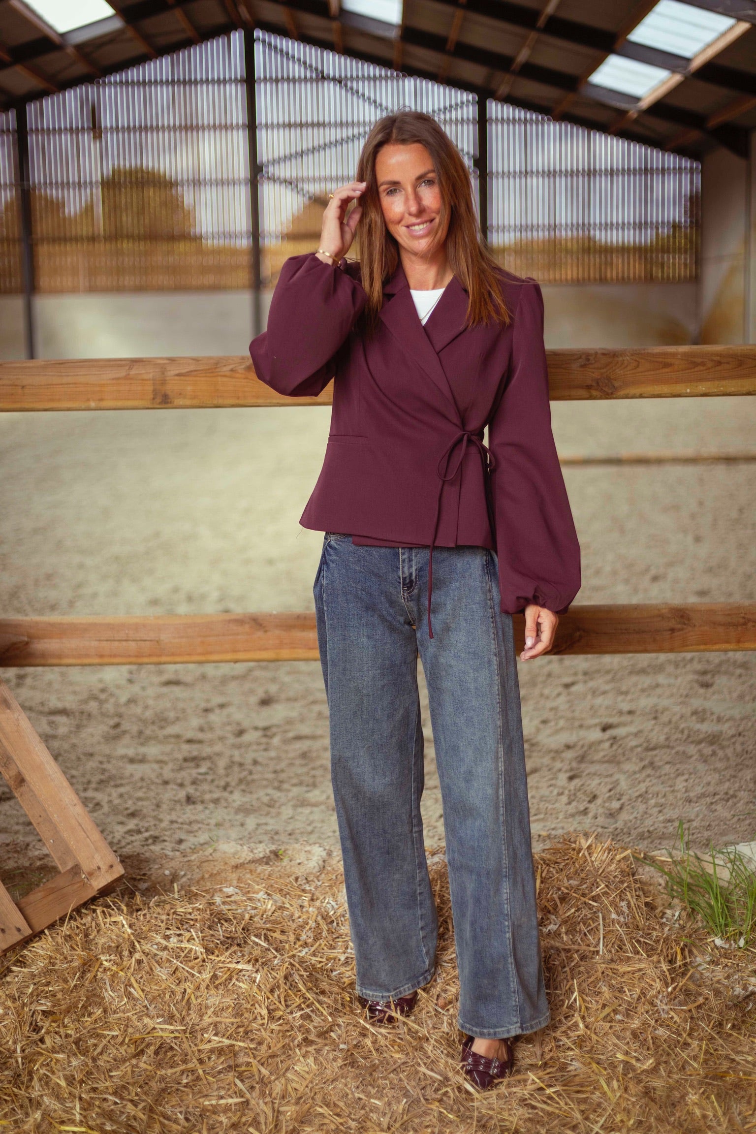 Deze blazer met wikkelstijl en een striklint geeft je herfstoutfit een vrouwelijke en speelse touch. Met de verstelbare sluiting bepaal je zelf de pasvorm, ideaal voor een elegante en comfortabele look.