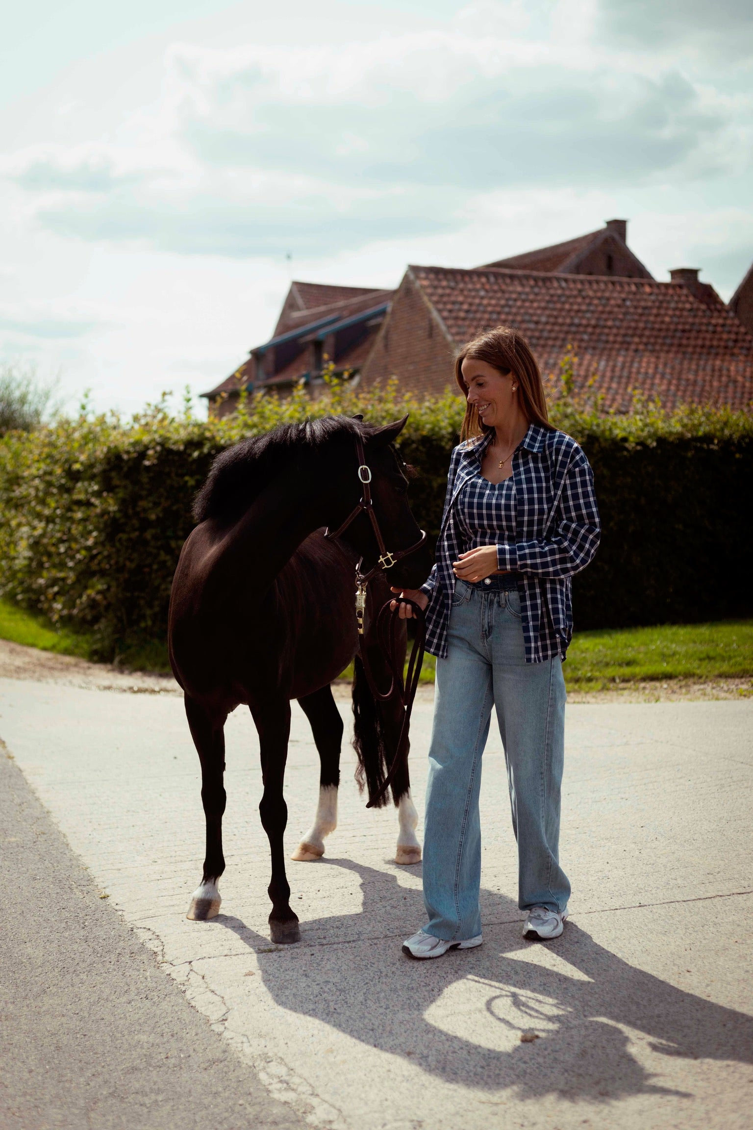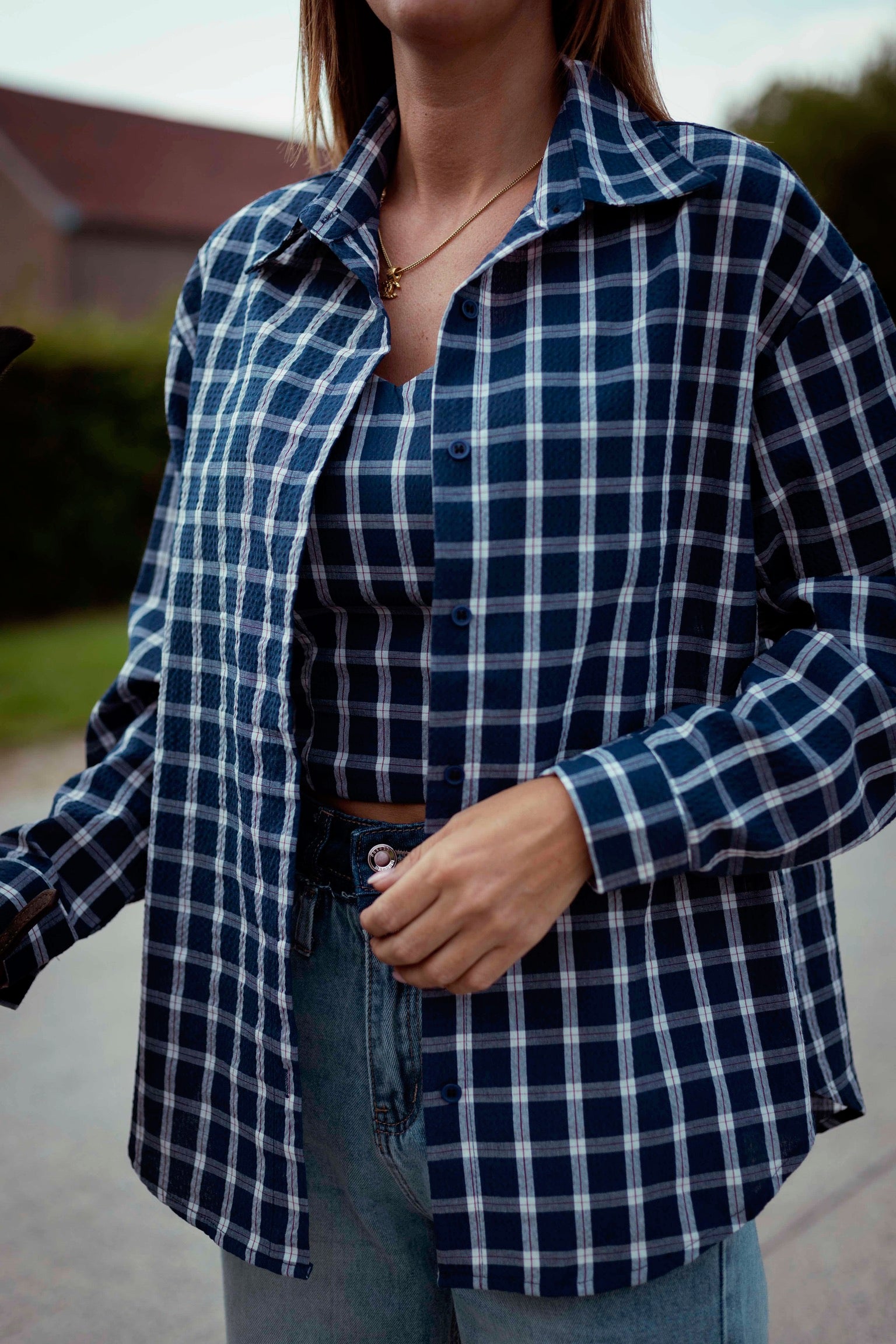 Deze donkerblauwe geruite blouse komt met een perfect bijpassende top, waardoor je meteen een complete en stijlvolle set hebt. Ideaal voor de herfst, of je hem nu losjes open draagt of dichtgeknoopt voor extra warmte.