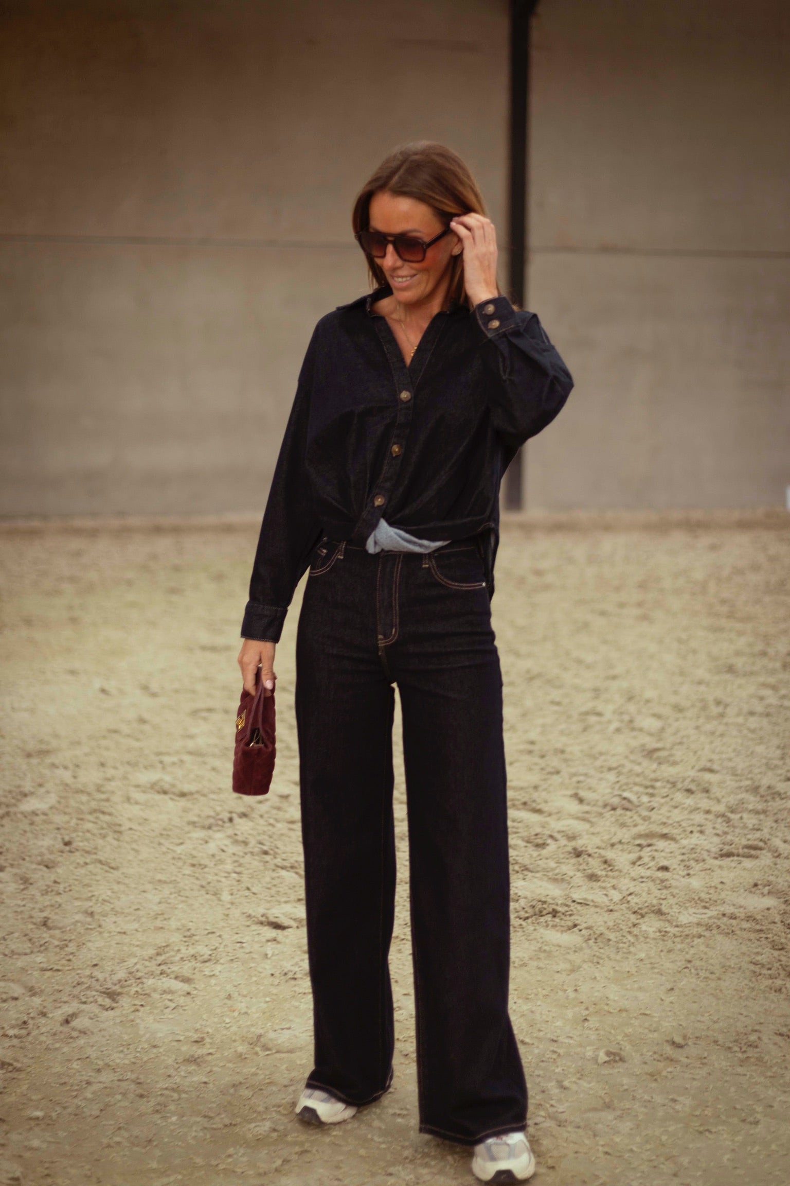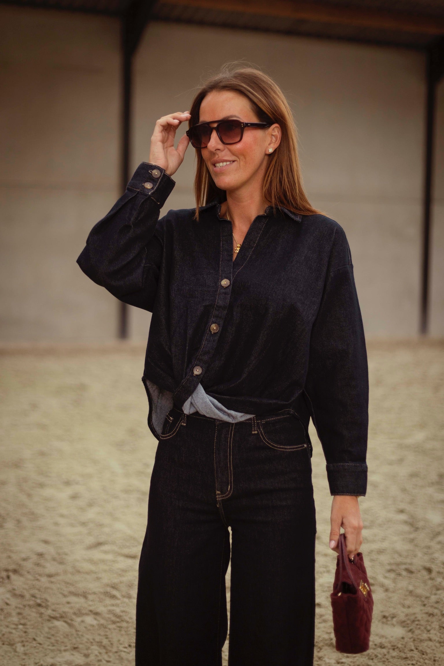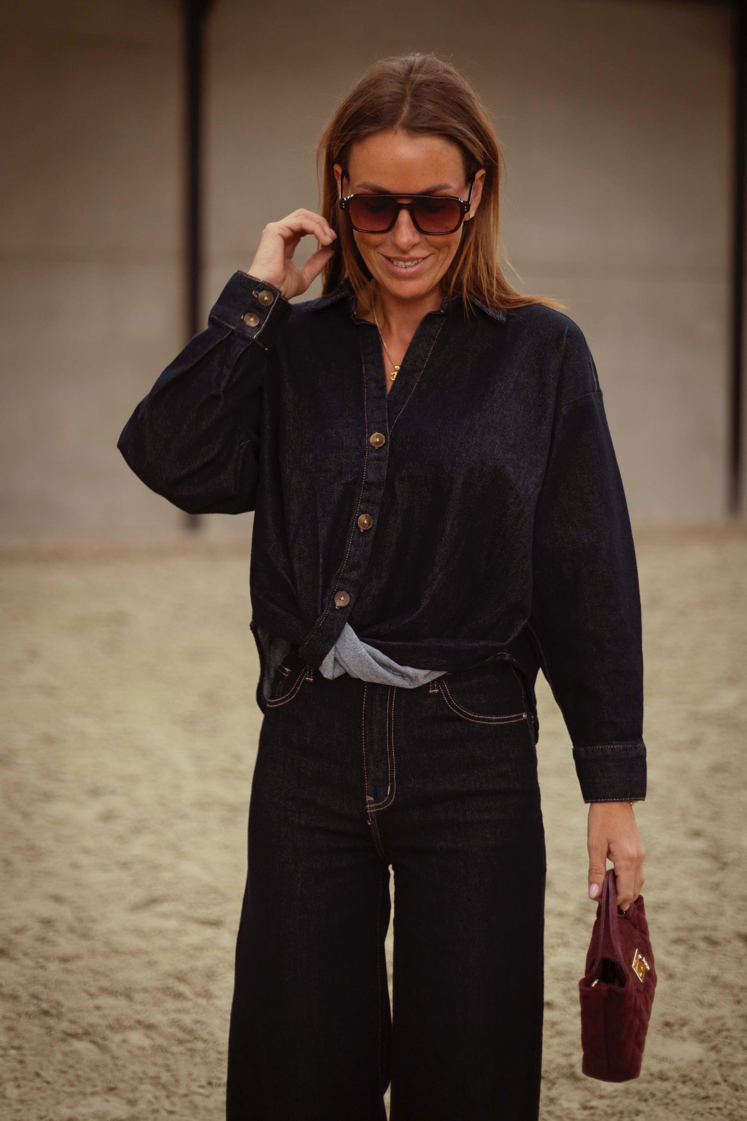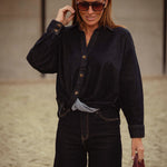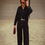Een cropped denim blouse in donkerblauw met fijne, kleine knoopjes voor een speels en eigentijds detail. Perfect te dragen als set met de bijpassende broek of los voor een casual, veelzijdige look die moeiteloos herfststijl uitstraalt.
