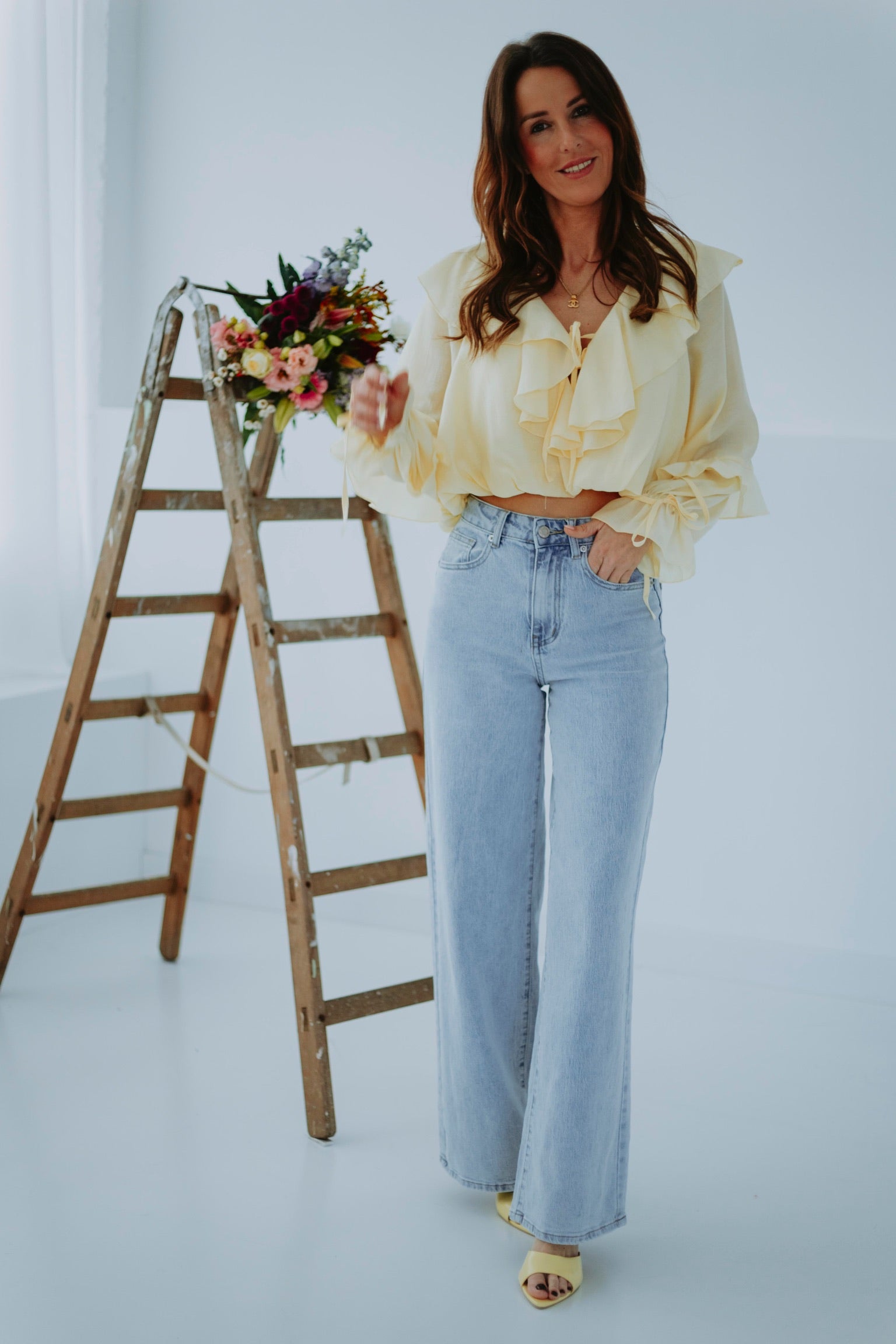 Een zonnige, gele blouse met speelse ruches voor een vrolijke lentelook. Licht en luchtig, perfect om te combineren met jeans of een rok voor een frisse outfit. Vrouwelijk, vrolijk en net dat beetje extra flair voor zonnige dagen.