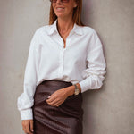 Fris, helder en altijd goed: deze witte klassieker is een onmisbaar stuk in elke herfstgarderobe. Draag ‘m los, onder een trui of in combinatie met een opvallend onderstuk voor een moeiteloos nette look.