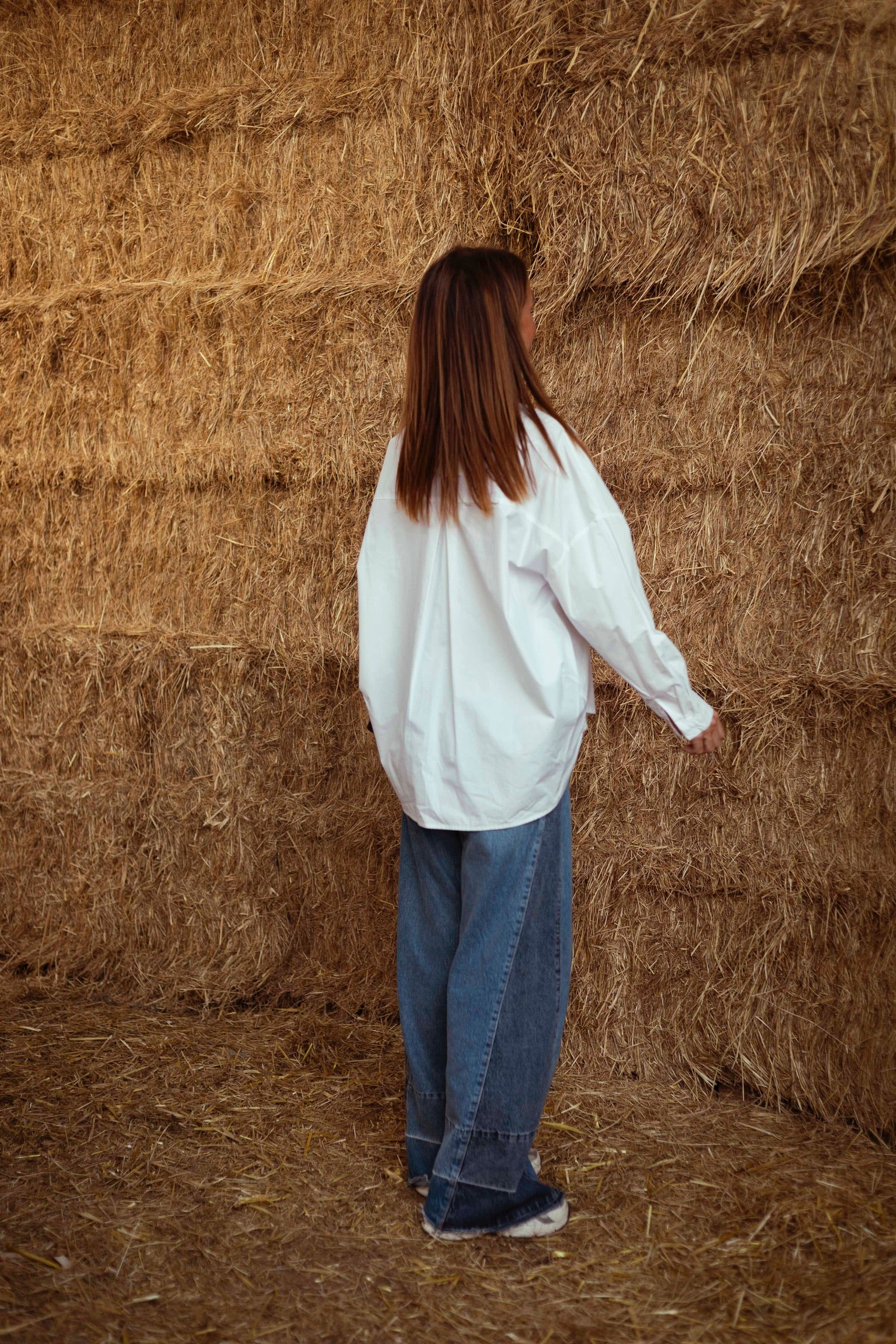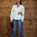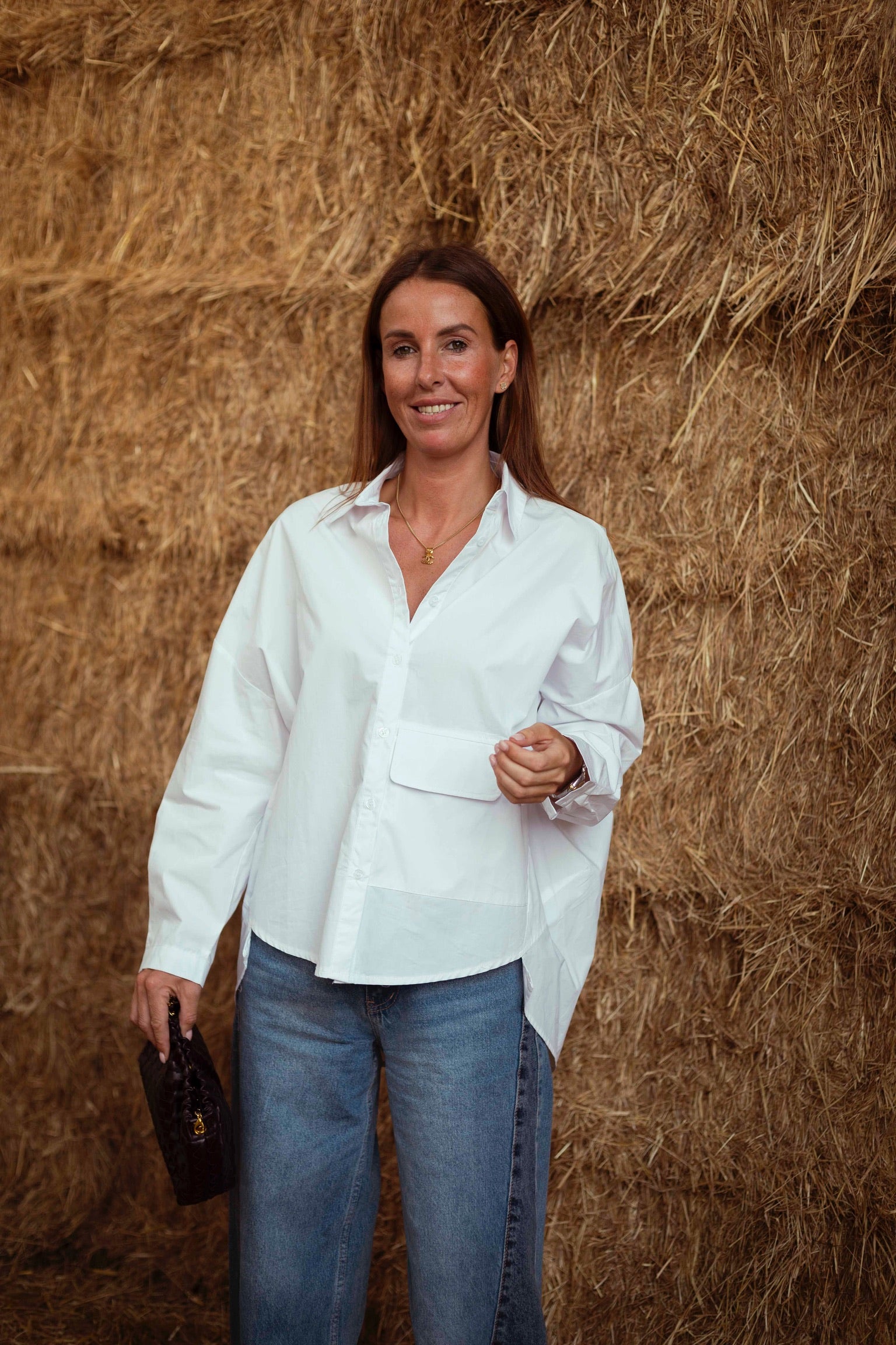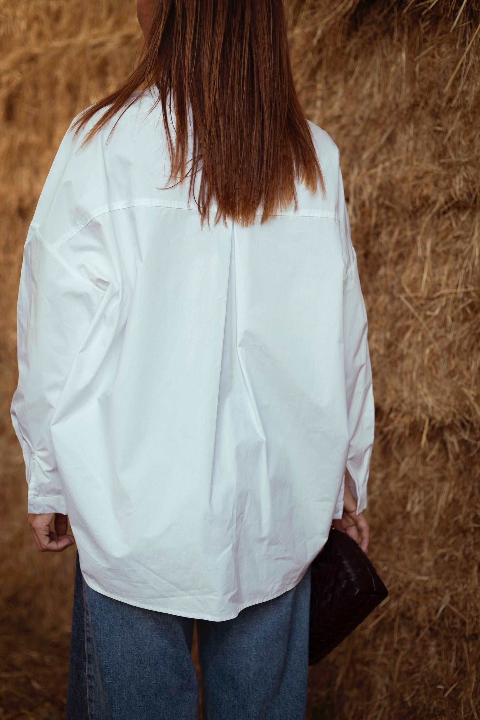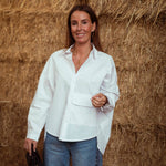Deze oversized blouse in frisse wit is heerlijk luchtig en heeft handige zakjes voor een nonchalante touch. Perfect om laagjes mee te maken tijdens de herfst, zowel casual als net iets chiquer te stylen. Een veelzijdige topper die elke outfit moeiteloos afmaakt.