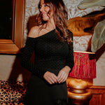 JOY TO ALL BLACK RHINESTONE ONE SHOULDER BLOUSE