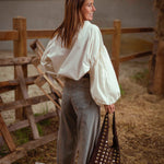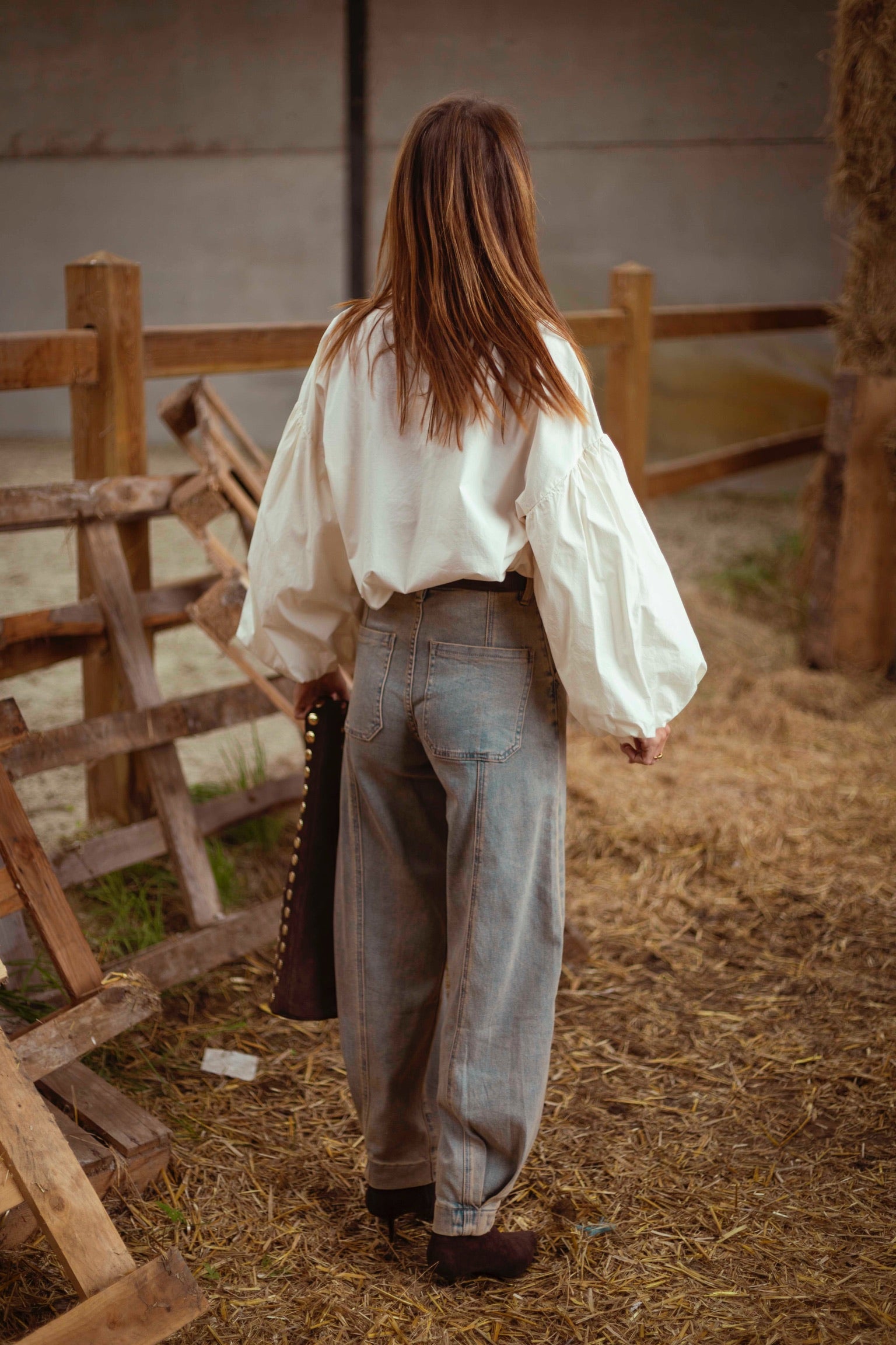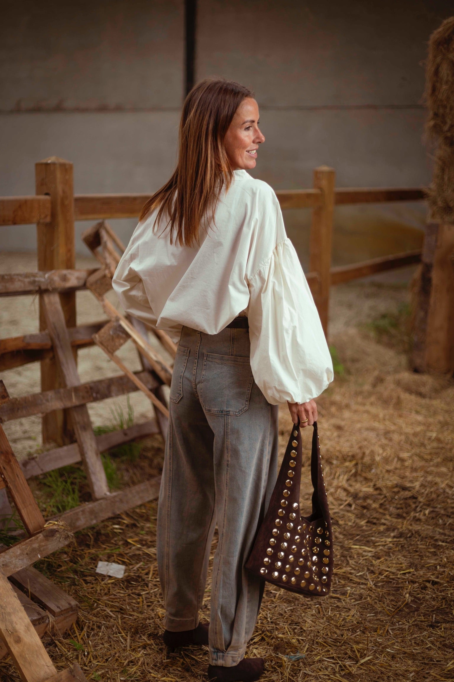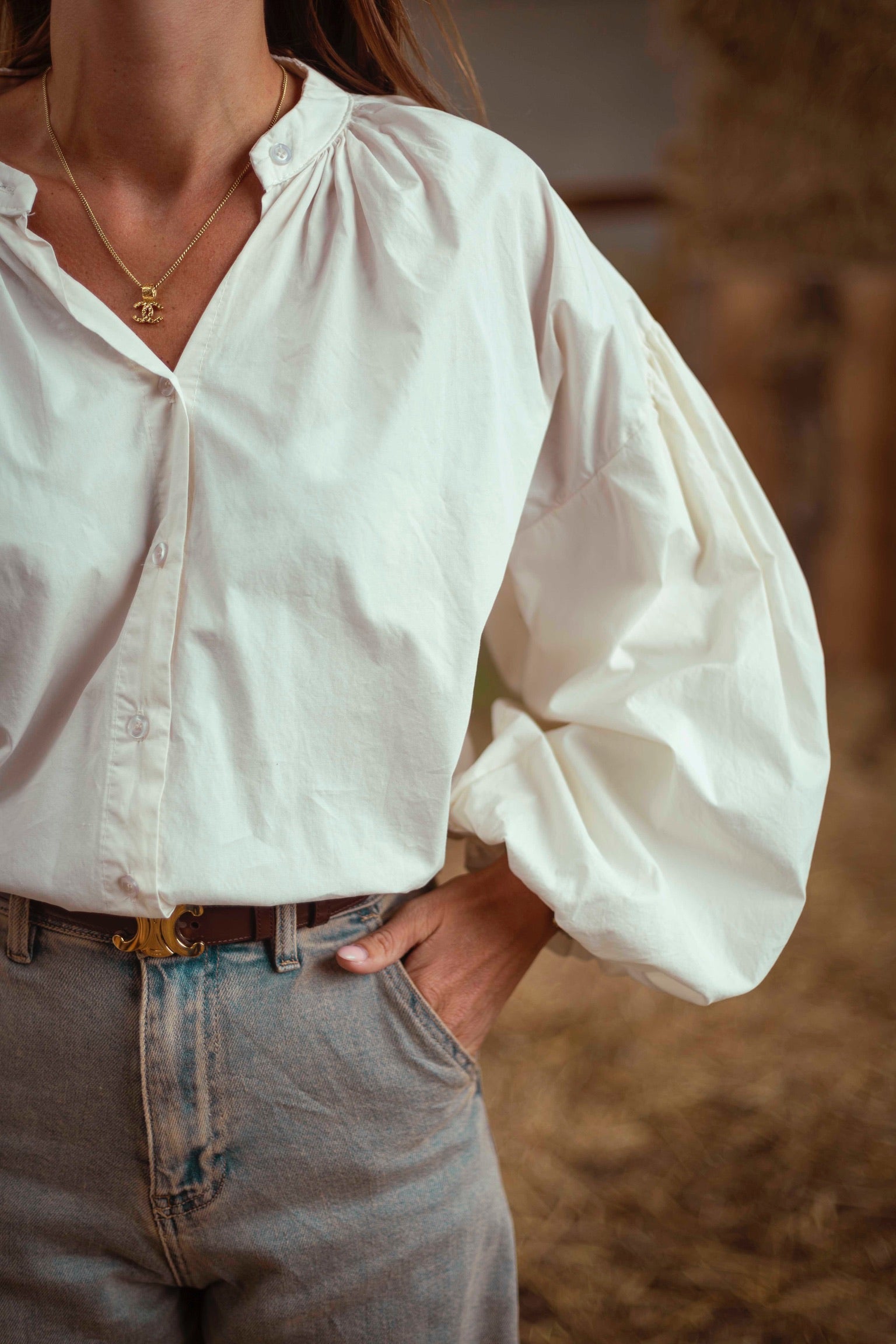Deze ecru blouse valt op door de elegante pofmouwen die zorgen voor een subtiel speels effect. Een perfecte keuze om je herfstlook nét dat beetje extra te geven, zowel chic als comfortabel.