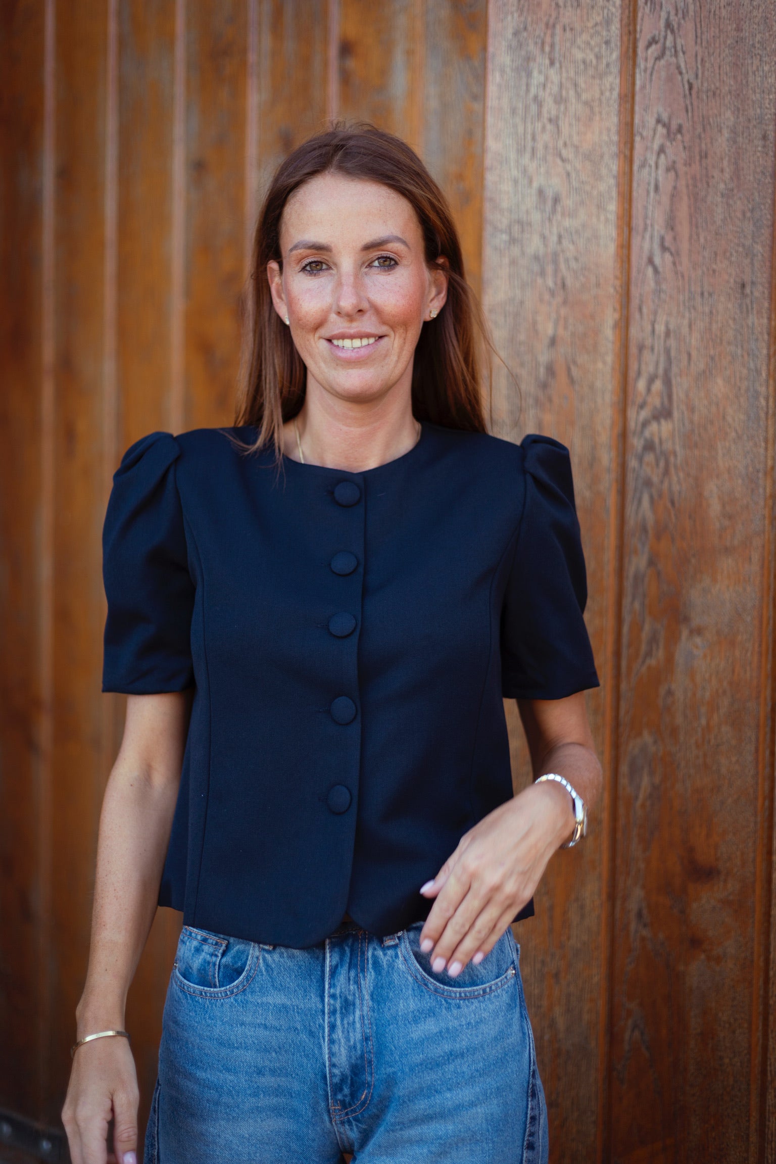 Een charmante blouse met korte pofmouwen en ton-sur-ton knopen die naadloos opgaan in de stof. De zachte, herfstige tint maakt het een ideaal bovenstuk voor onder een gilet of gebreid vest. Draagbaar met zowel een jeans als een rok voor een elegante herfstlook.