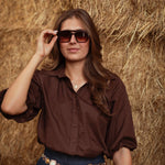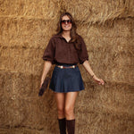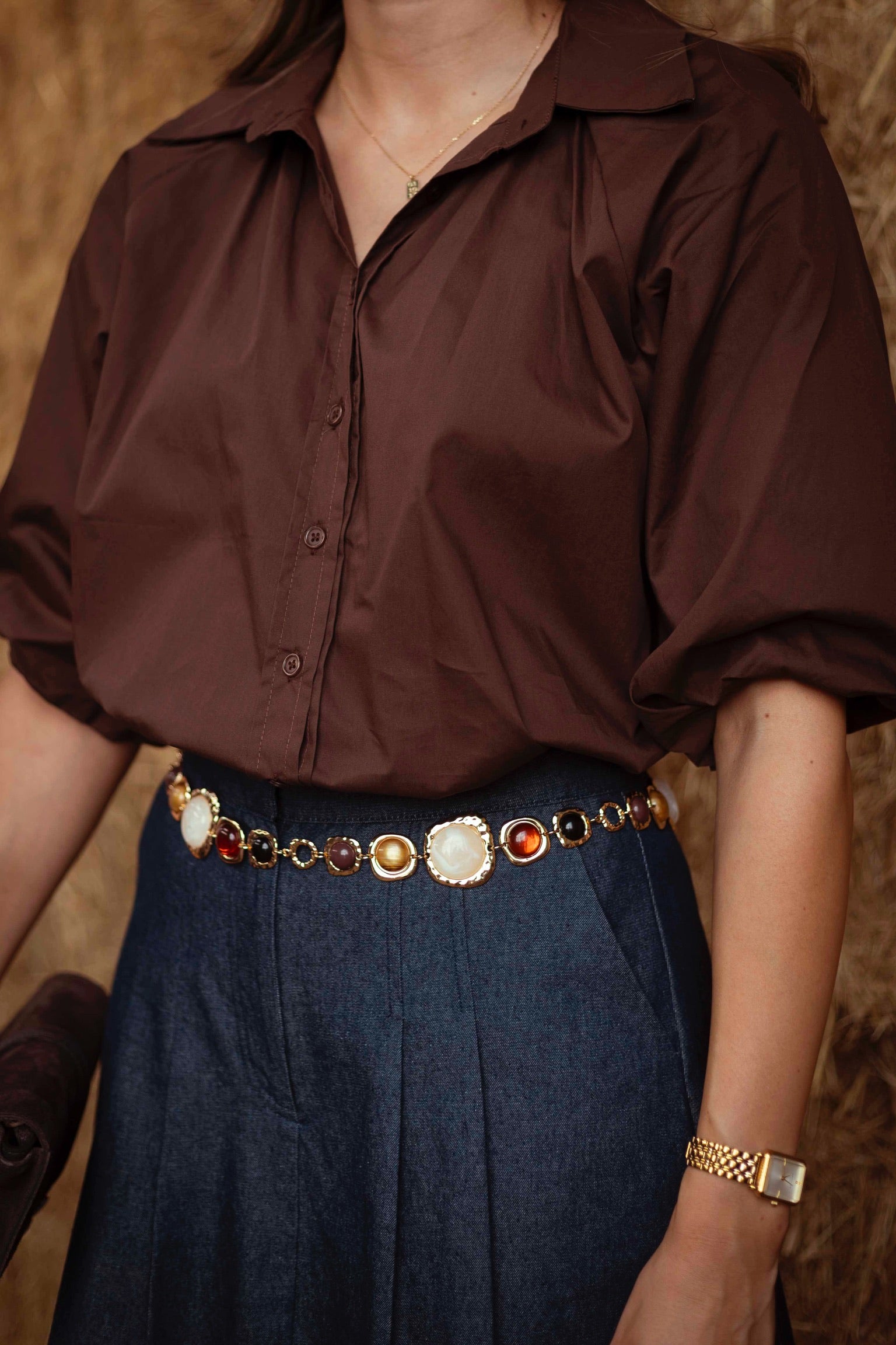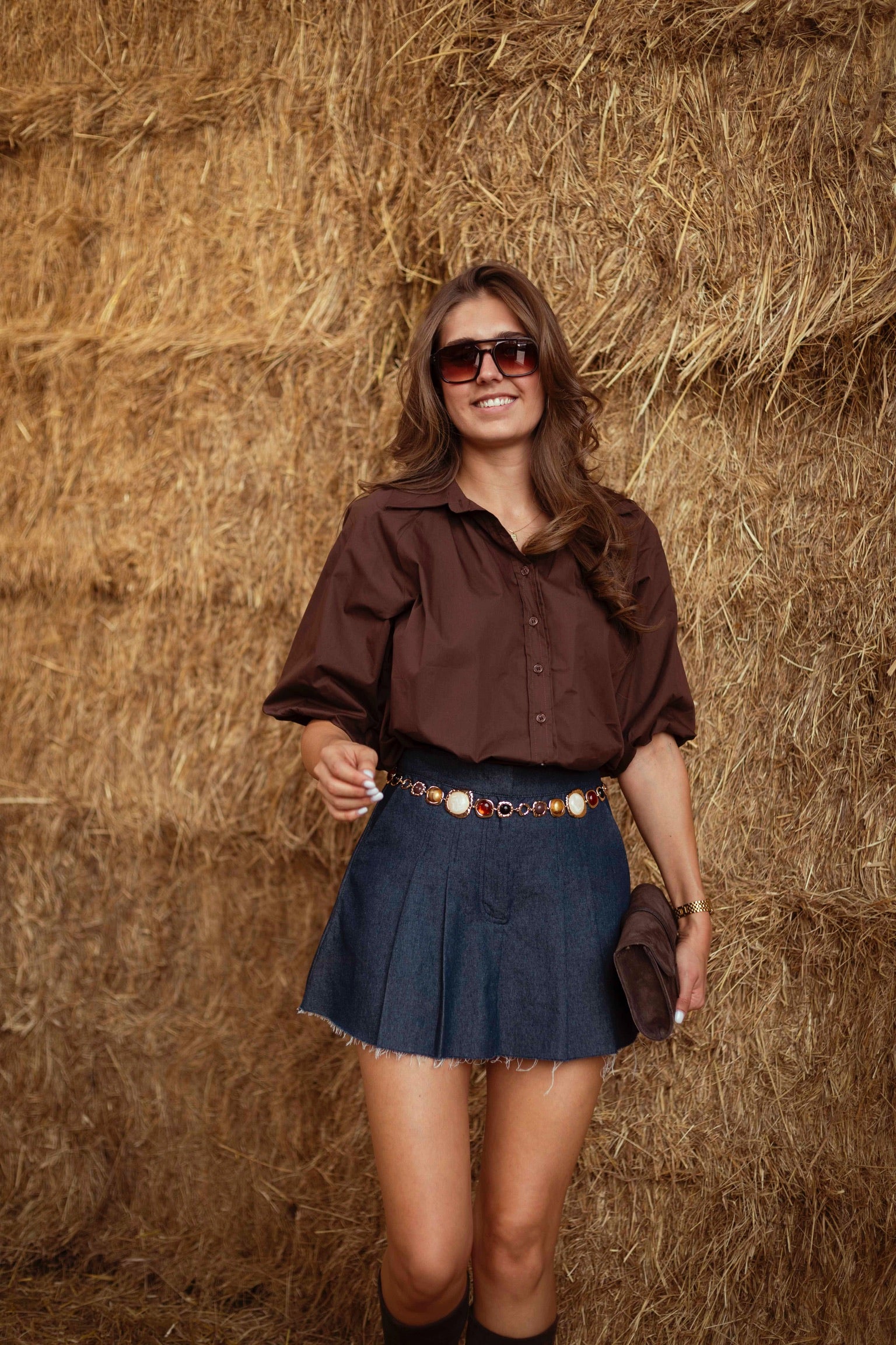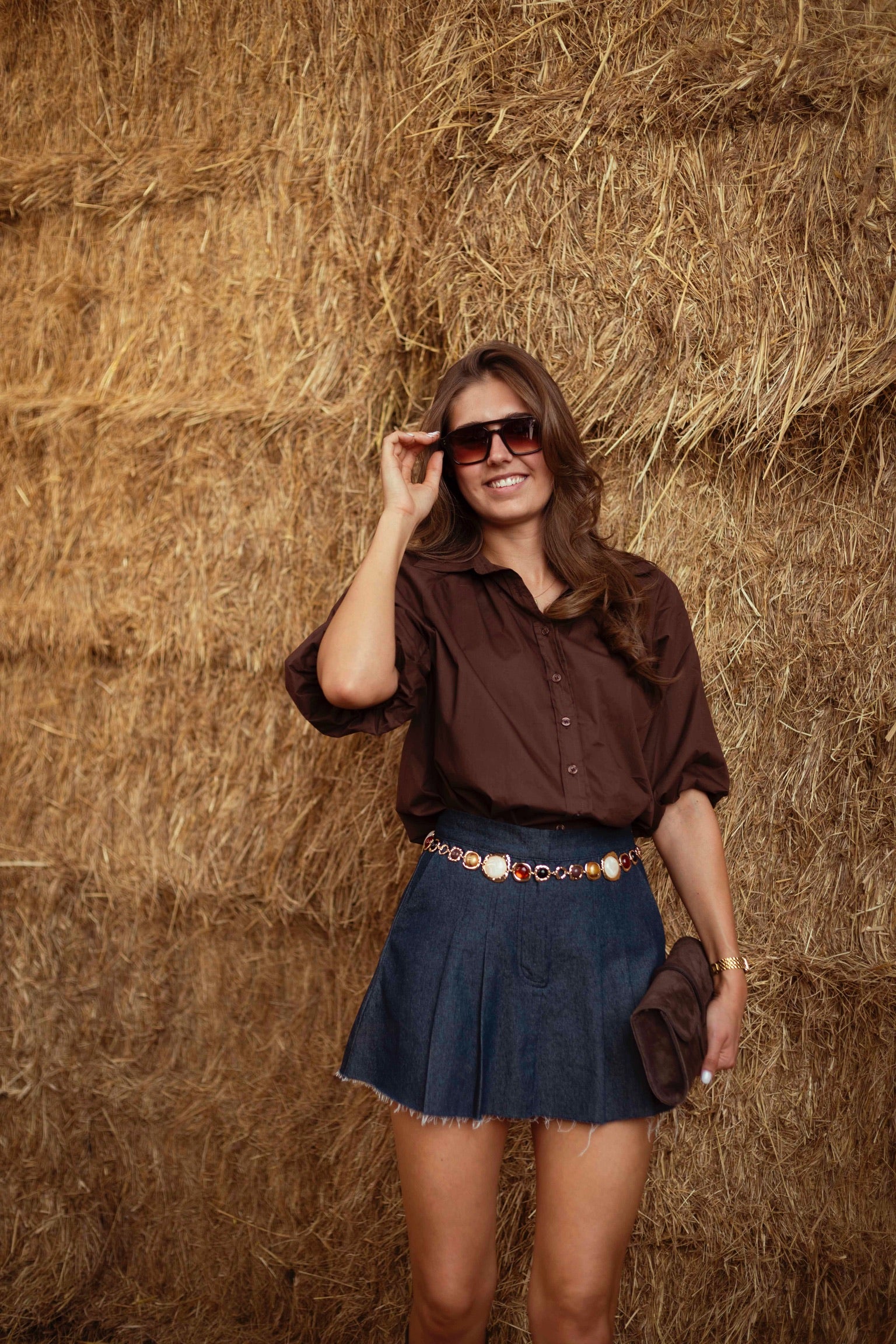 Deze bruine blouse met opvallende pofmouwen brengt meteen volume en flair in je herfstoutfit. De rijke kleur en elegante snit maken haar perfect voor zowel een casual als geklede look. Combineer met een high waisted jeans of rok voor een krachtige maar vrouwelijke uitstraling.