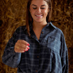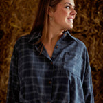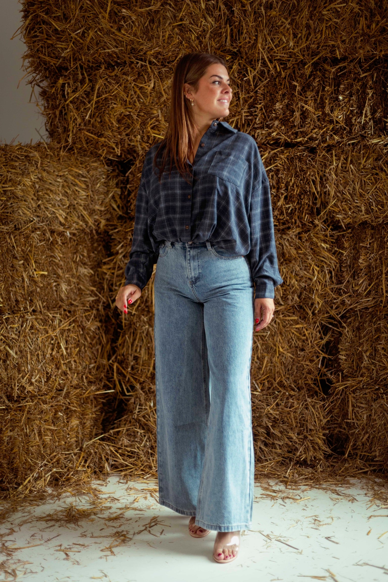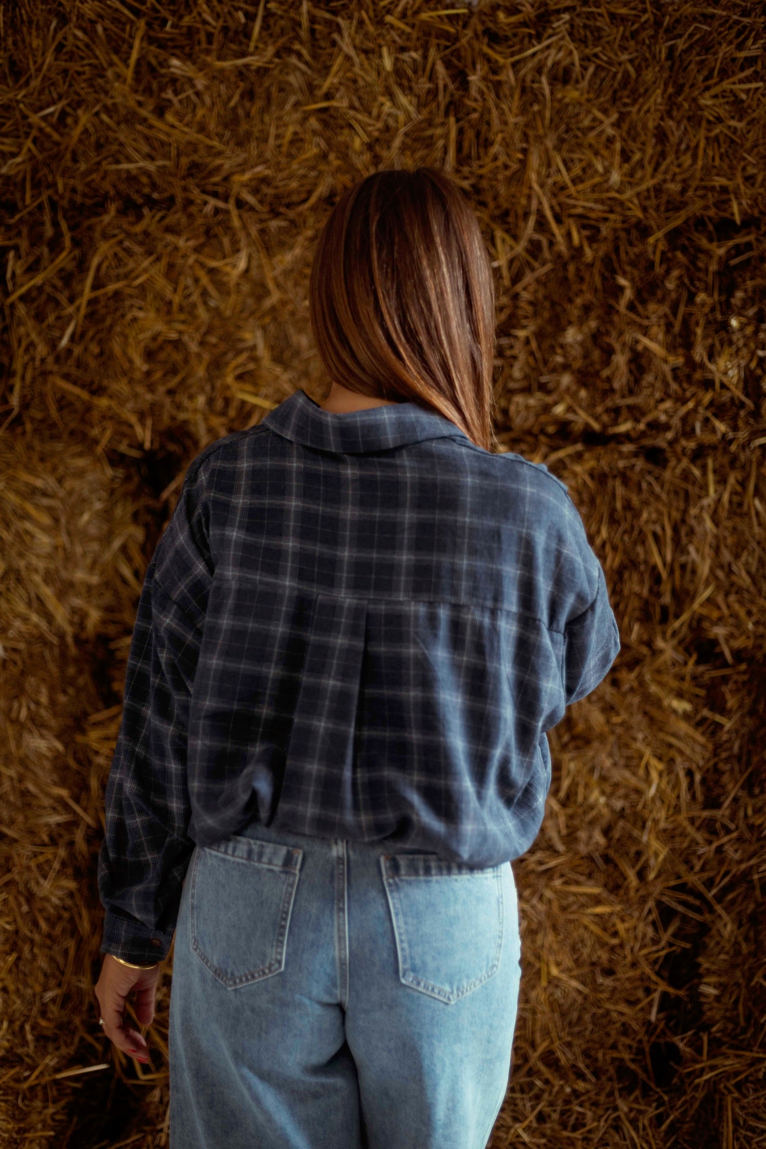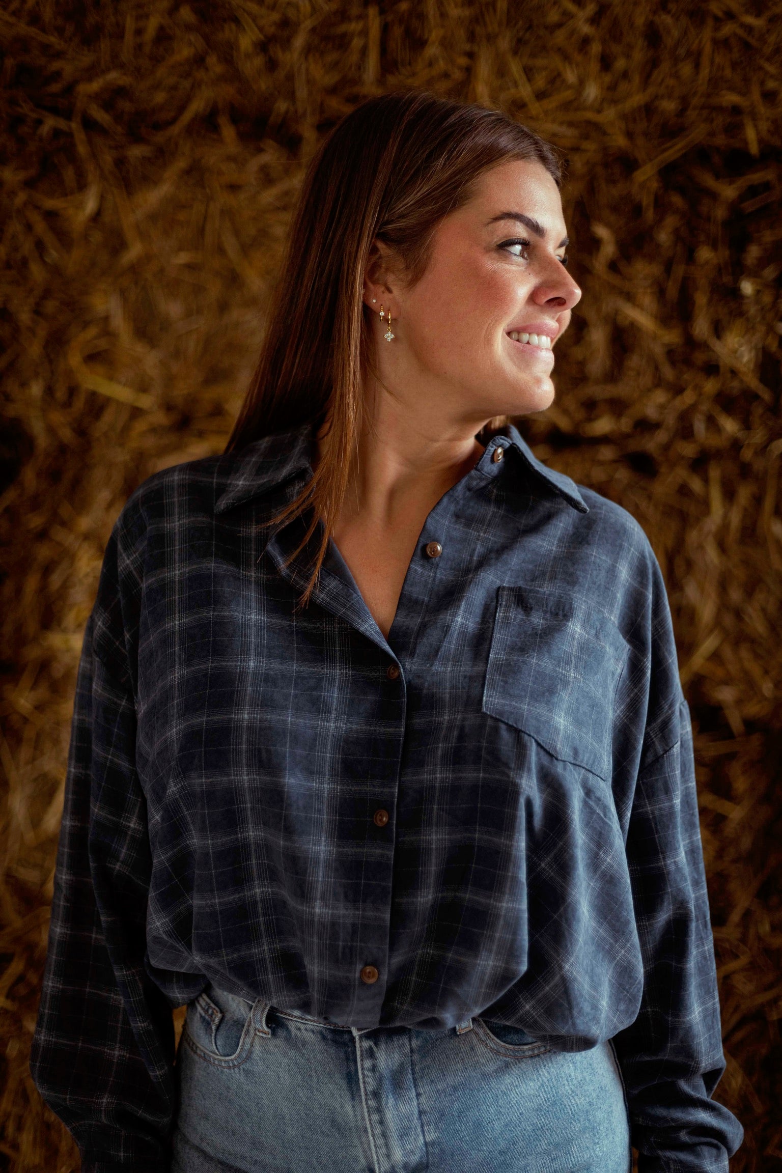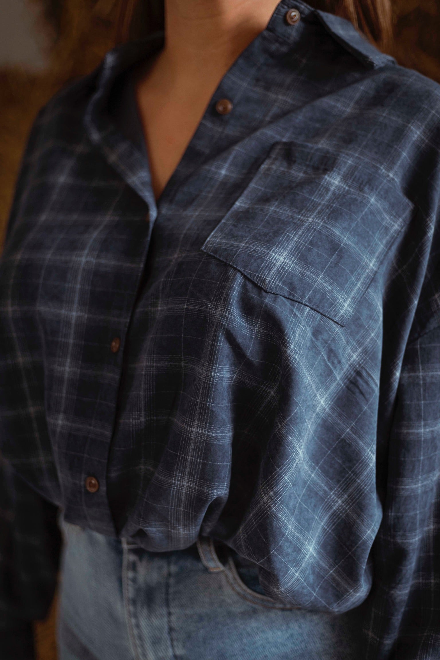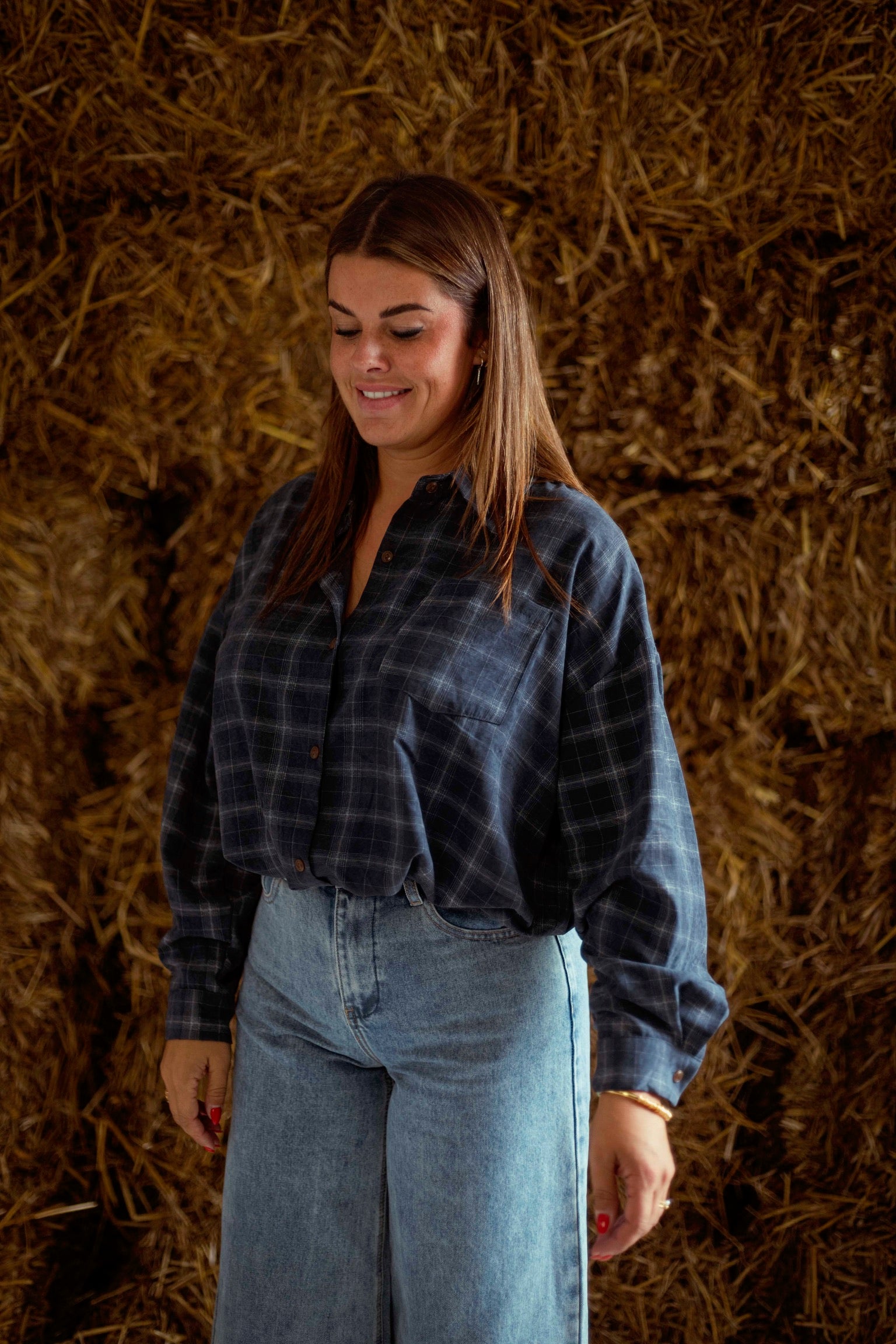 Een donkerblauwe blouse met ruitpatroon, stevig genoeg voor koelere dagen maar licht genoeg om te combineren. De klassieke print krijgt een moderne twist door de donkere tint, ideaal voor zowel werk als weekend. Mooi in combinatie met denim of een leren rok.
