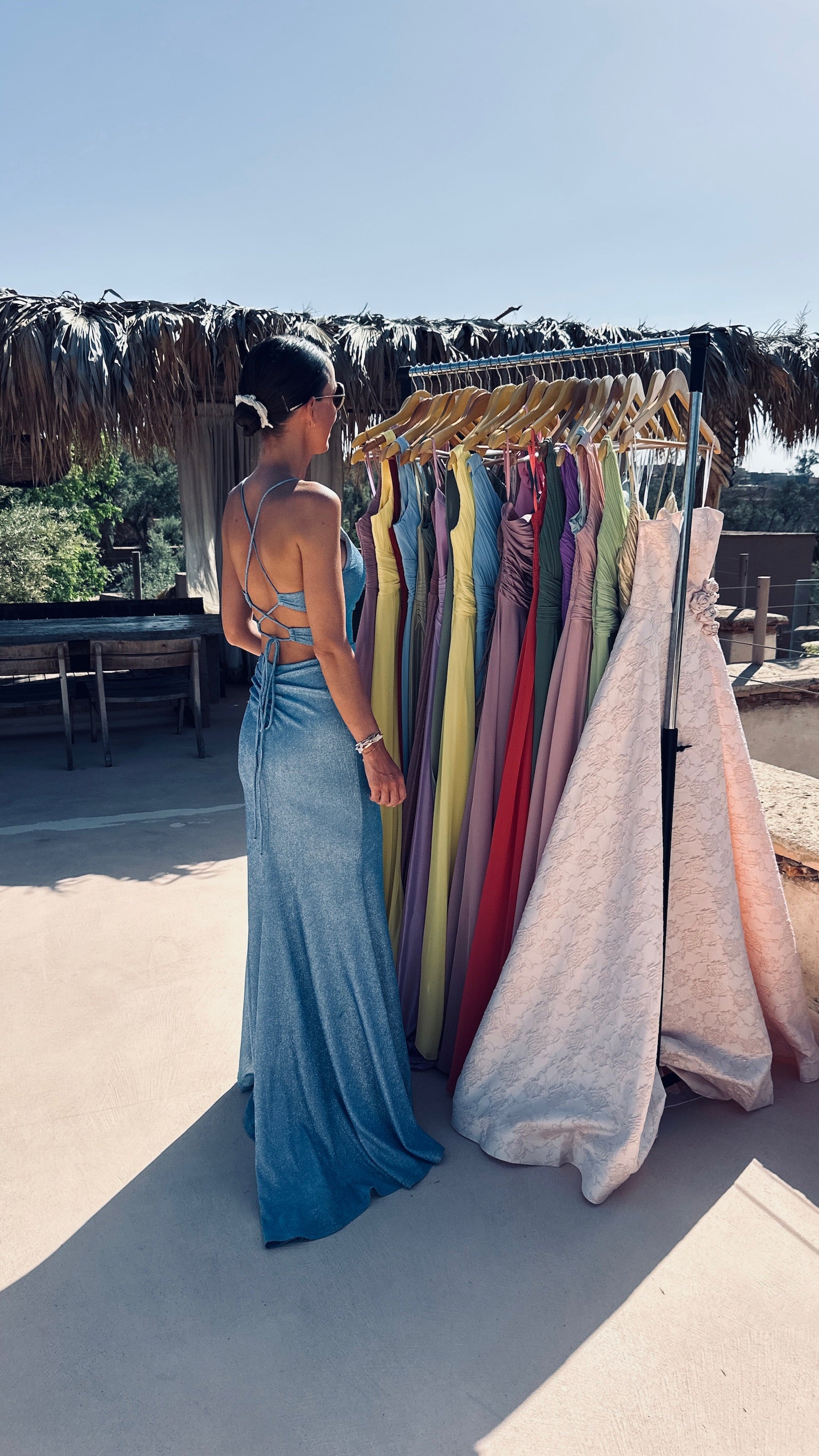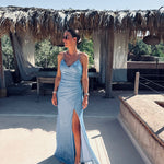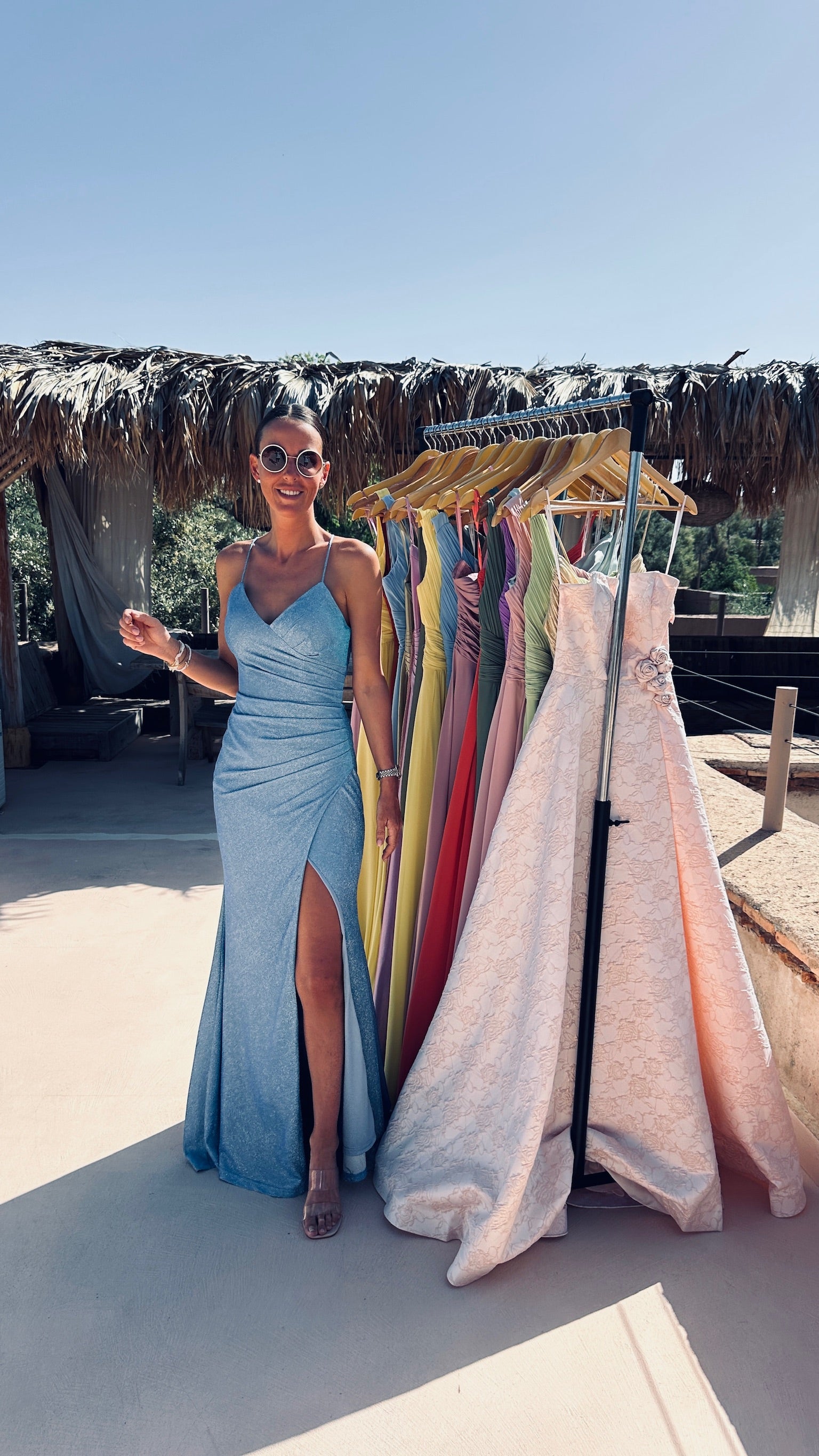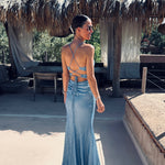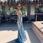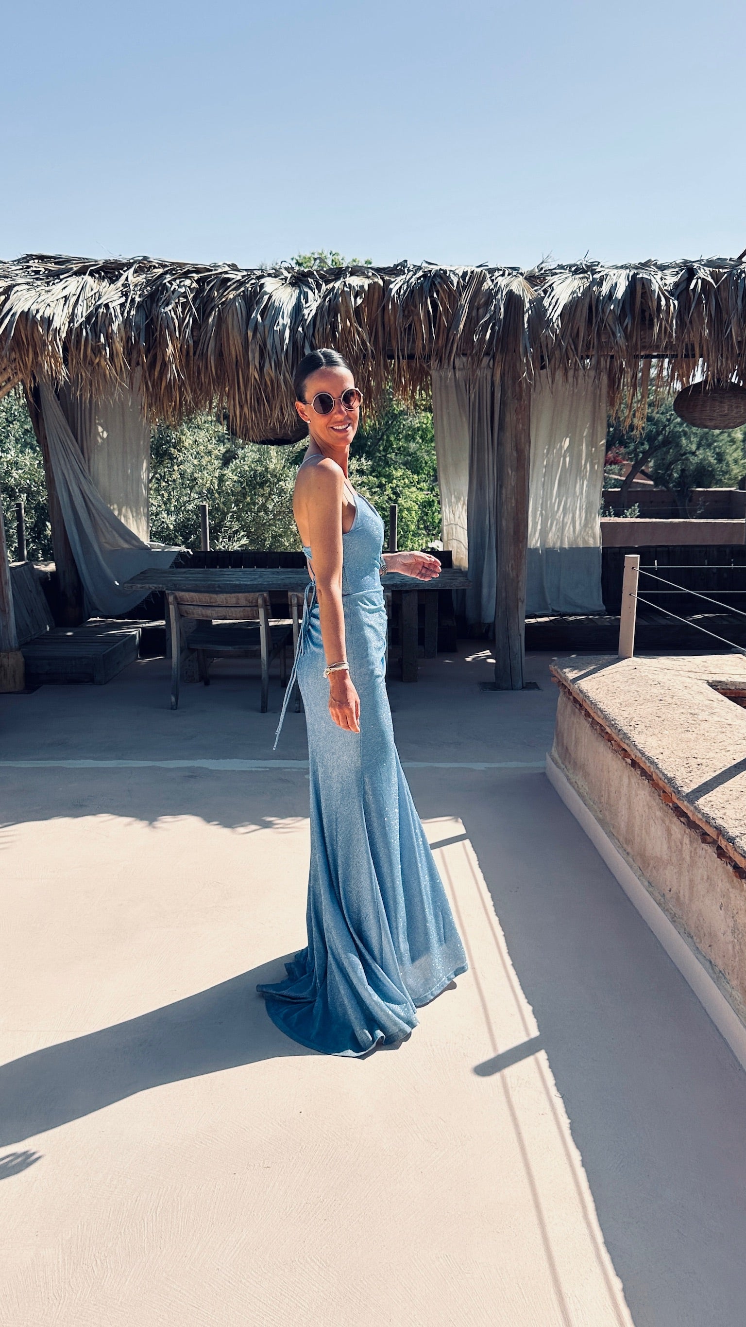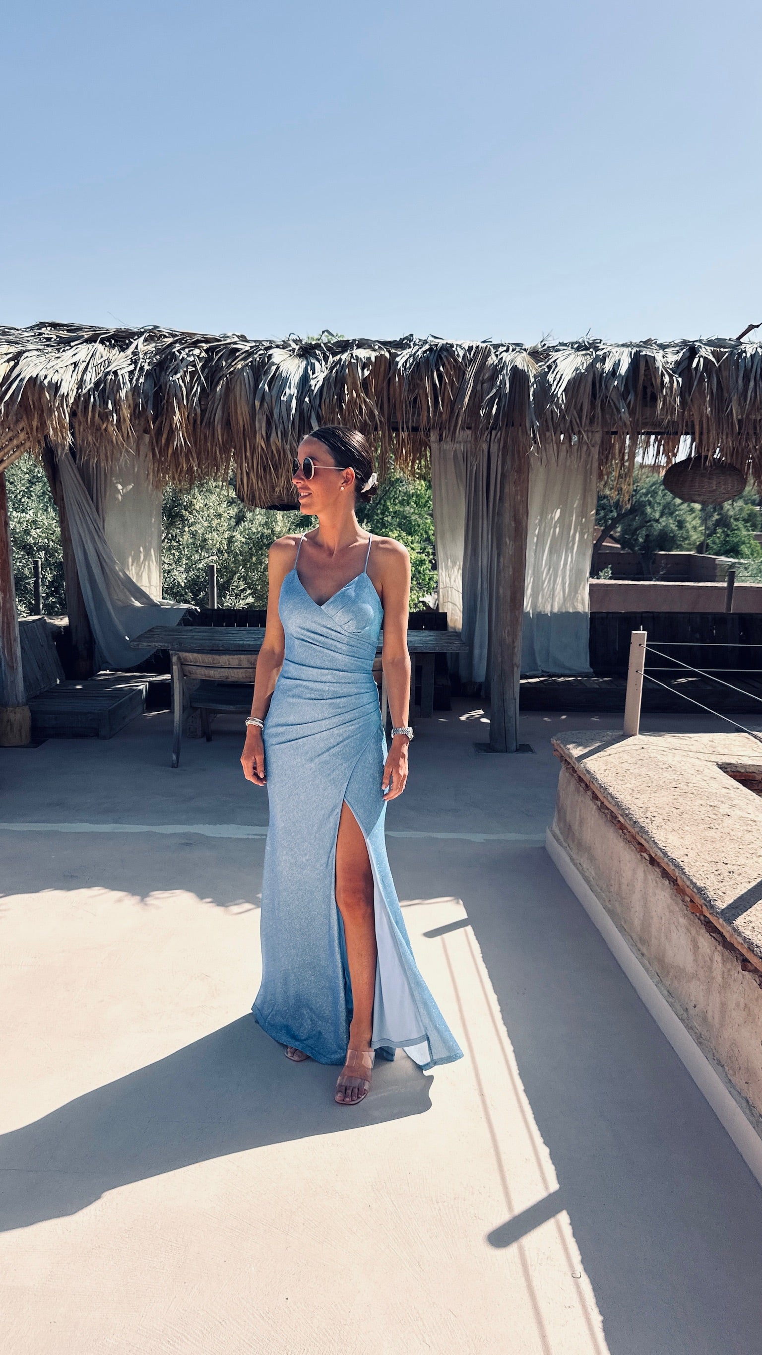 Deze lange jurk met subtiele glitter is gemaakt om te stralen, met een elegante split vooraan en fijne koordjes die sierlijk over de rug kruisen. De korte sleep voegt een vleugje drama toe – ideaal voor een feestje of een onvergetelijk bruidsfeestmoment.