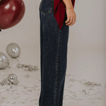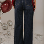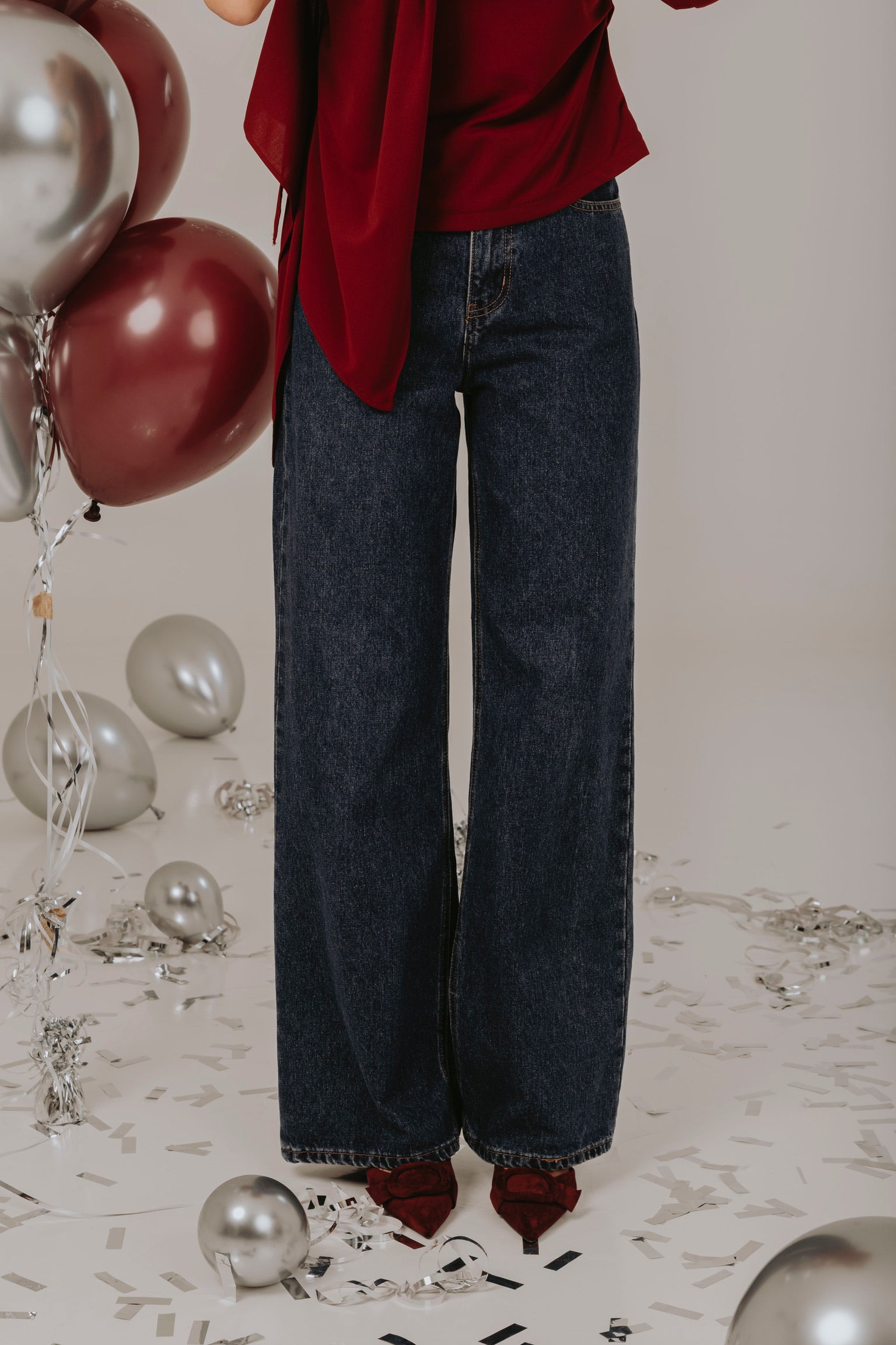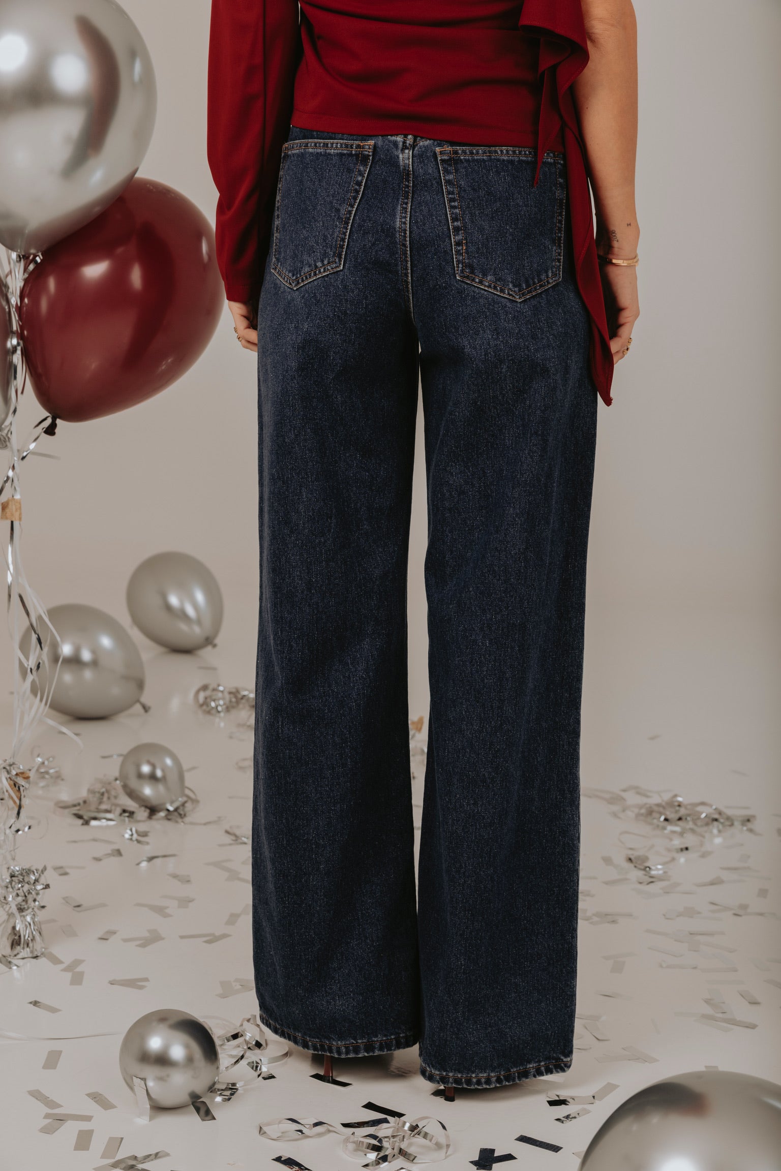Deze donkerblauwe wide leg jeans valt elegant los en creëert een moeiteloos chique silhouet. De vloeiende pijpen geven een moderne twist aan je everyday look en zijn perfect te combineren met glanzende tops voor een subtiele party vibe. Comfort en stijl komen samen in één statement piece.