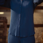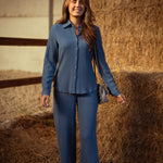 Een stijlvolle set in zachte, geribde stof die comfort en klasse moeiteloos combineert. De blouse met lange mouwen en de bijpassende broek zorgen voor een elegante, samenhangende look. Ideaal voor frisse herfstdagen, en verkrijgbaar in tinten die perfect bij het seizoen passen.