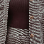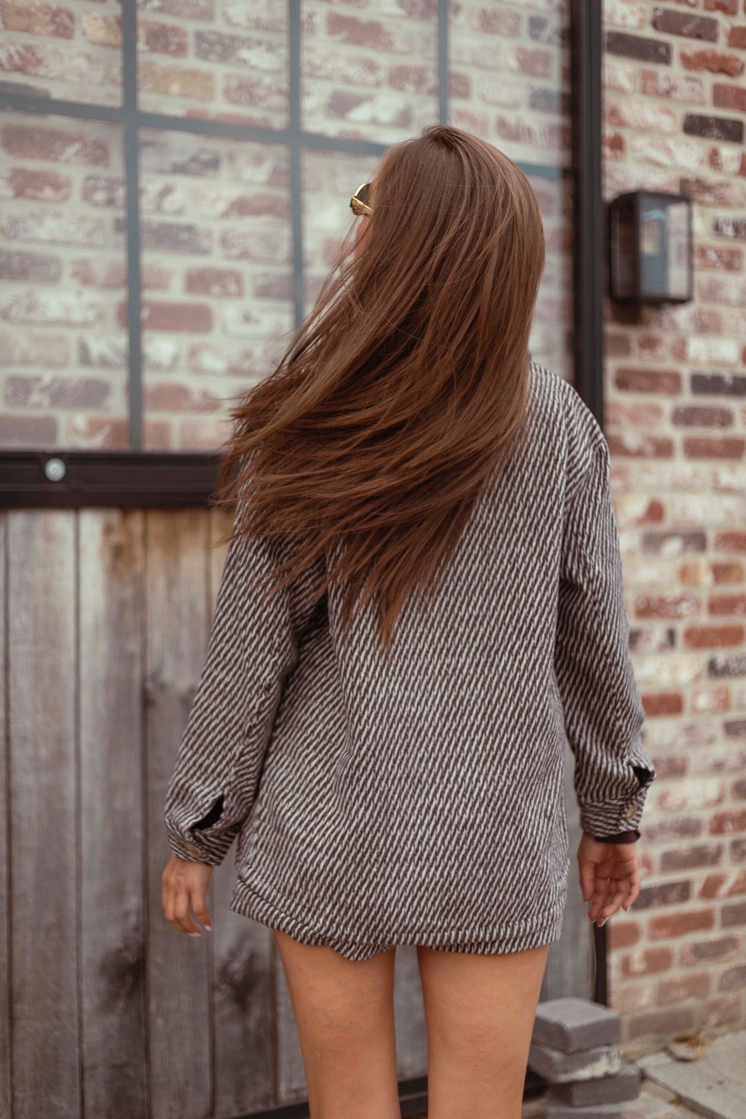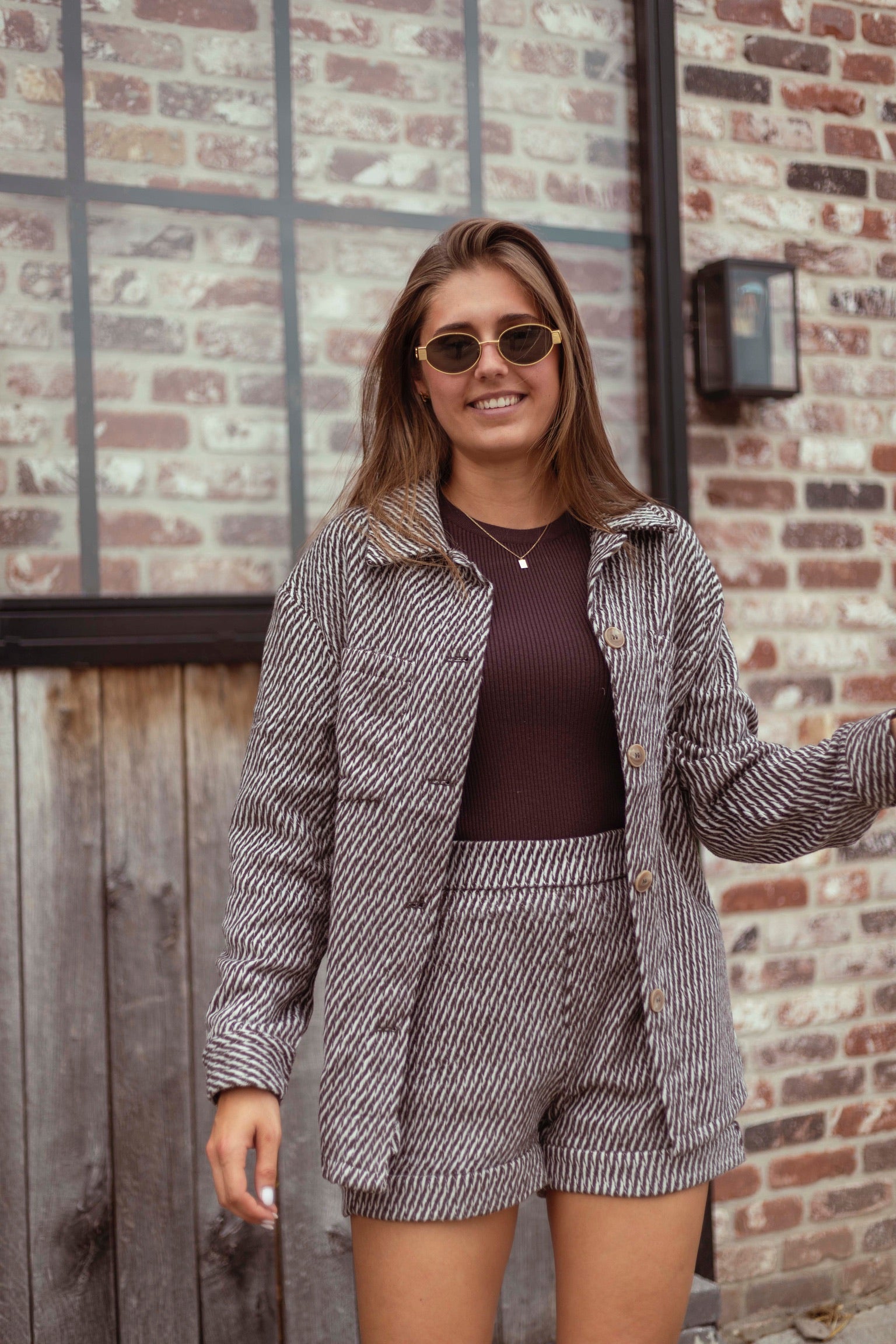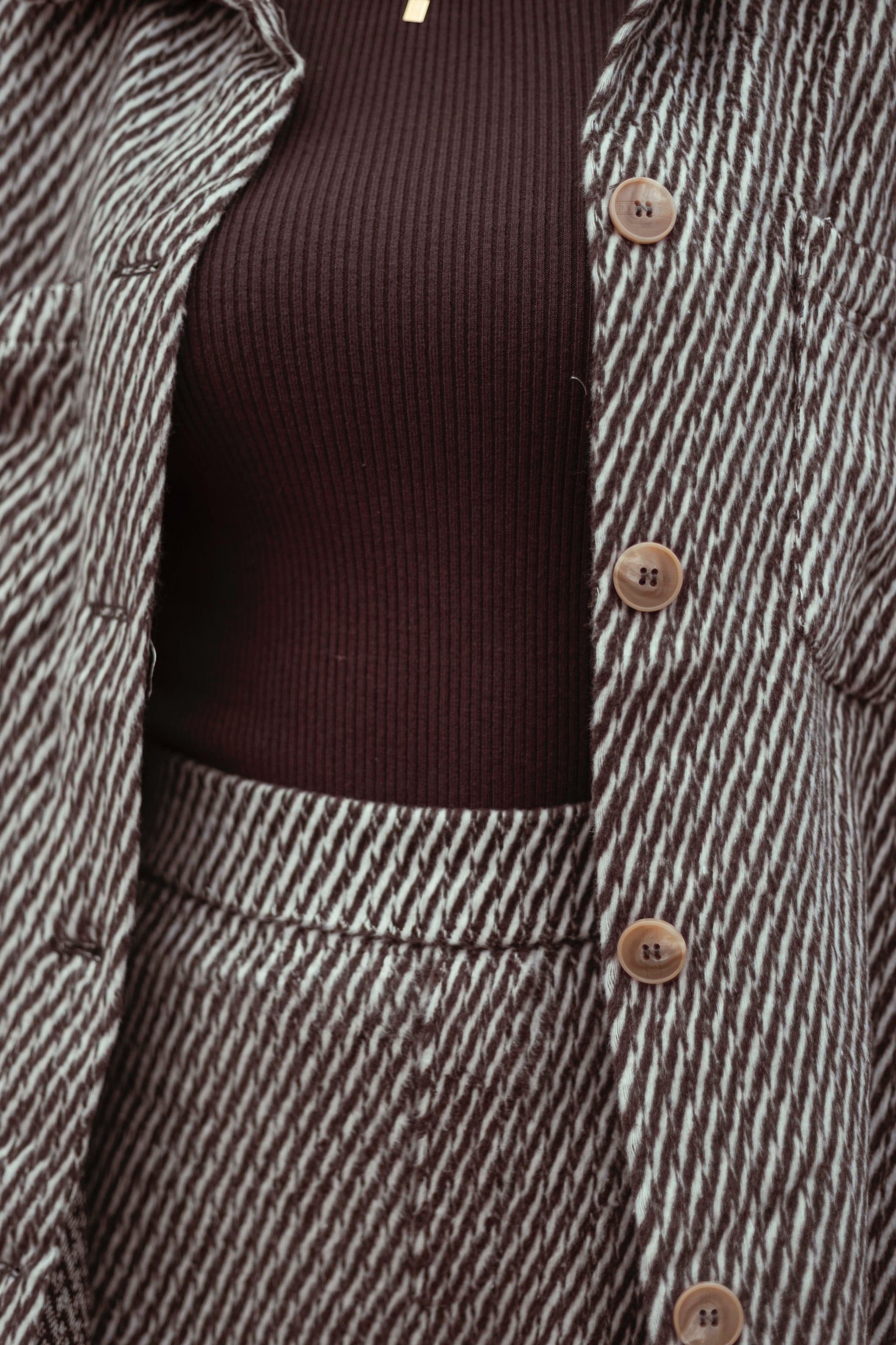 Een warme, gestreepte two-piece set in bruintinten die casual comfort en stijl moeiteloos combineert. Perfect voor relaxte herfstdagen waarbij je er toch verzorgd uit wilt zien. Draag beide items apart of als complete look.