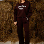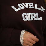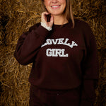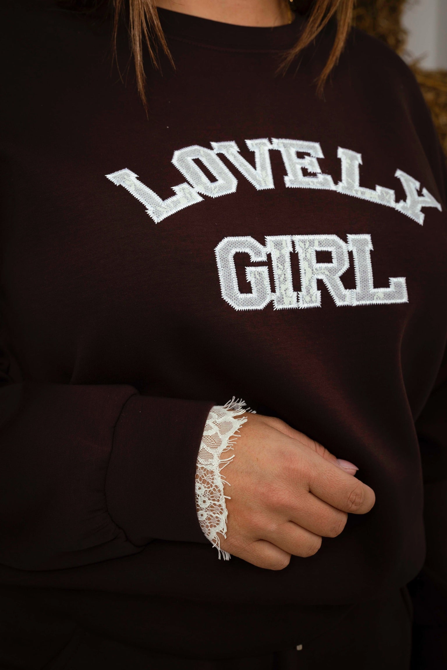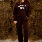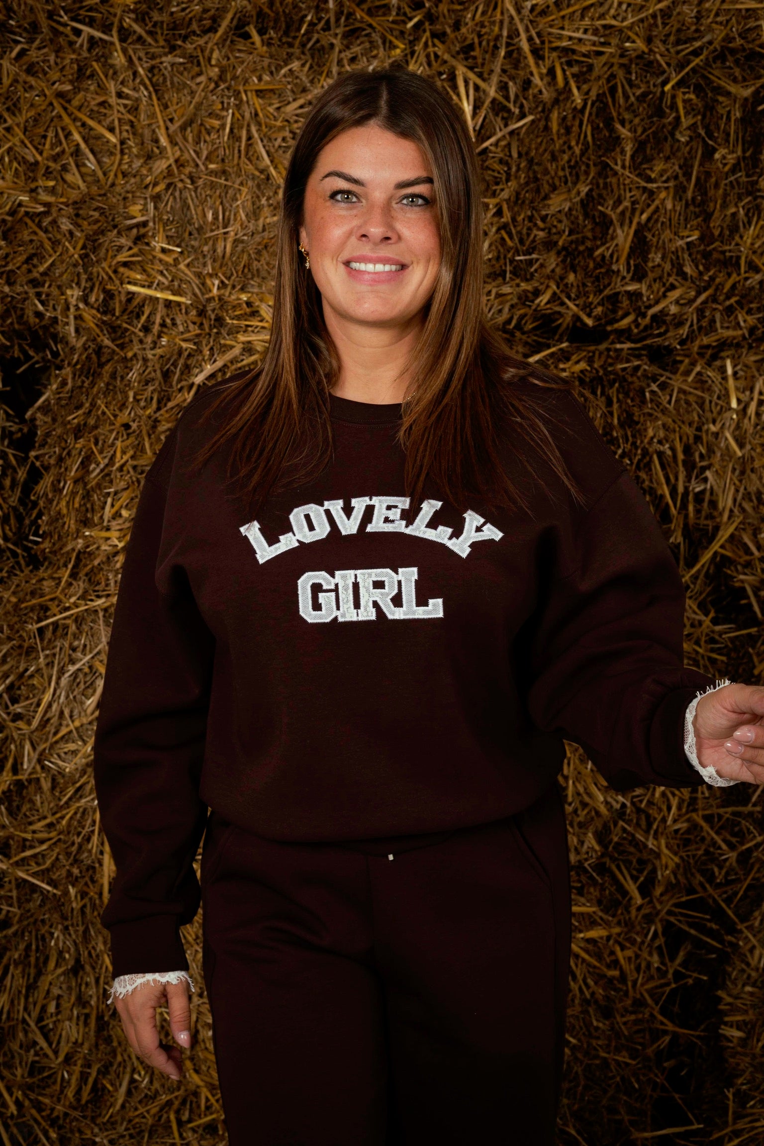 Een cosy set in warme bruintint die comfort en speelsheid perfect combineert. De trui met de tekst *lovely girl* en de bijpassende broek maken dit tot een onweerstaanbare outfit voor relaxte herfstdagen met een zachte twist.
