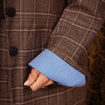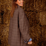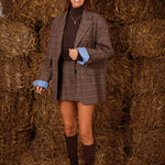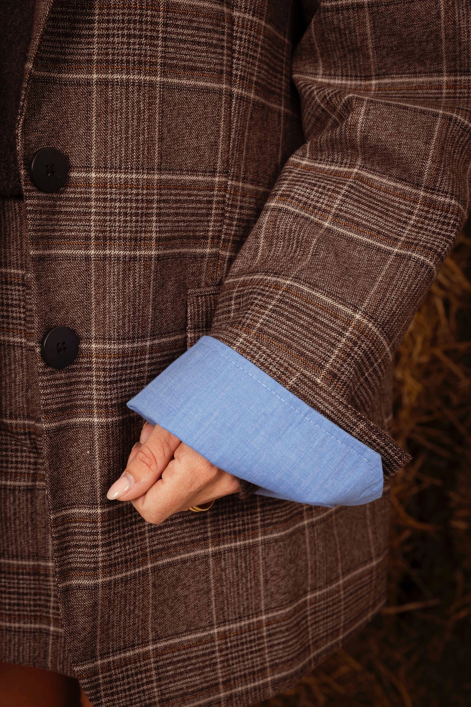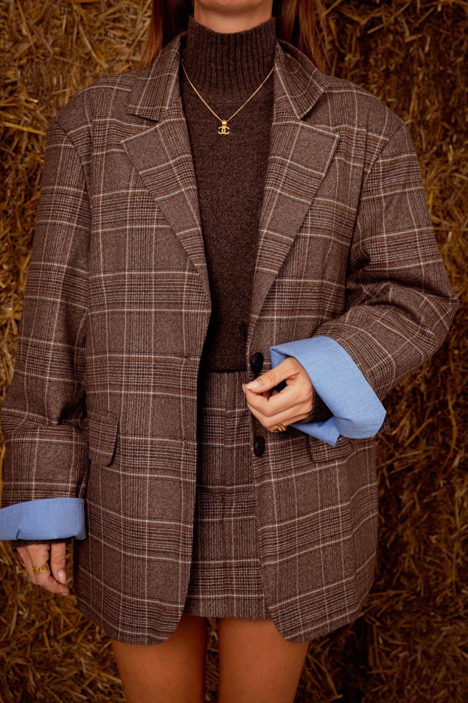 Een oversized essential in een klassiek bruin ruitpatroon, met een subtiele lichtblauwe touch aan de binnenkant van de mouwen voor een speelse twist. Draag solo voor een krachtige look of samen met de bijpassende skort voor een stijlvol geheel.