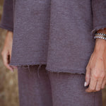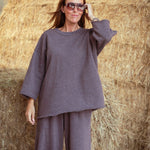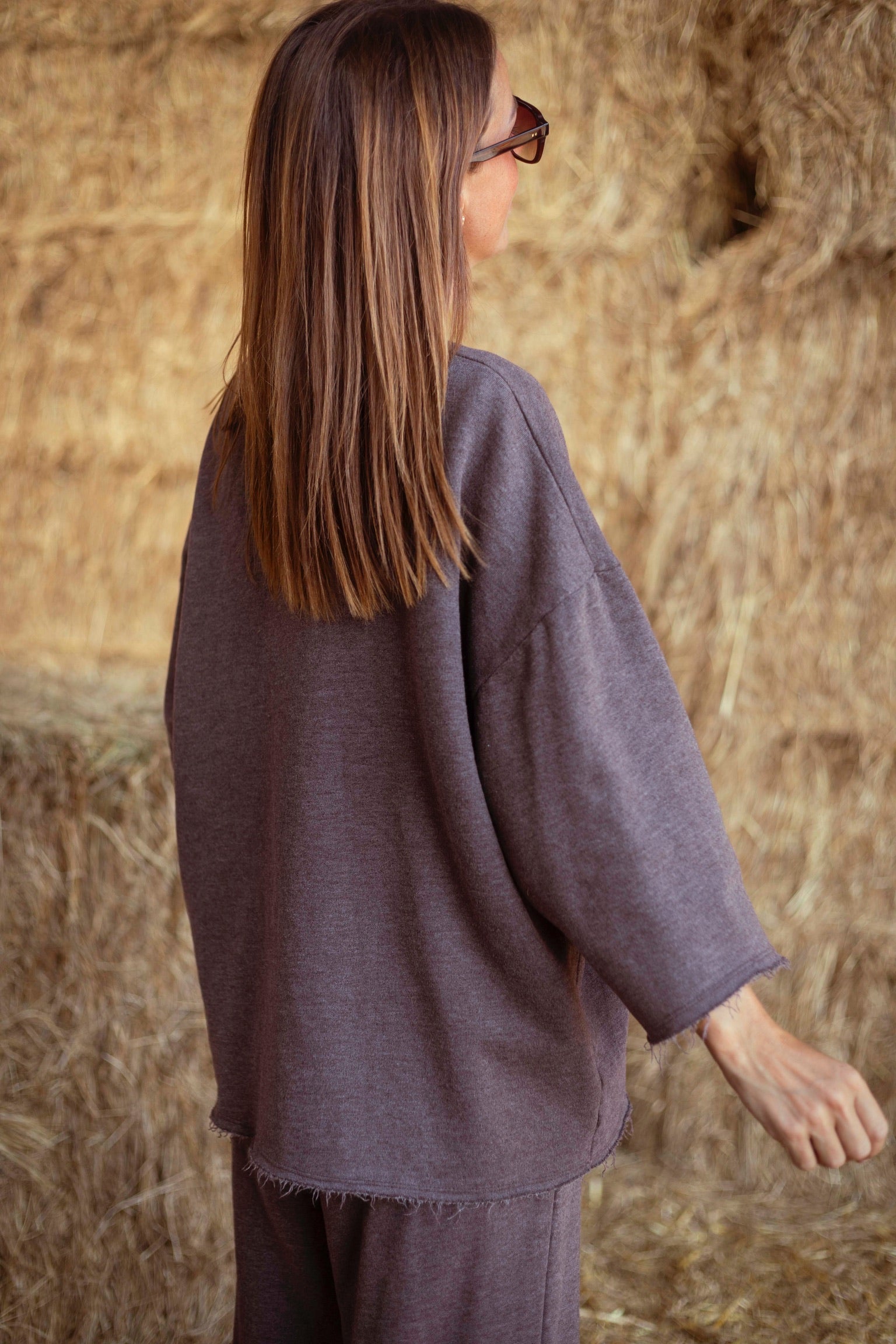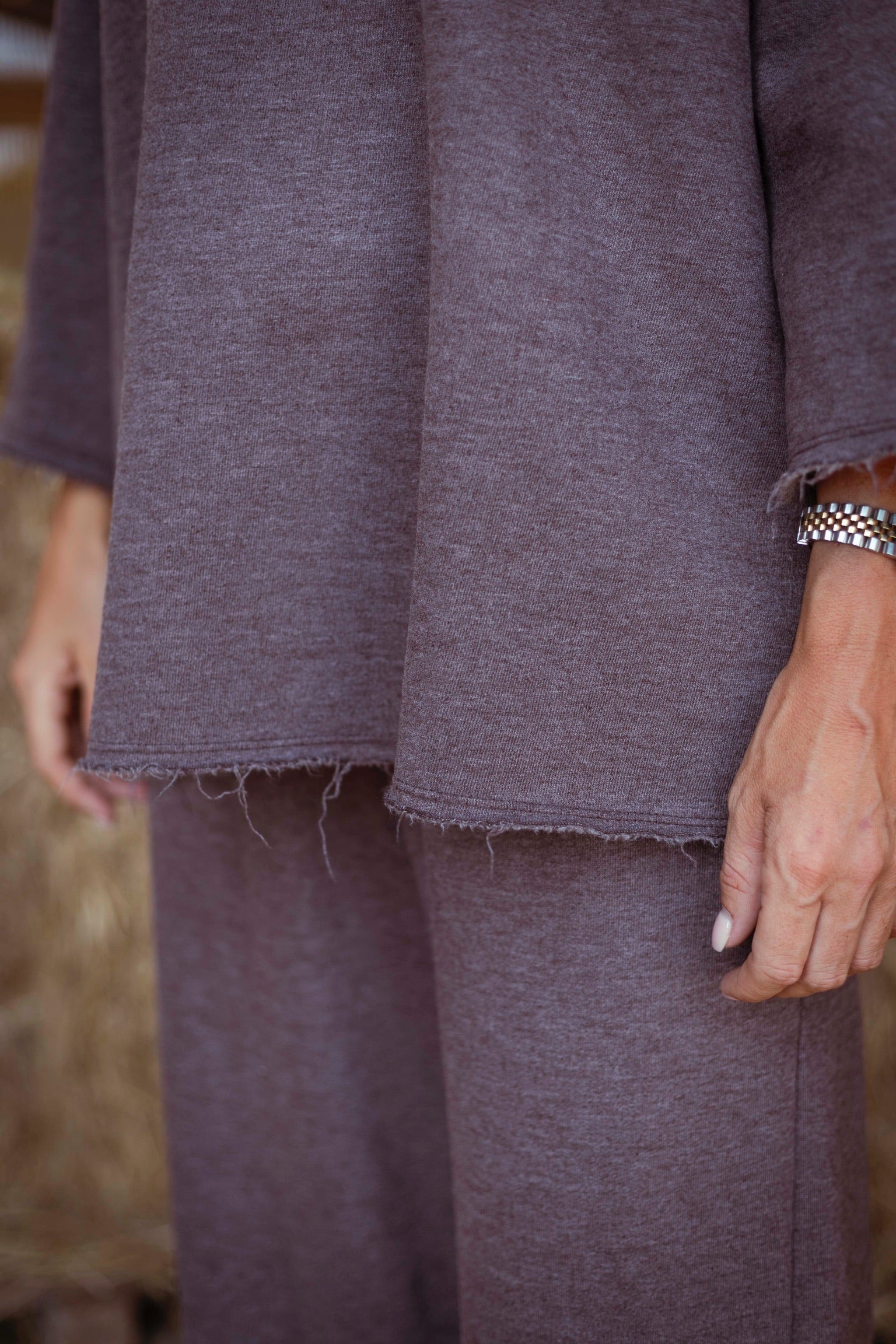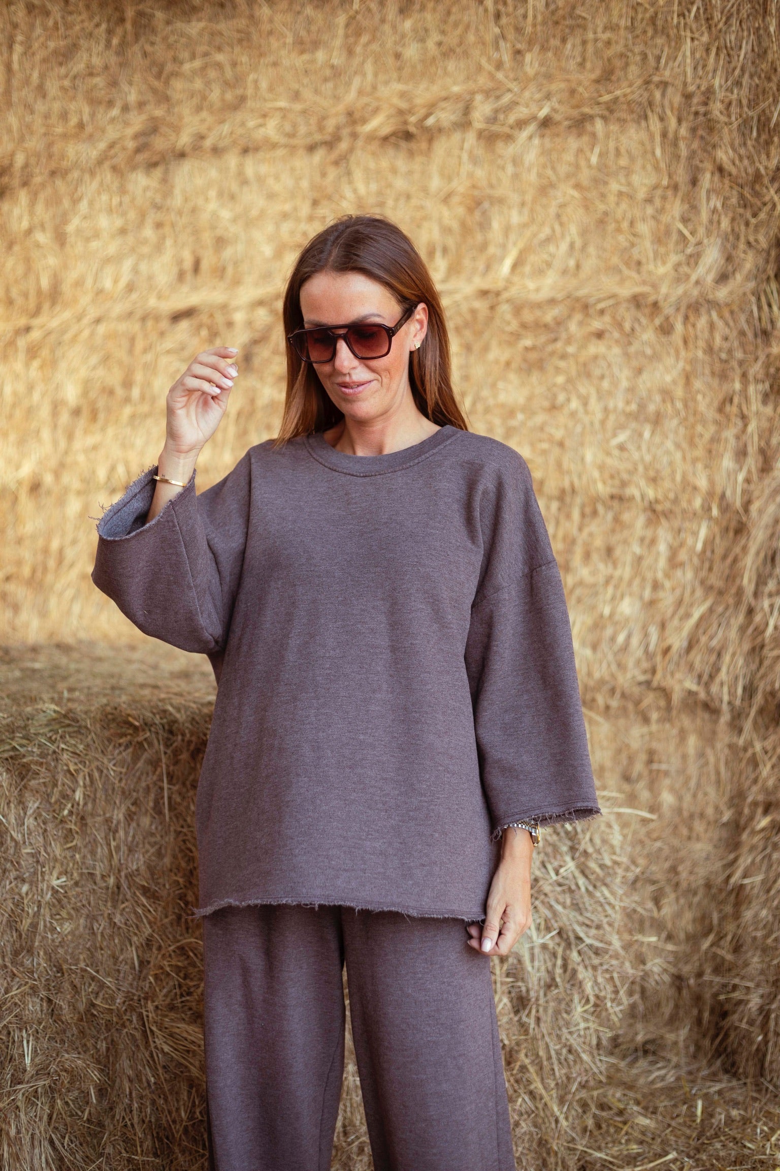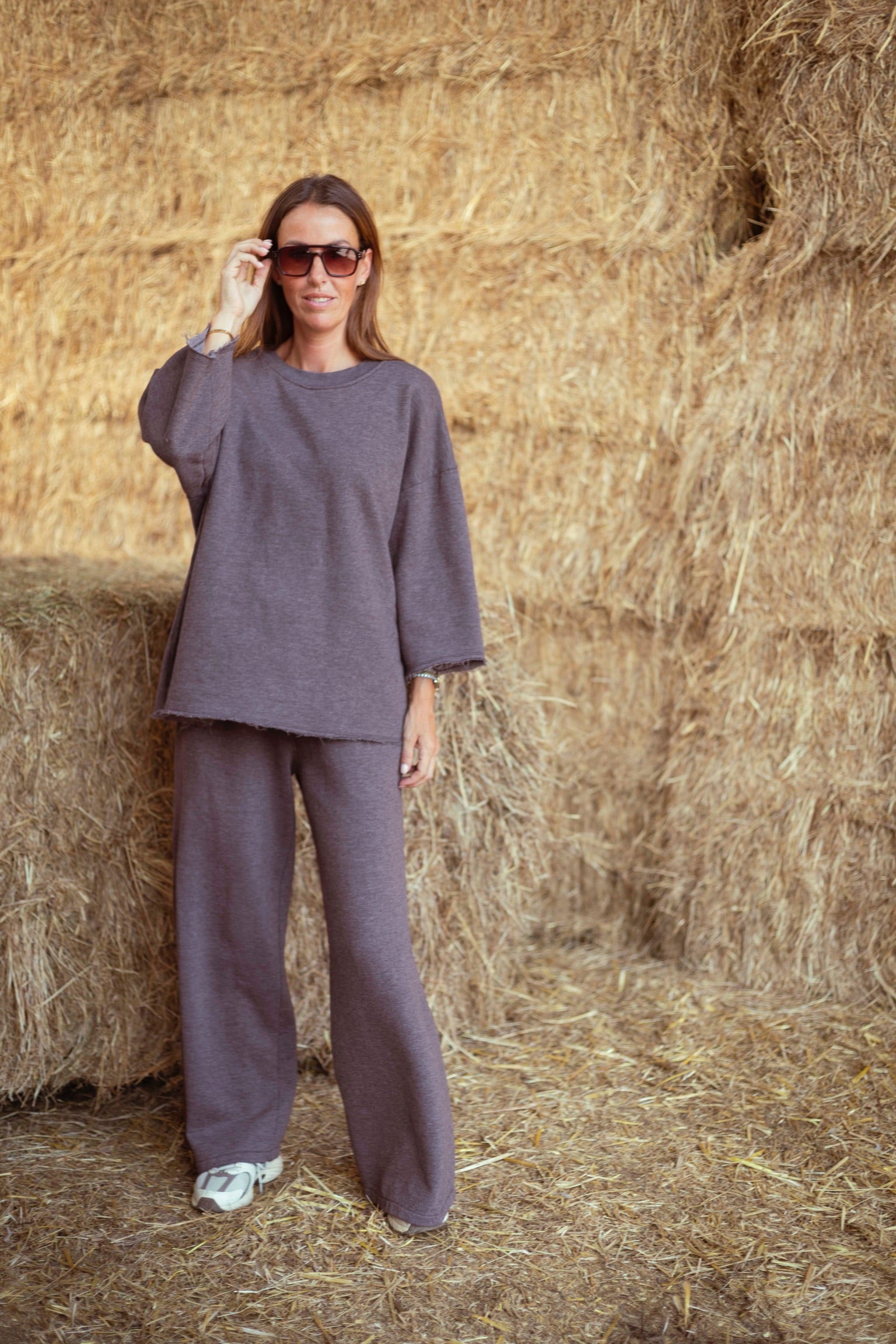 Een relaxte two-piece set bestaande uit een zacht t-shirt en een wijde broek, beide gemaakt uit comfortabele, soepelvallende stof. De losse snit en rustige uitstraling maken dit ensemble ideaal voor luie herfstdagen of stijlvolle momenten van ontspanning. Draag samen voor een complete look, of combineer apart voor eindeloze herfstcombinaties.