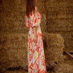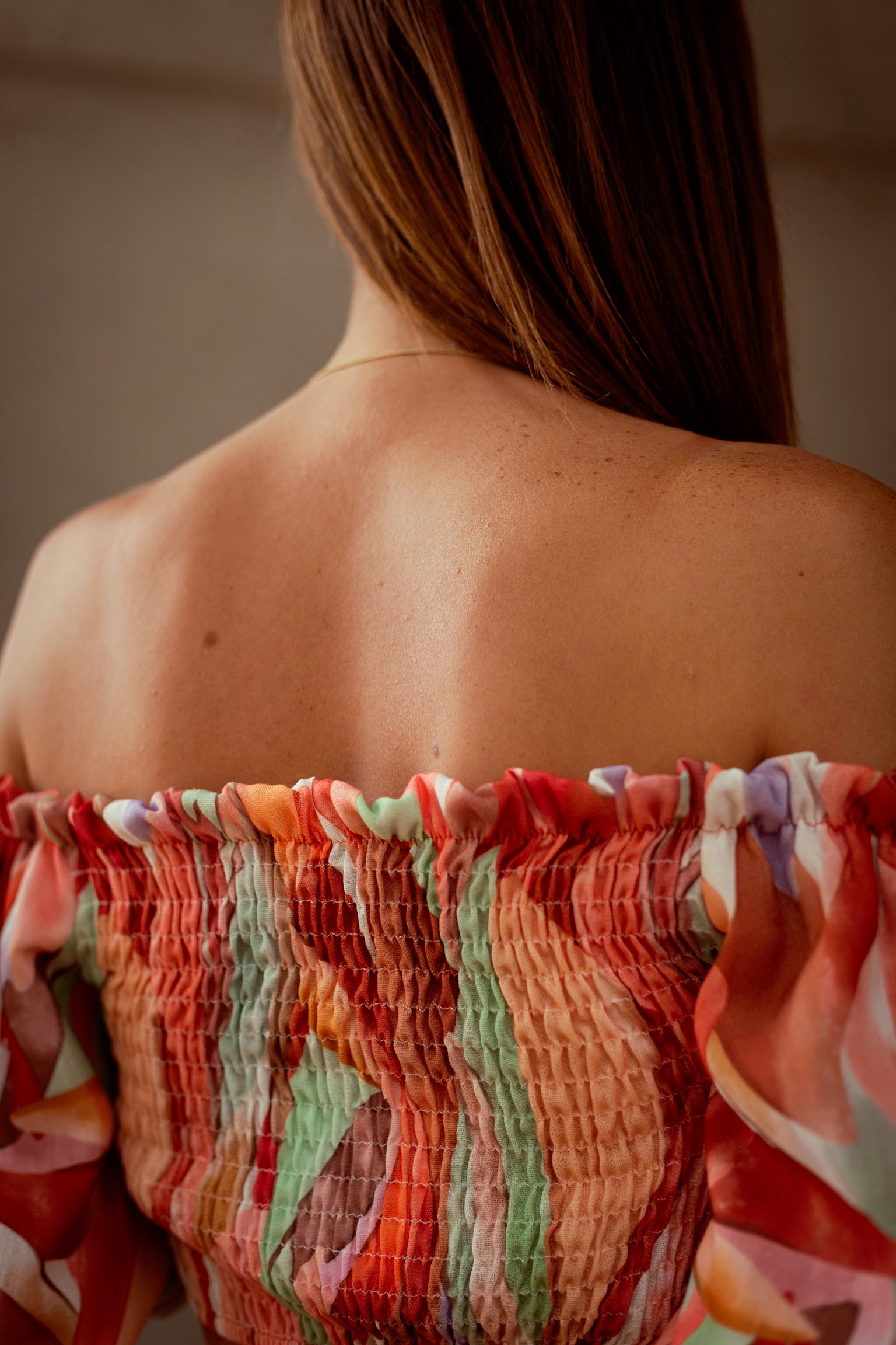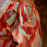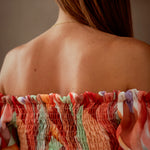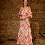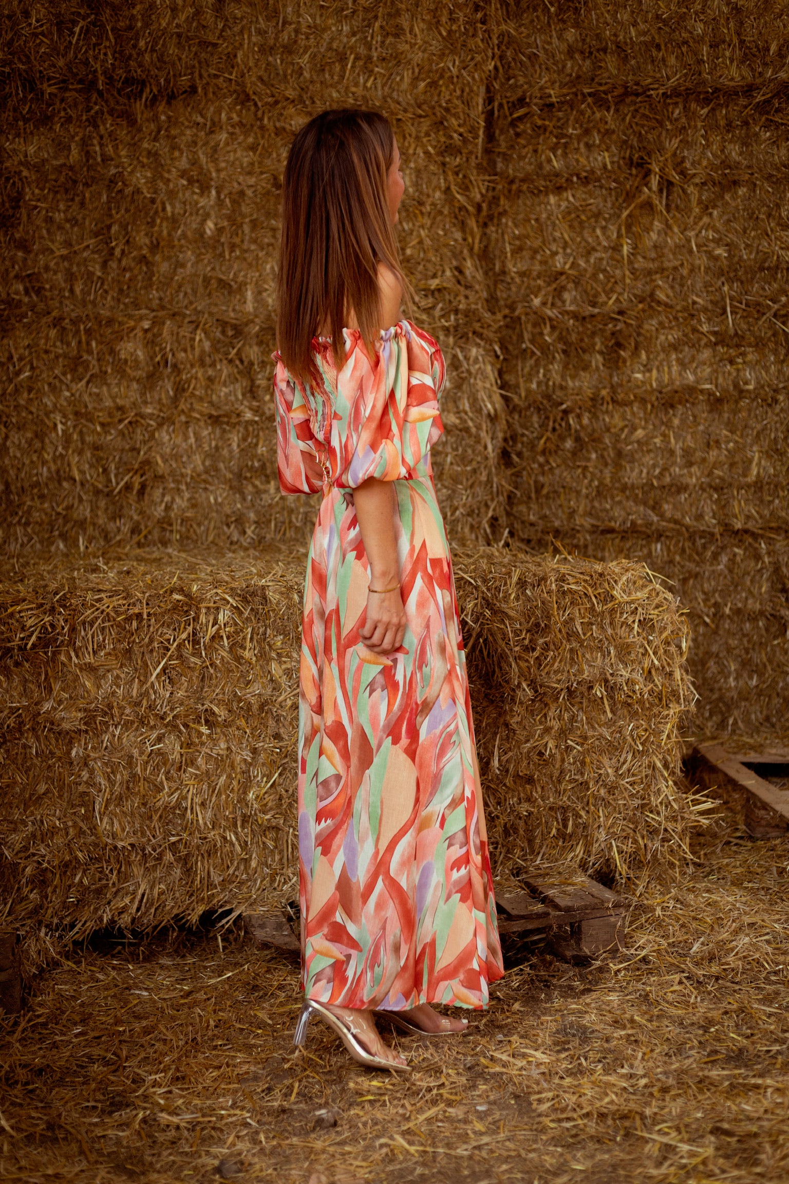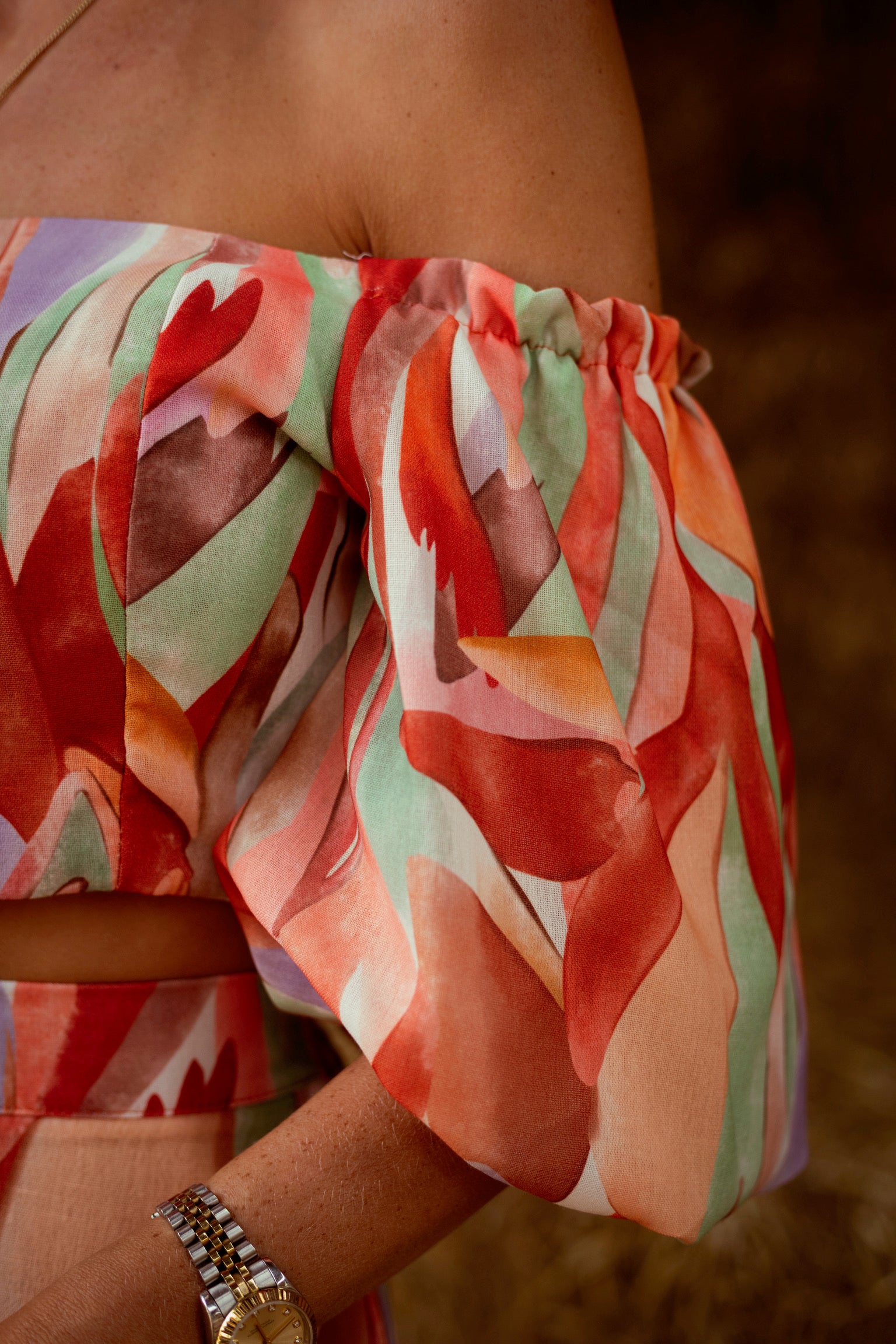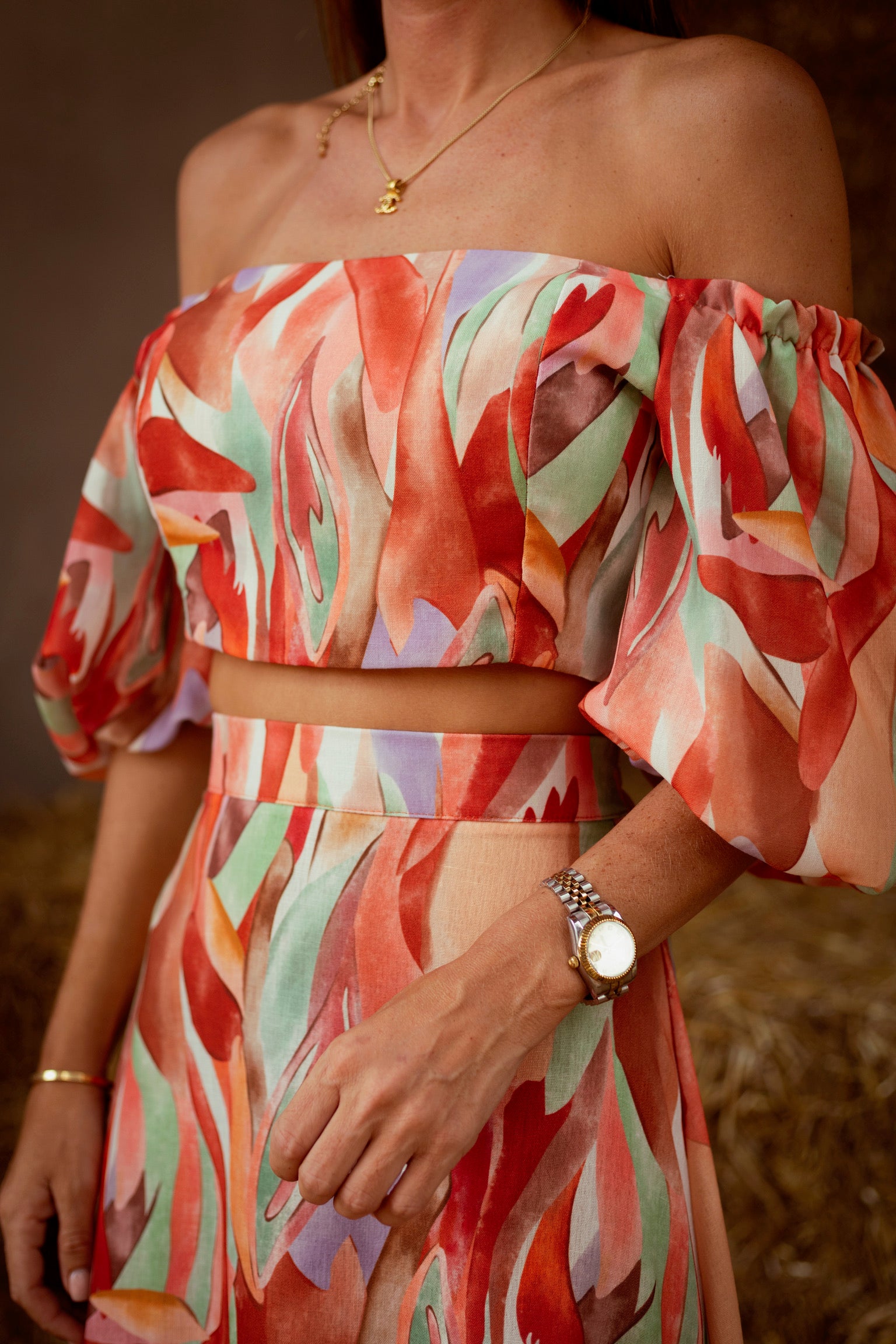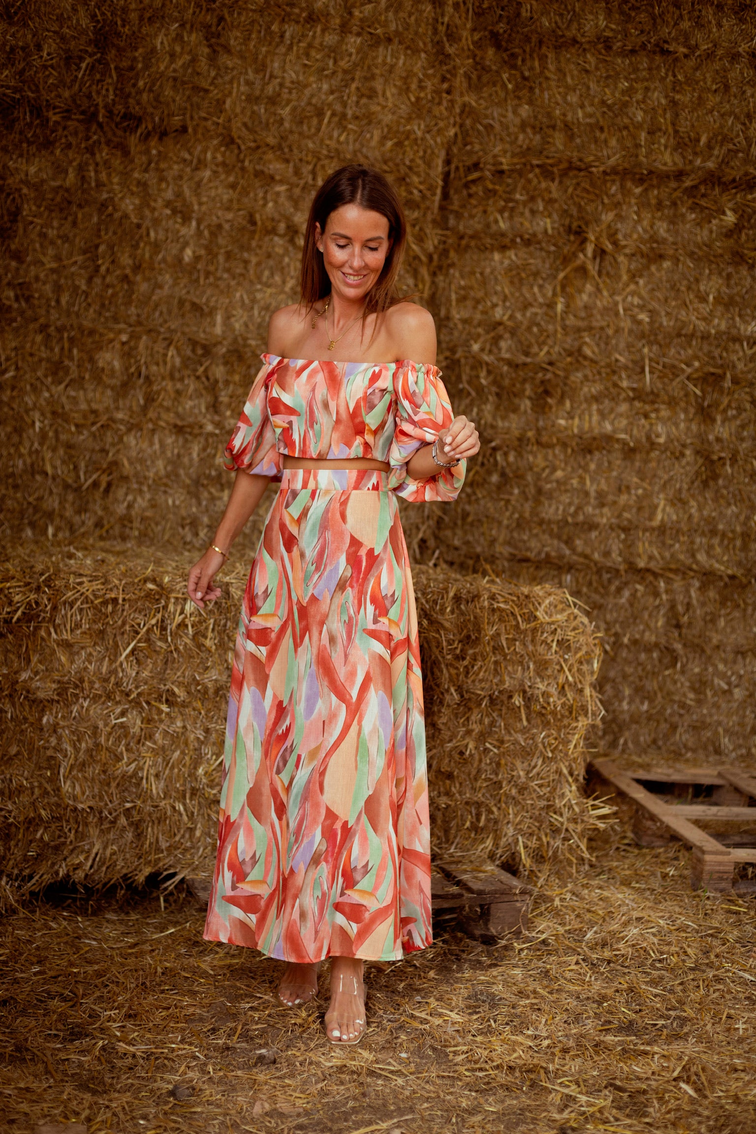 Een betoverende set in warme herfsttinten met een unieke print van roest, munt en lila die meteen in het oog springt. De lange rok gecombineerd met de off shoulder blouse zorgt voor een elegante maar relaxte uitstraling. Ideaal voor een nazomerse dag of een sfeervol herfstevent.