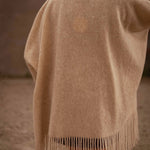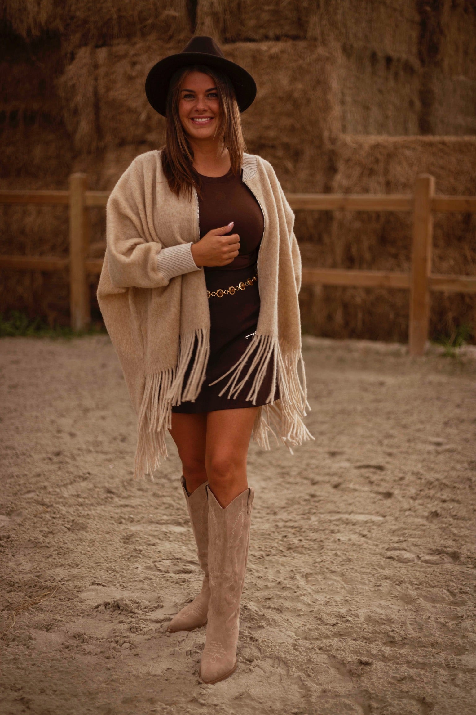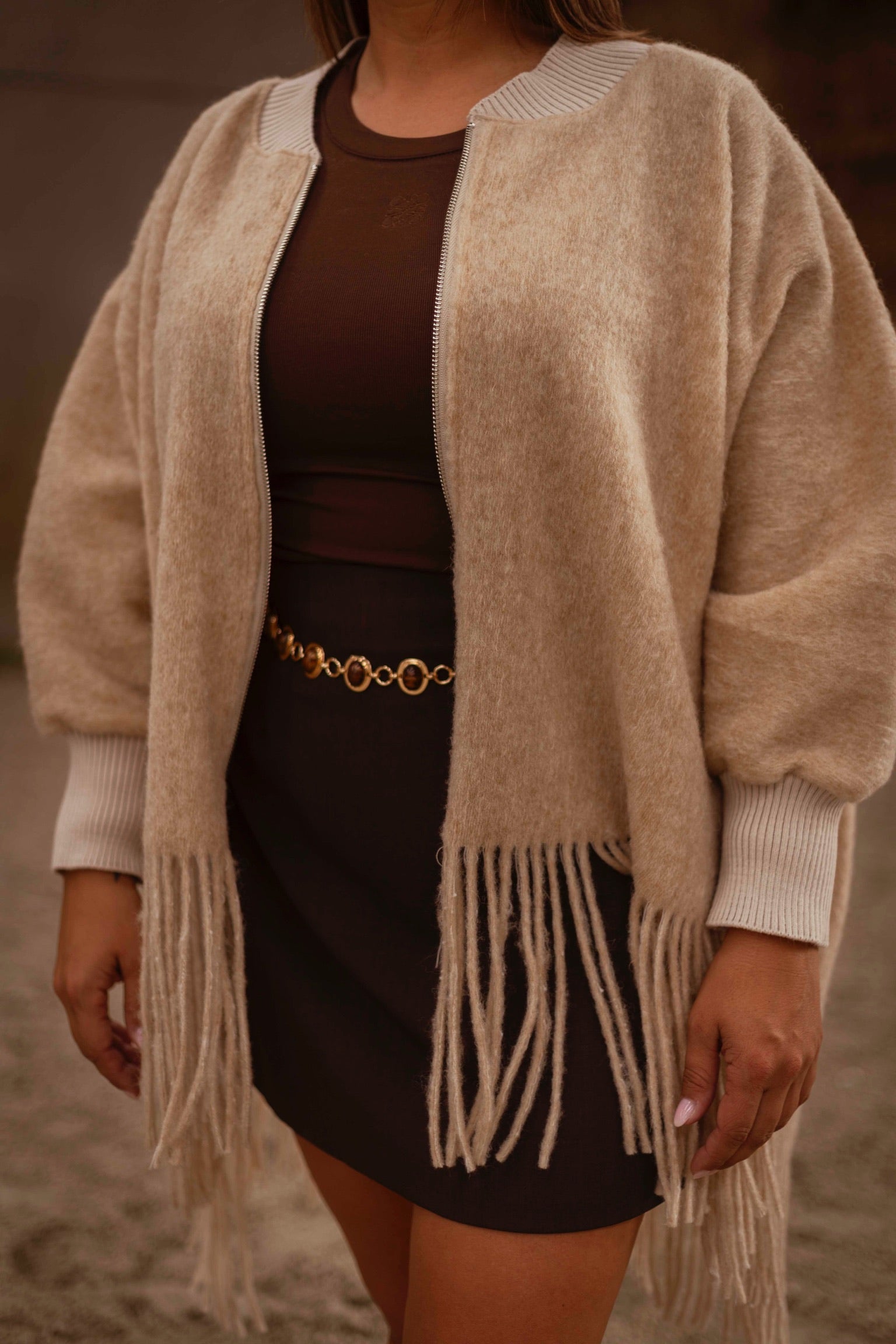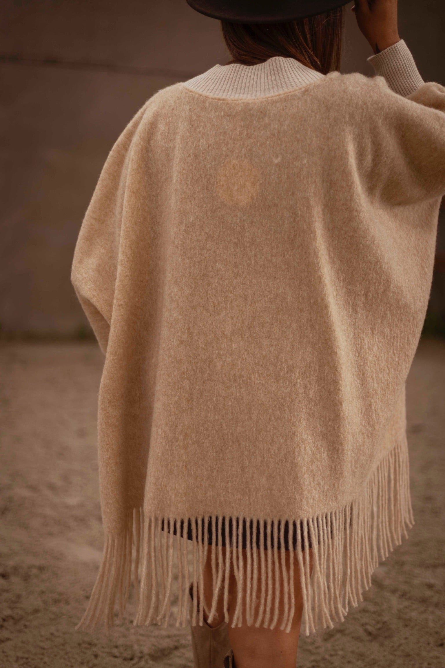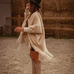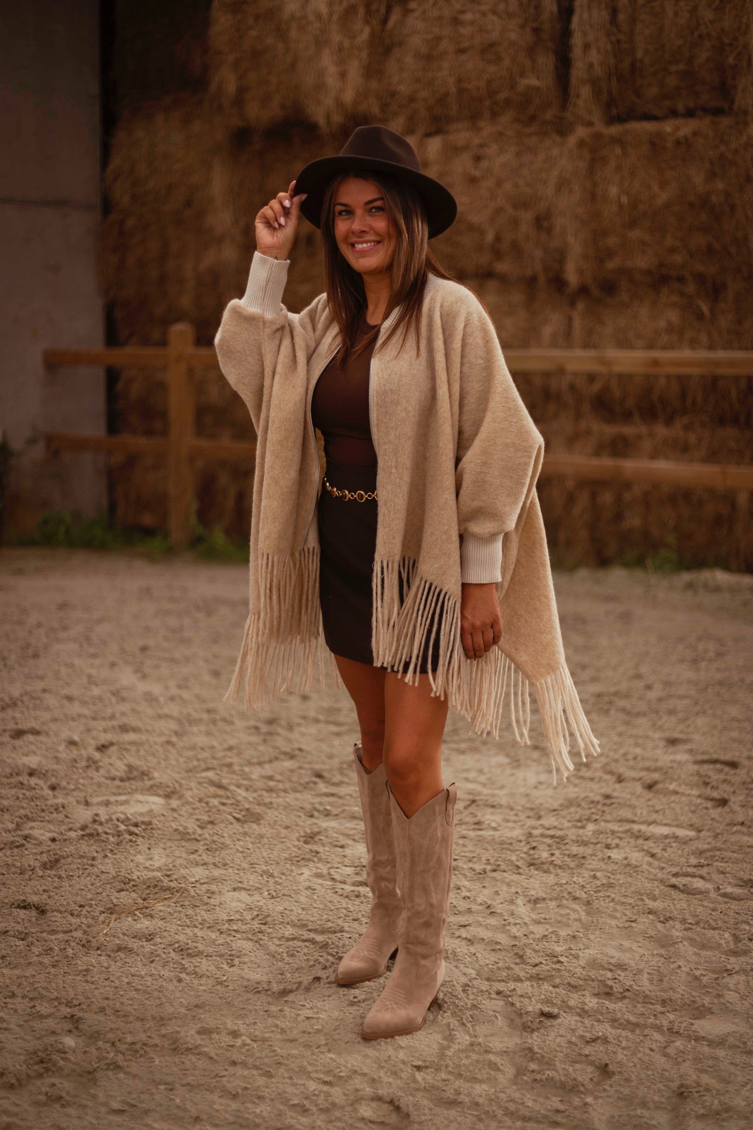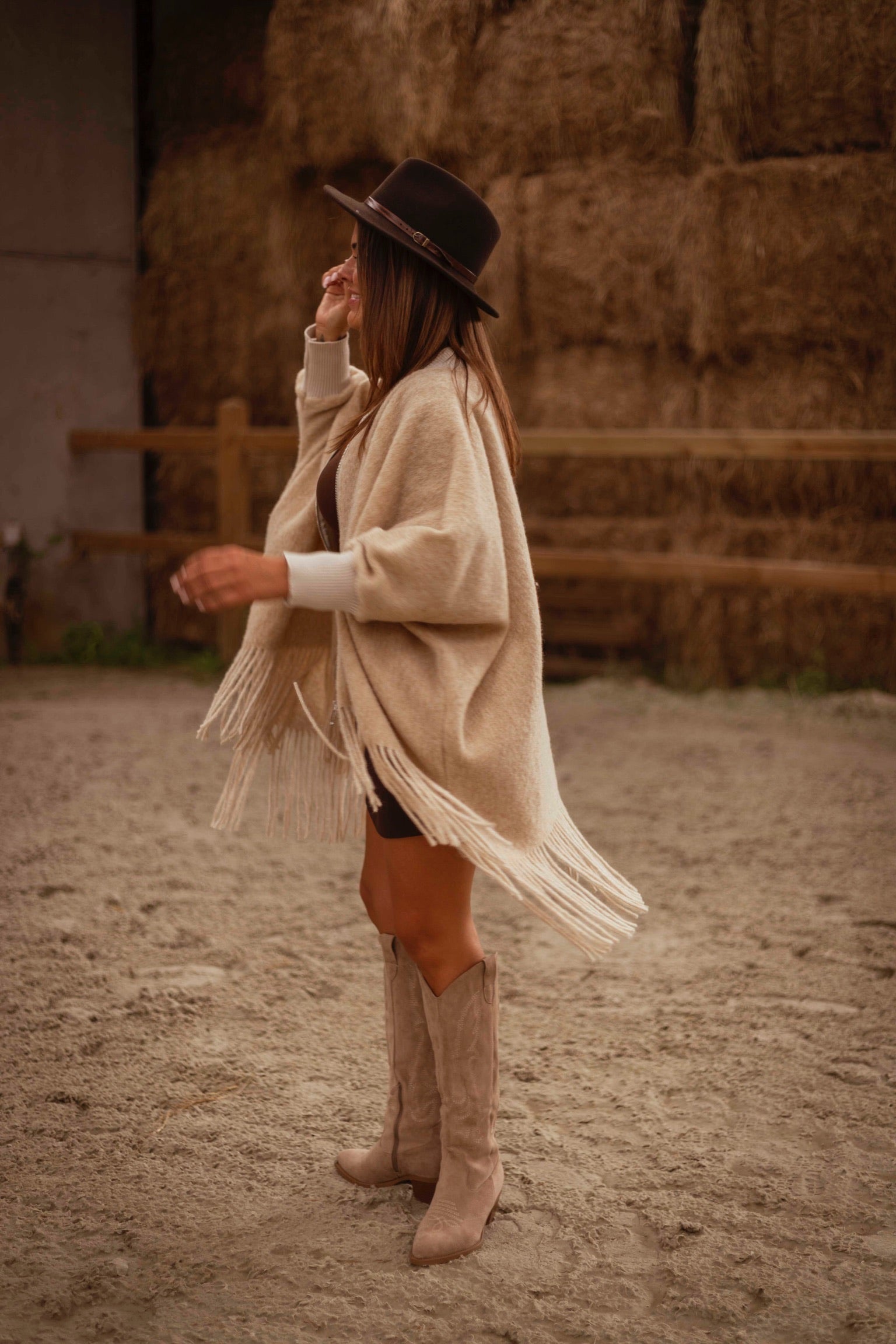 Een beige poncho met speelse franjes die moeiteloos warmte en stijl combineert. Het losse silhouet maakt dit item ideaal om over truien of jurken te dragen tijdens frisse herfstdagen.