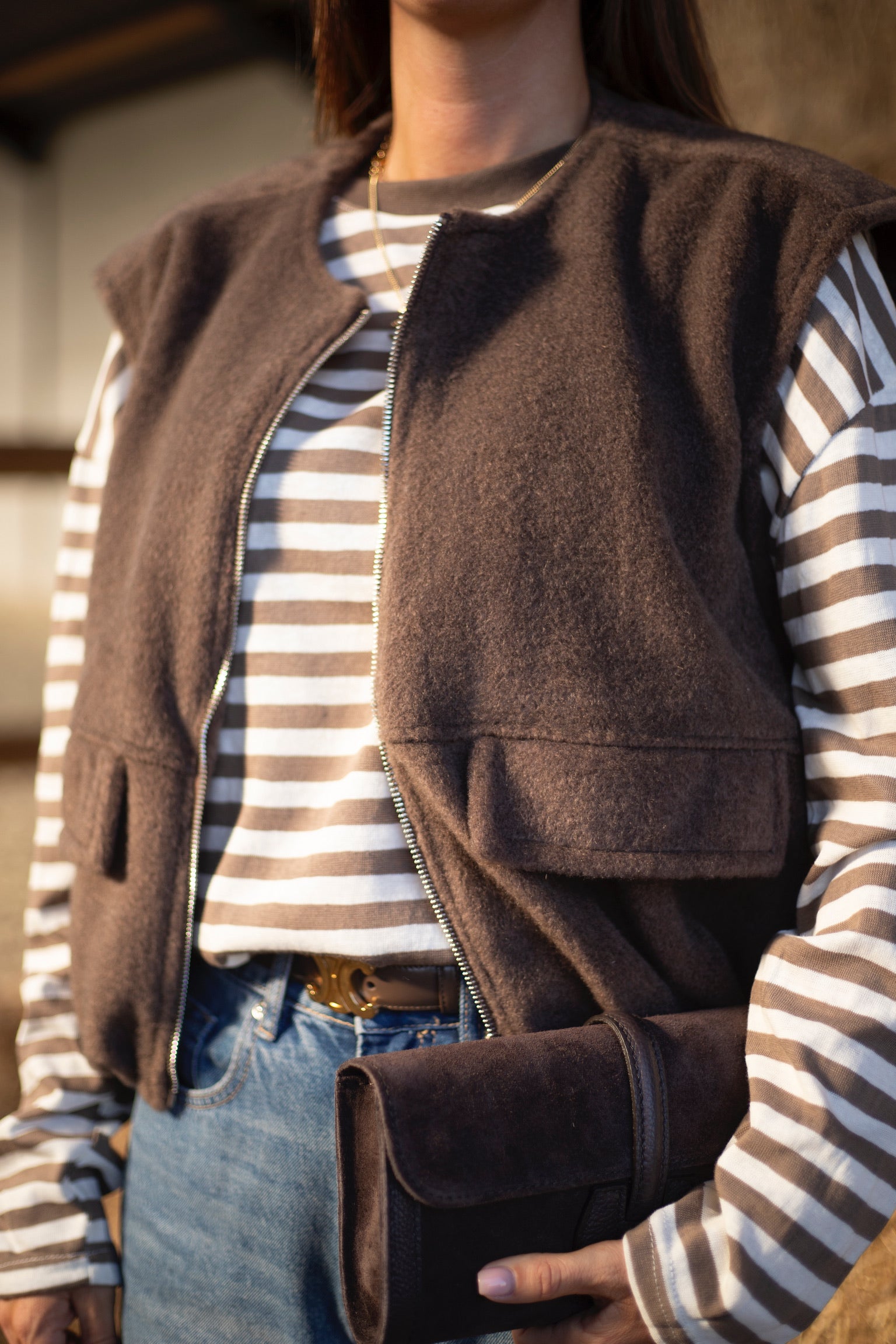Een zacht, mouwloos jasje in warme wol dat elke outfit meteen een stijlvolle laag geeft. Ideaal om over een t-shirt of trui te dragen, maar net zo mooi als topstuk op zichzelf. Verkrijgbaar in meerdere kleuren voor elke mood of look.