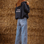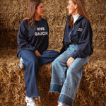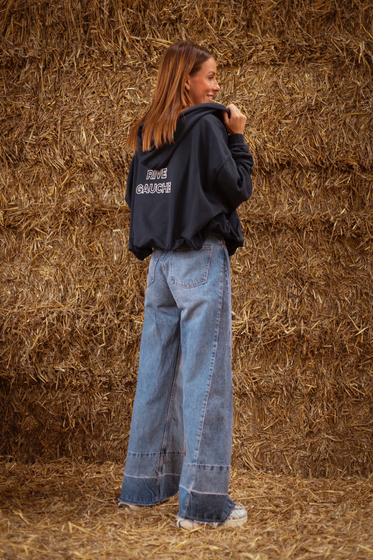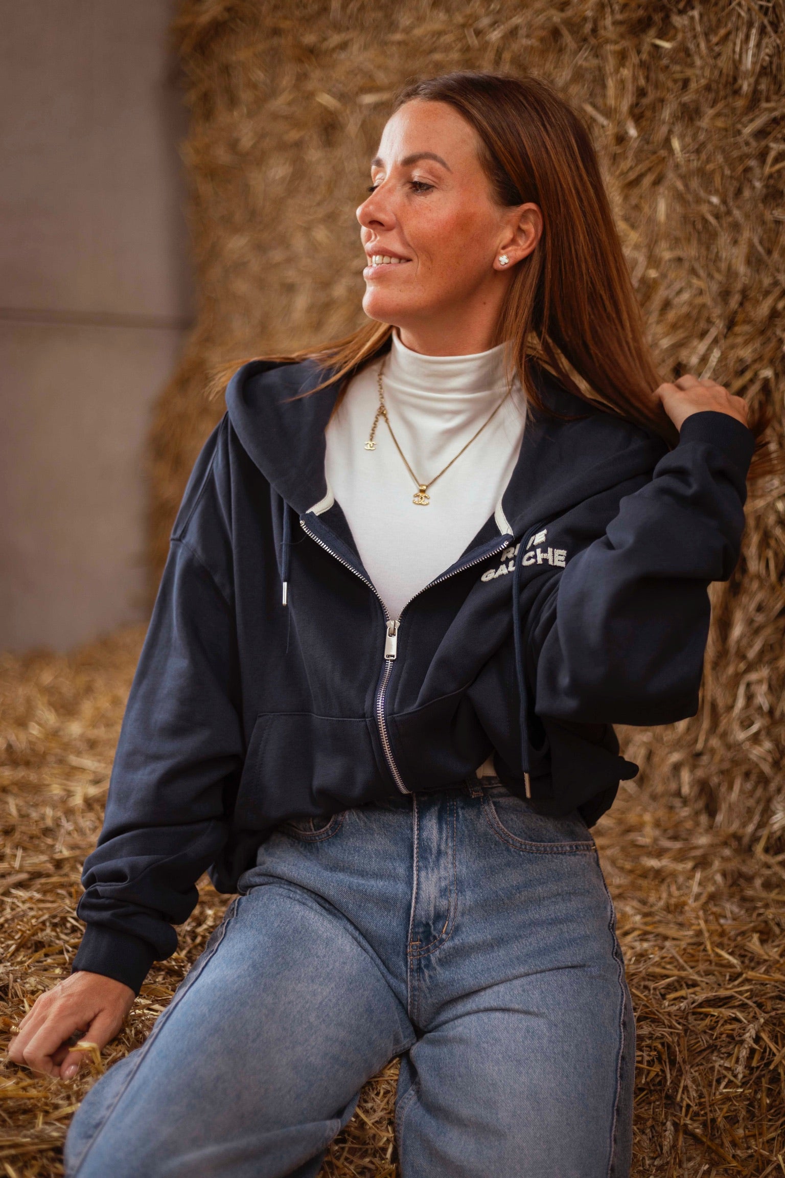 Een donkerblauwe essential met een stijlvolle twist, afgewerkt met een subtiele rits en het herkenbare opschrift. De stof voelt stevig maar soepel, perfect om tussen de seizoenen door te dragen. Combineer met denim of draag open over een jurk voor een moeiteloze herfstlook.
