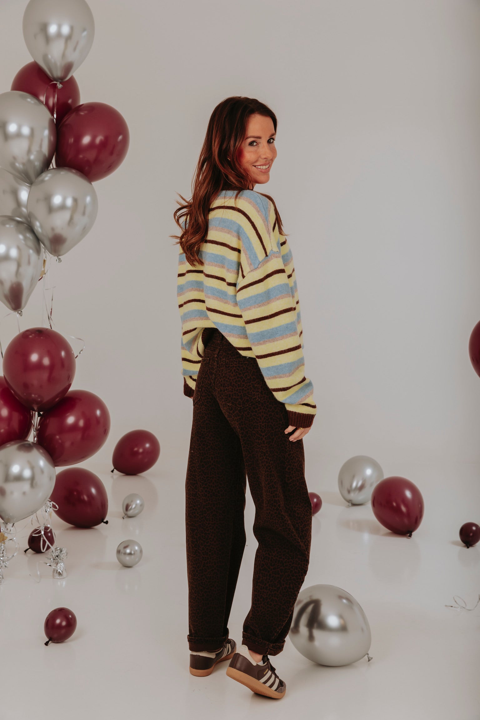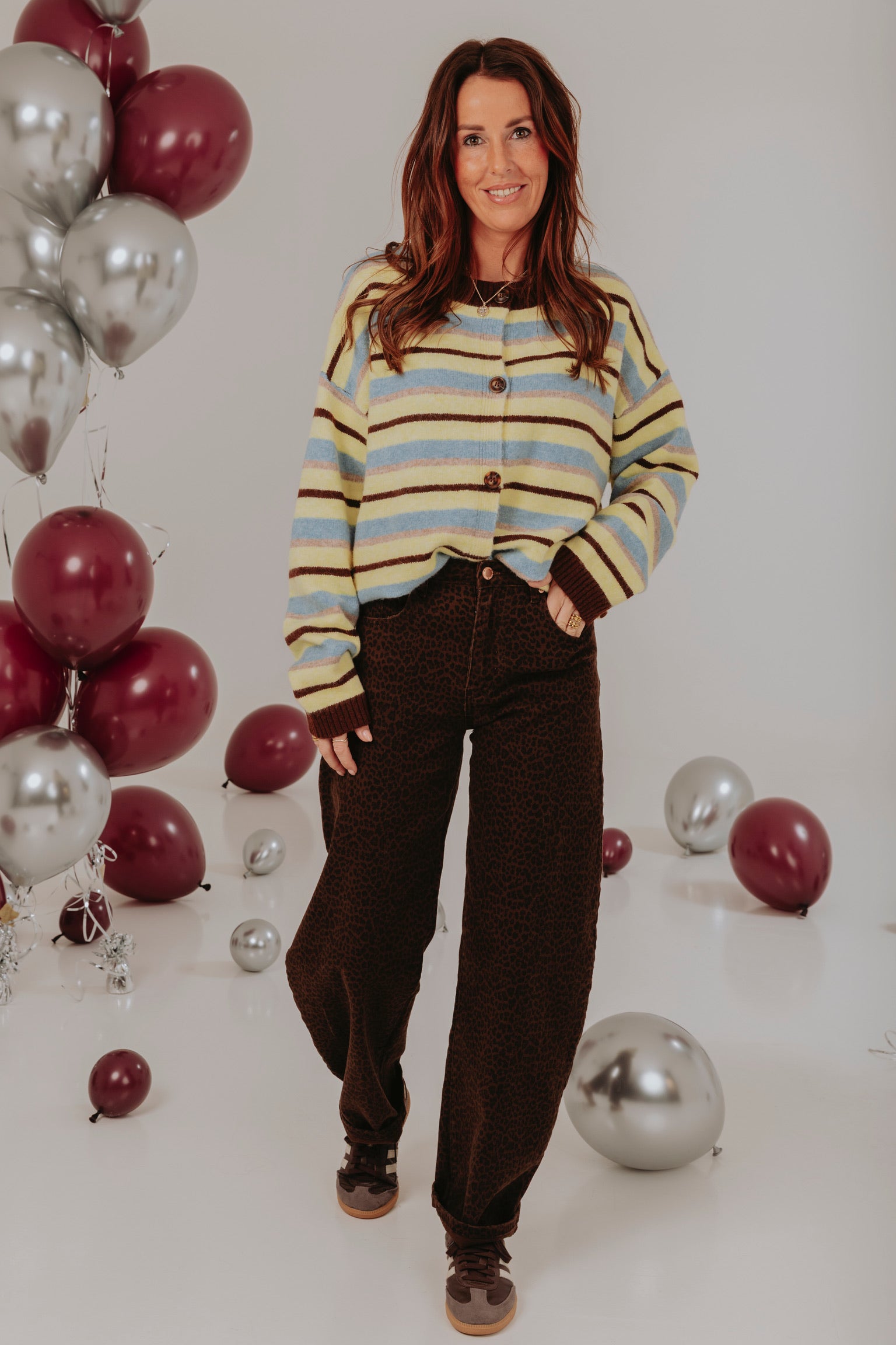 Dit vest voelt heerlijk zacht aan en krijgt een vrolijke uitstraling door de frisse gele strepen die meteen energie geven. Het speelse model omhult je comfortabel en zorgt voor een warm en feestelijk accent bij elke look.