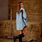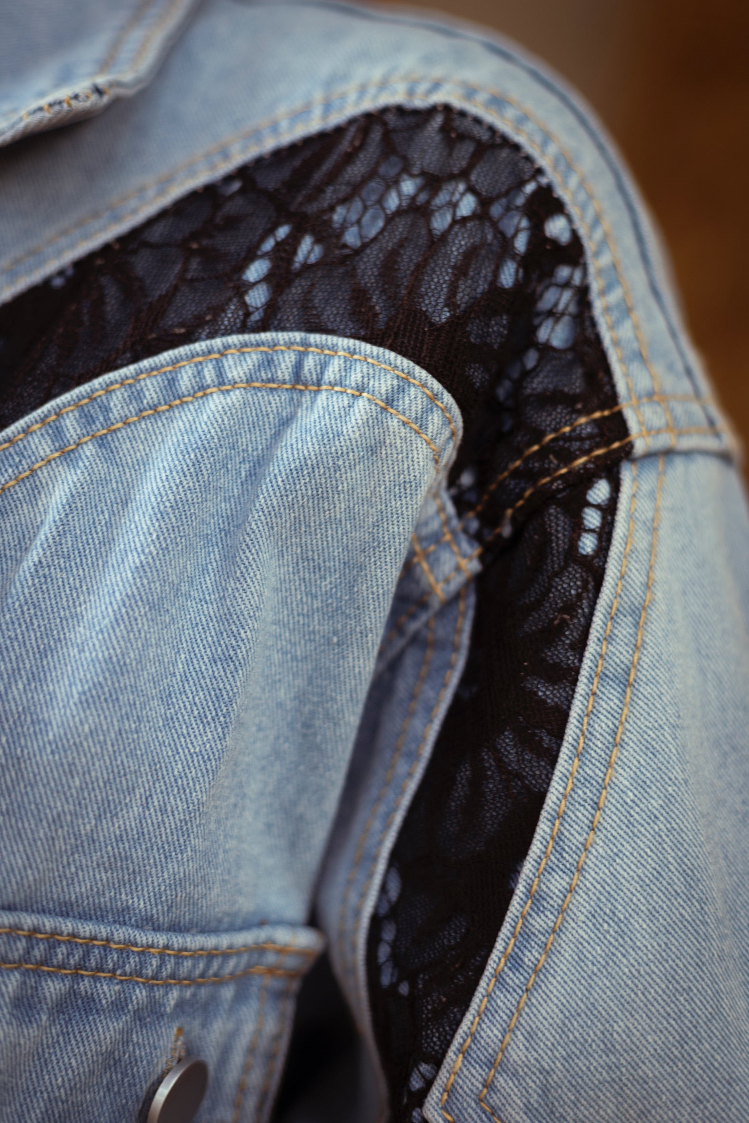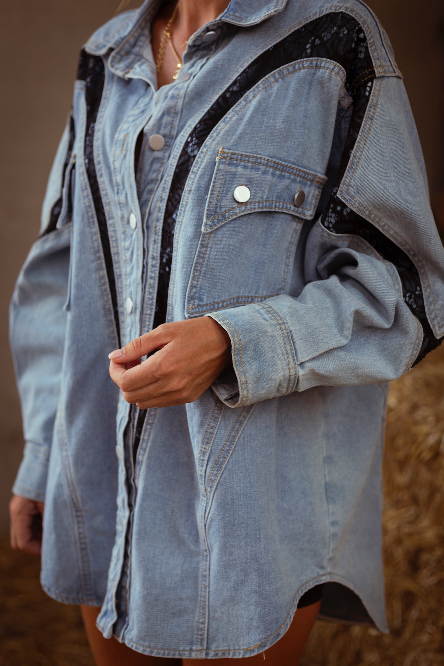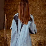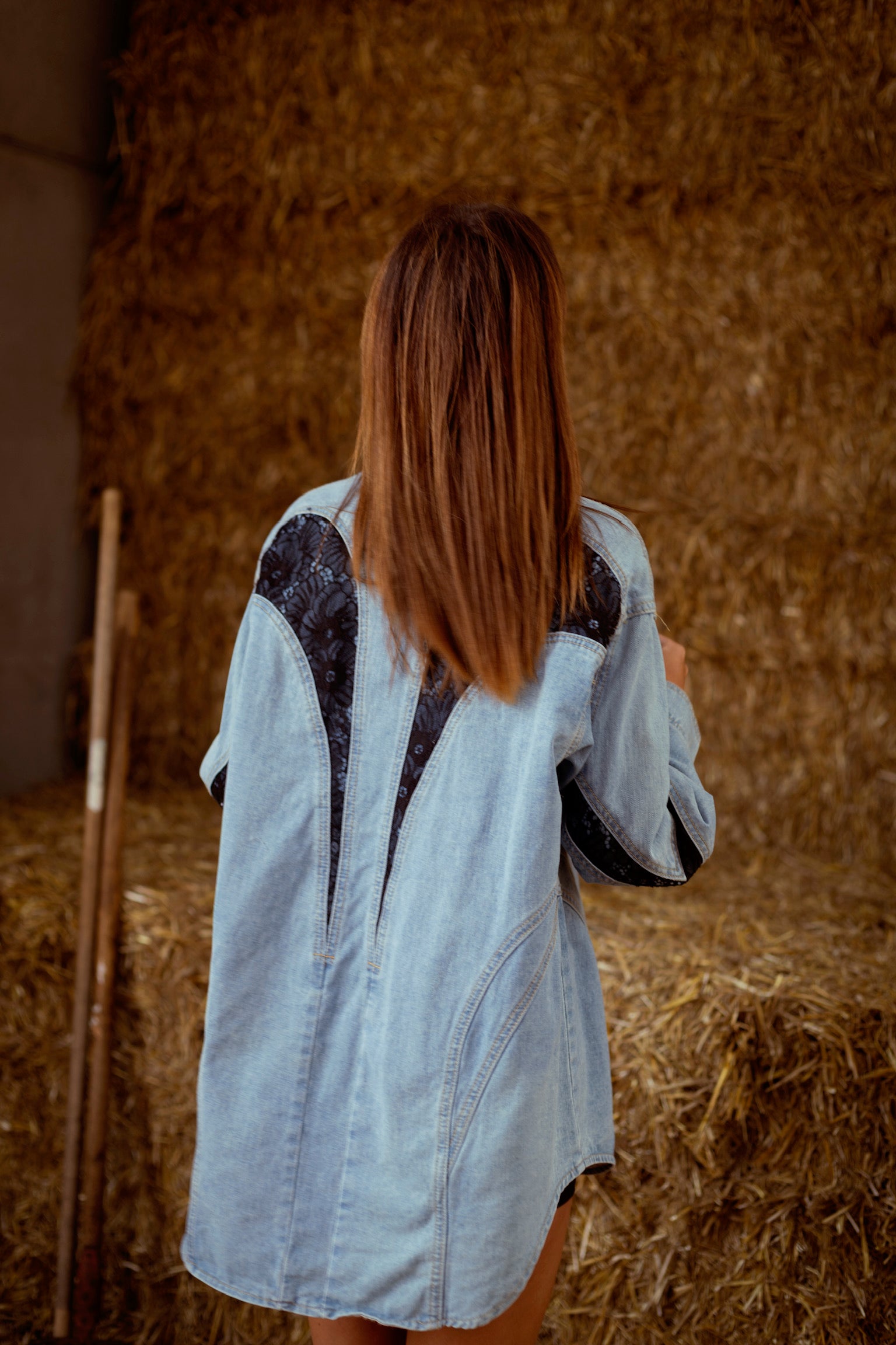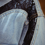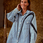 Deze eyecatcher combineert het stoere van denim met de verfijning van kanten details. De snit geeft het geheel een vrouwelijke powerlook, terwijl het kanten accent een verrassende twist toevoegt. Kan als korte jurk met iets onder gedragen worden of gewoon als denim jacket.
