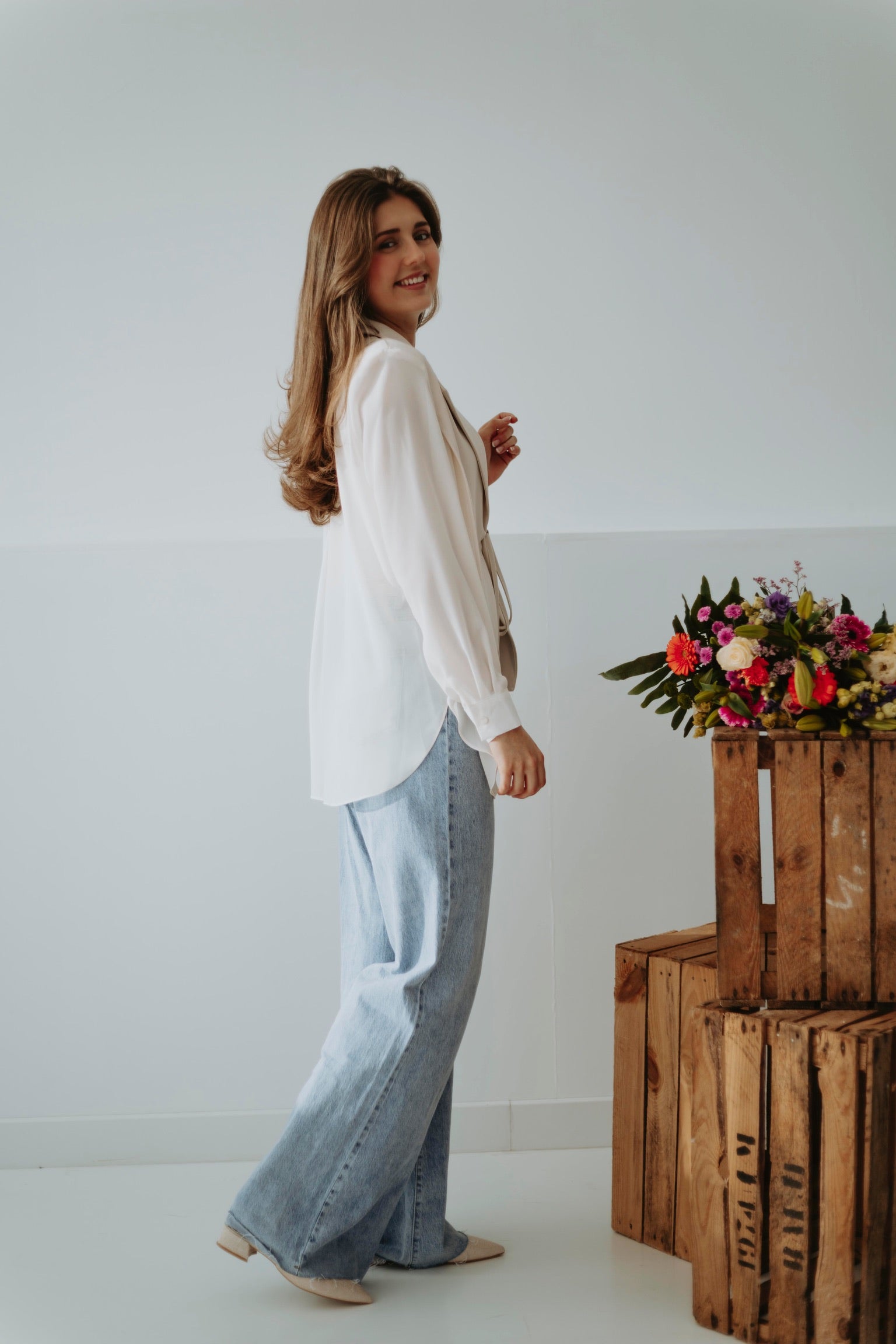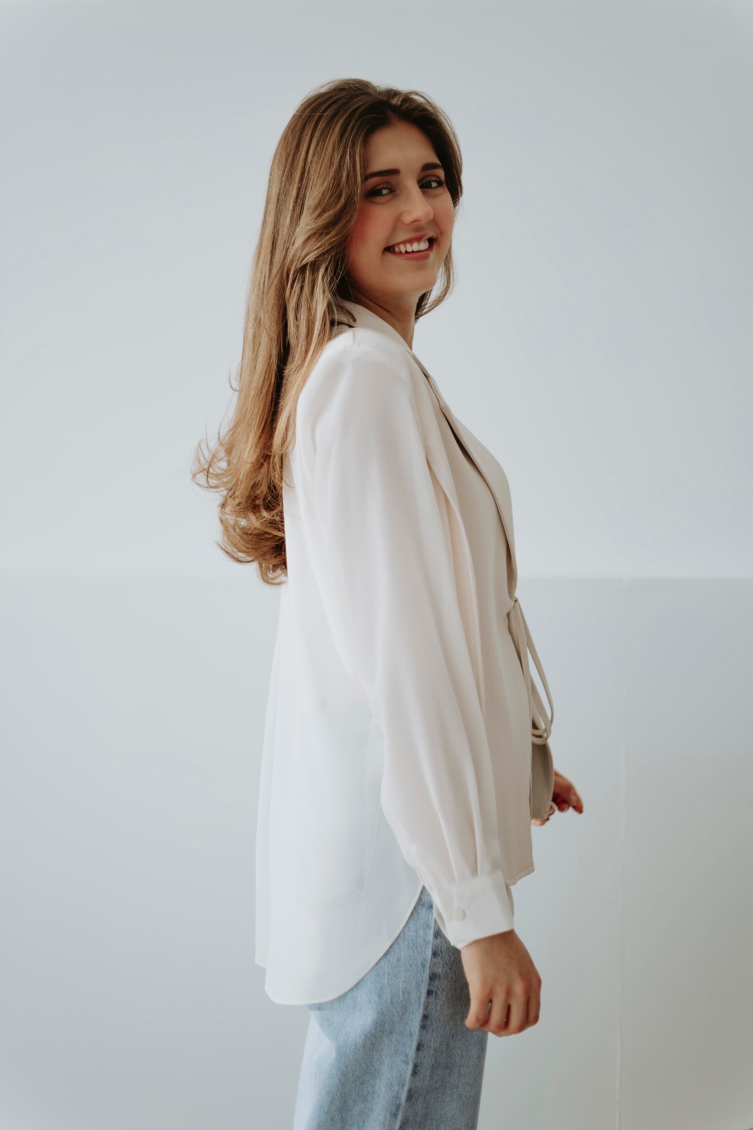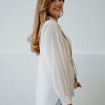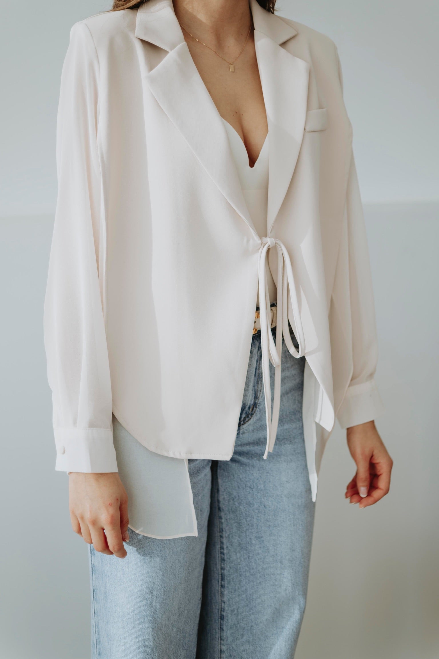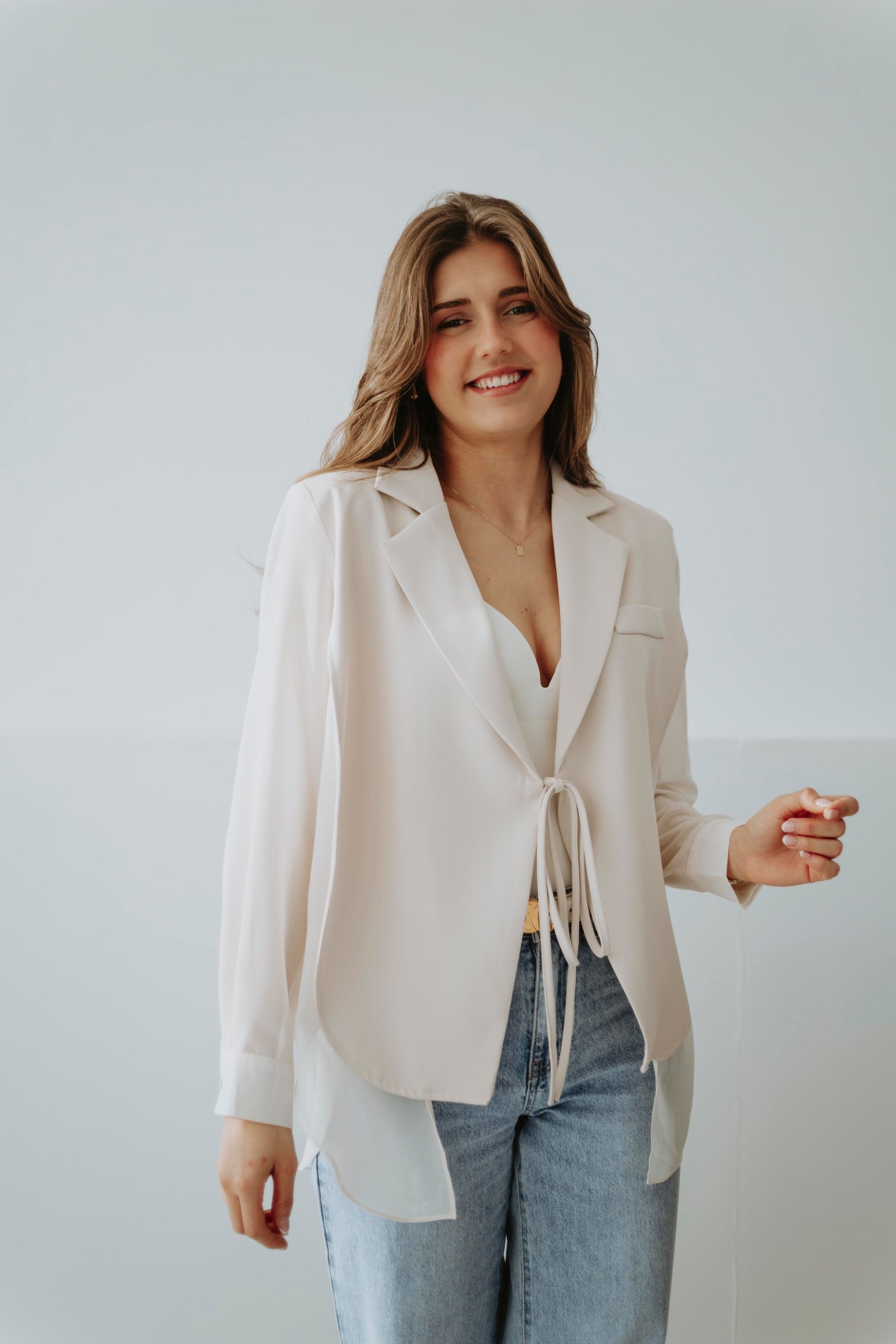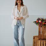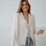 Een elegante blazer die je aan de buste kunt knopen voor een speels blouse-mouw effect. Verkrijgbaar in verschillende kleuren, perfect om lente-outfits een chique en vrouwelijke touch te geven. Licht en stijlvol, ideaal om moeiteloos te combineren met zowel broeken als rokken.