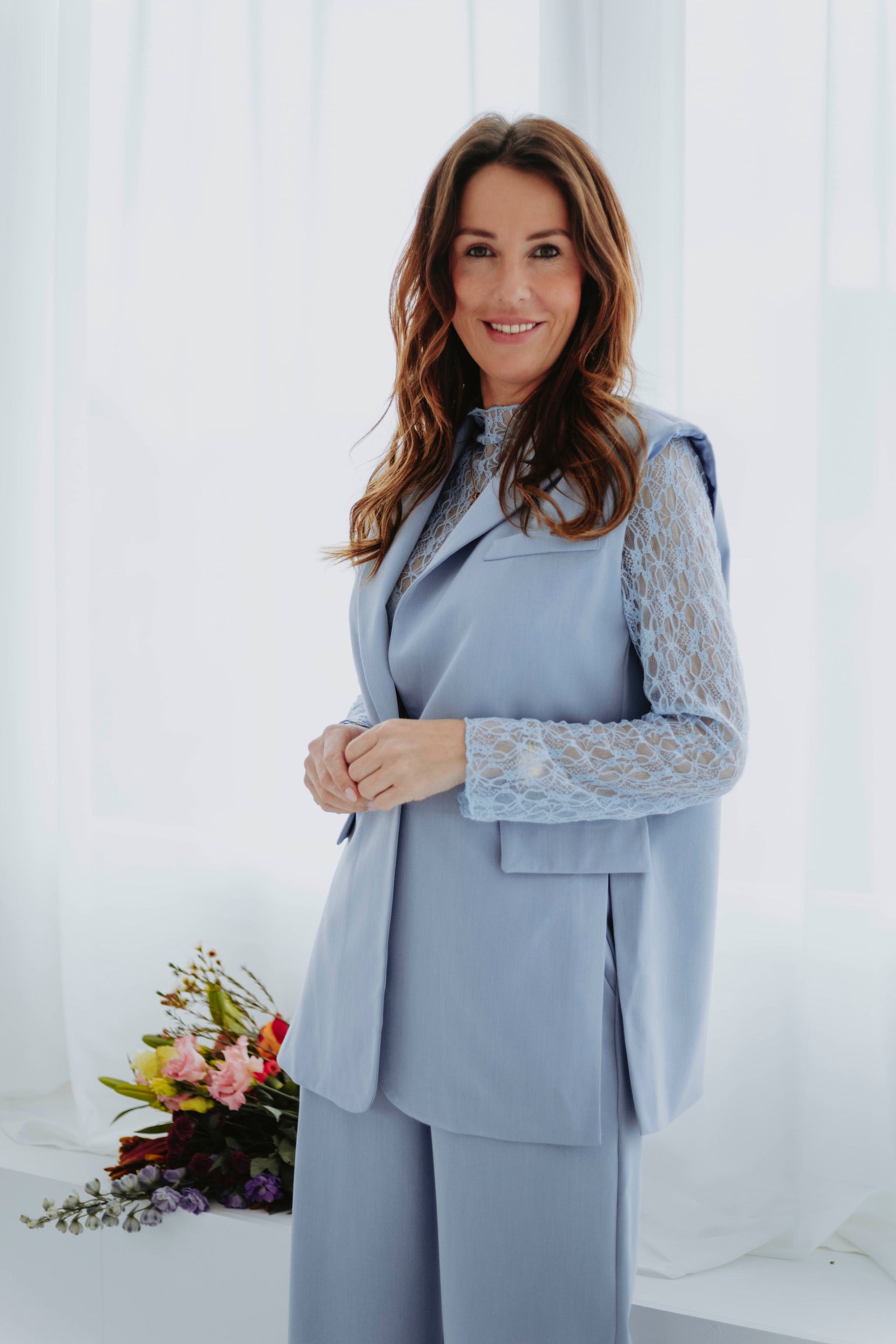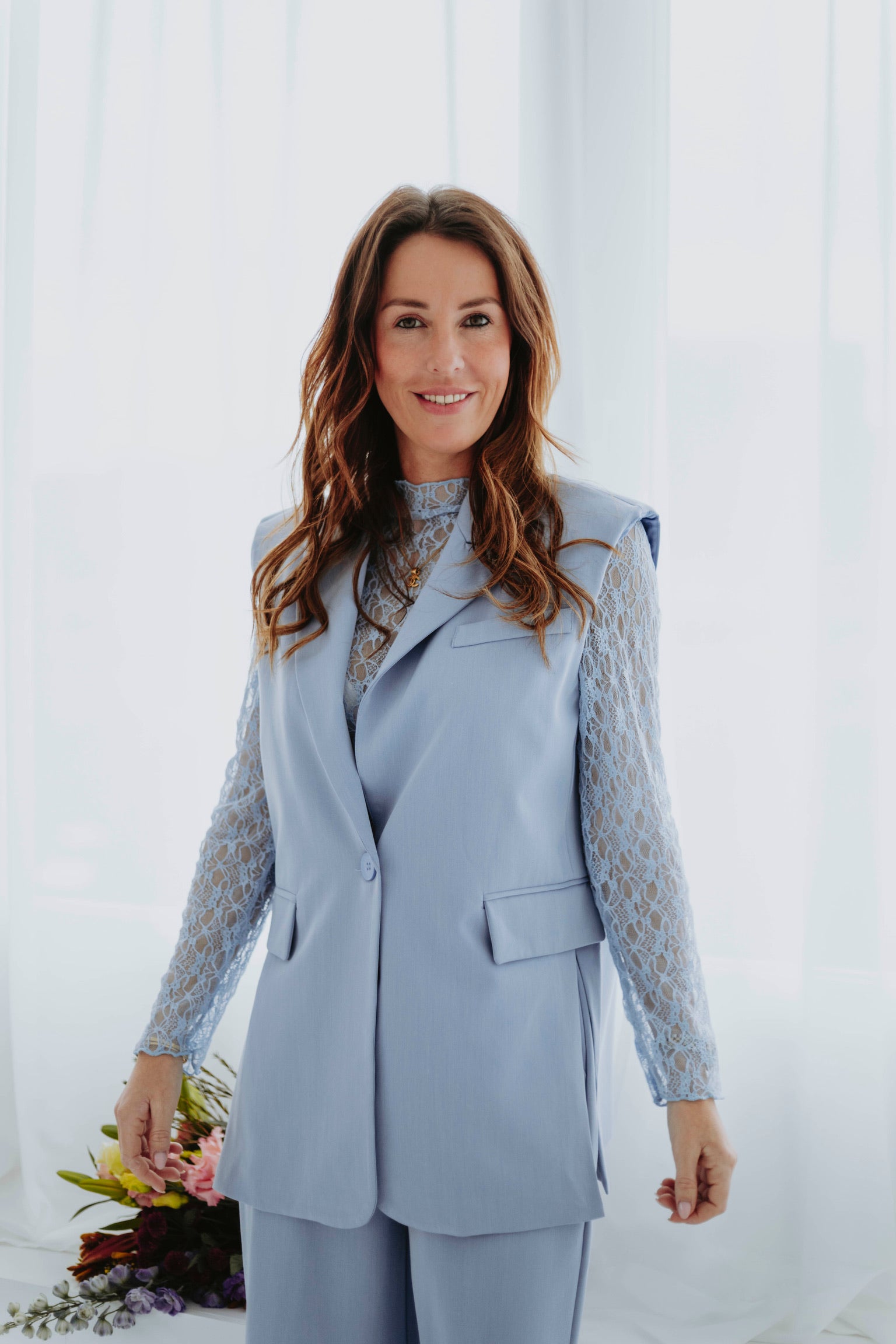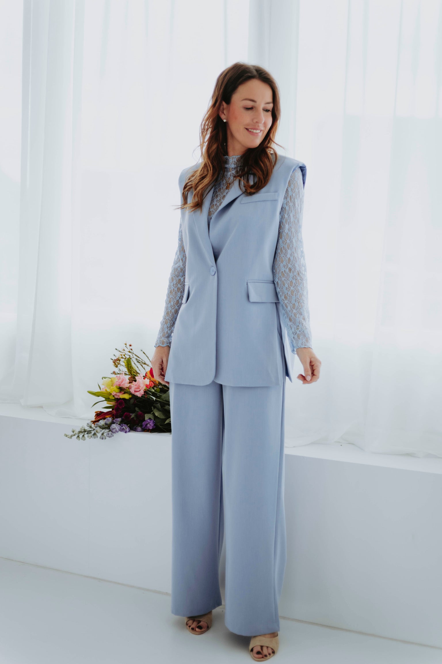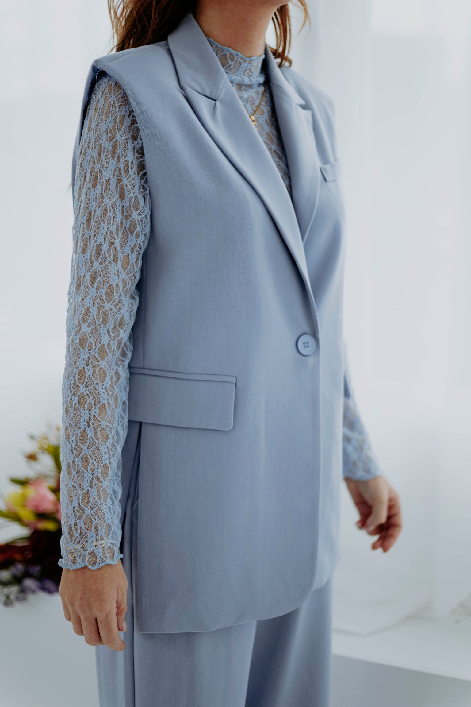 Een frisse, moderne blazer die perfect past bij het voorjaar. De zachte babyblauwe tint en het mouwloze silhouet geven je look een luchtige, elegante uitstraling. Ideaal om te layeren of solo te dragen op zonnige dagen.