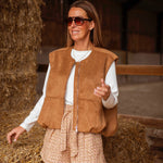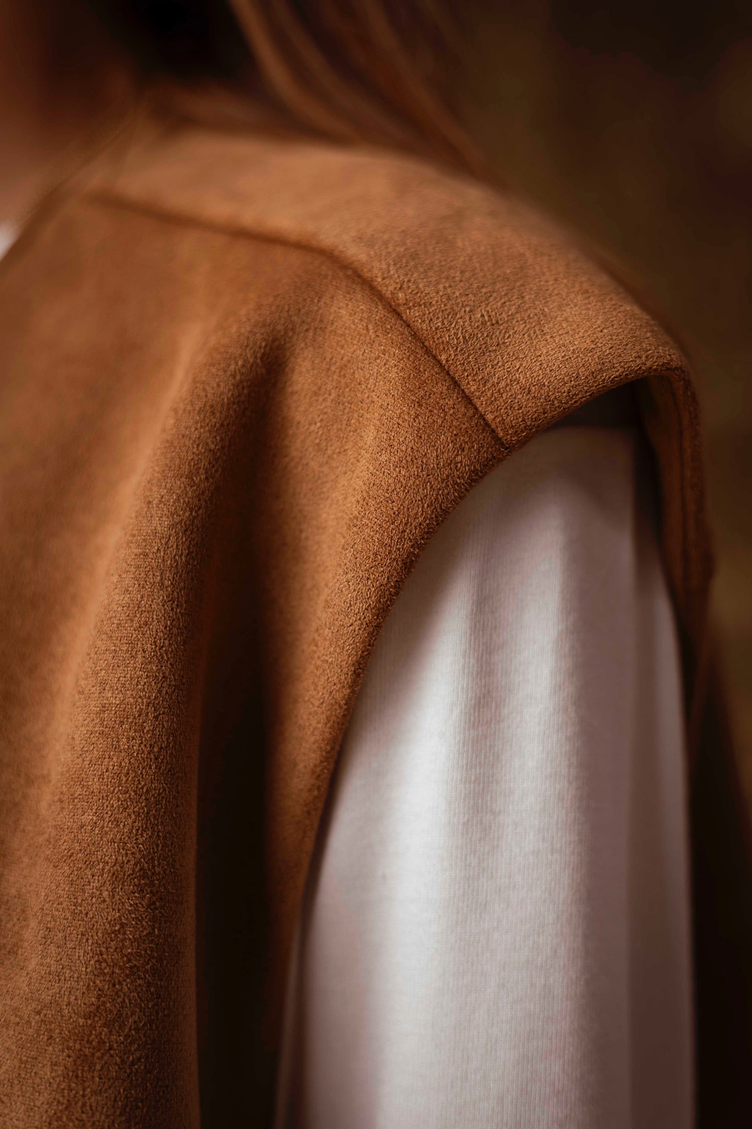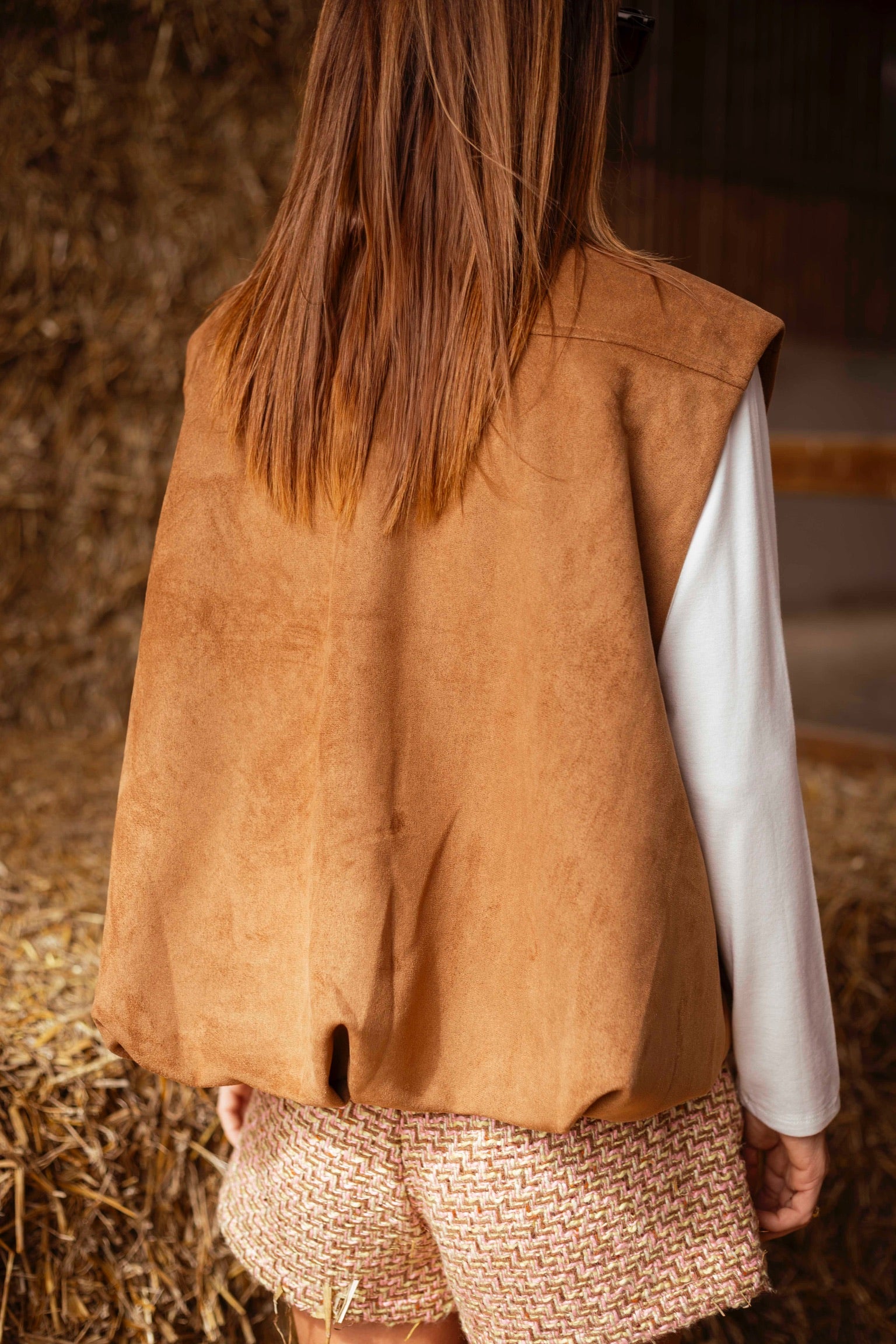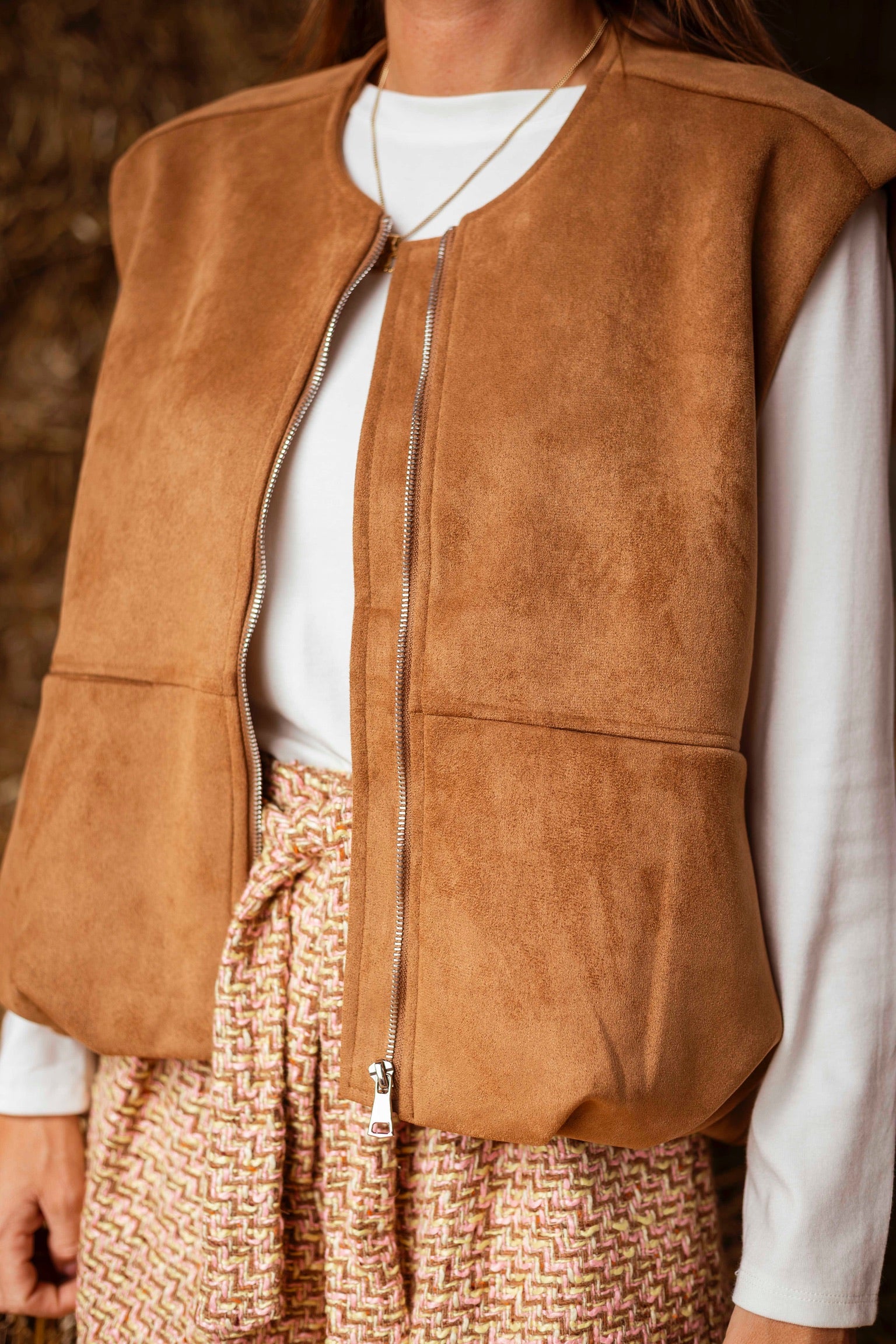 Een mouwloos jasje in zachte camel suède dat een stoere maar verfijnde uitstraling geeft. Perfect om over een knit of blouse te dragen en zo een gelaagde, herfstige look te creëren.