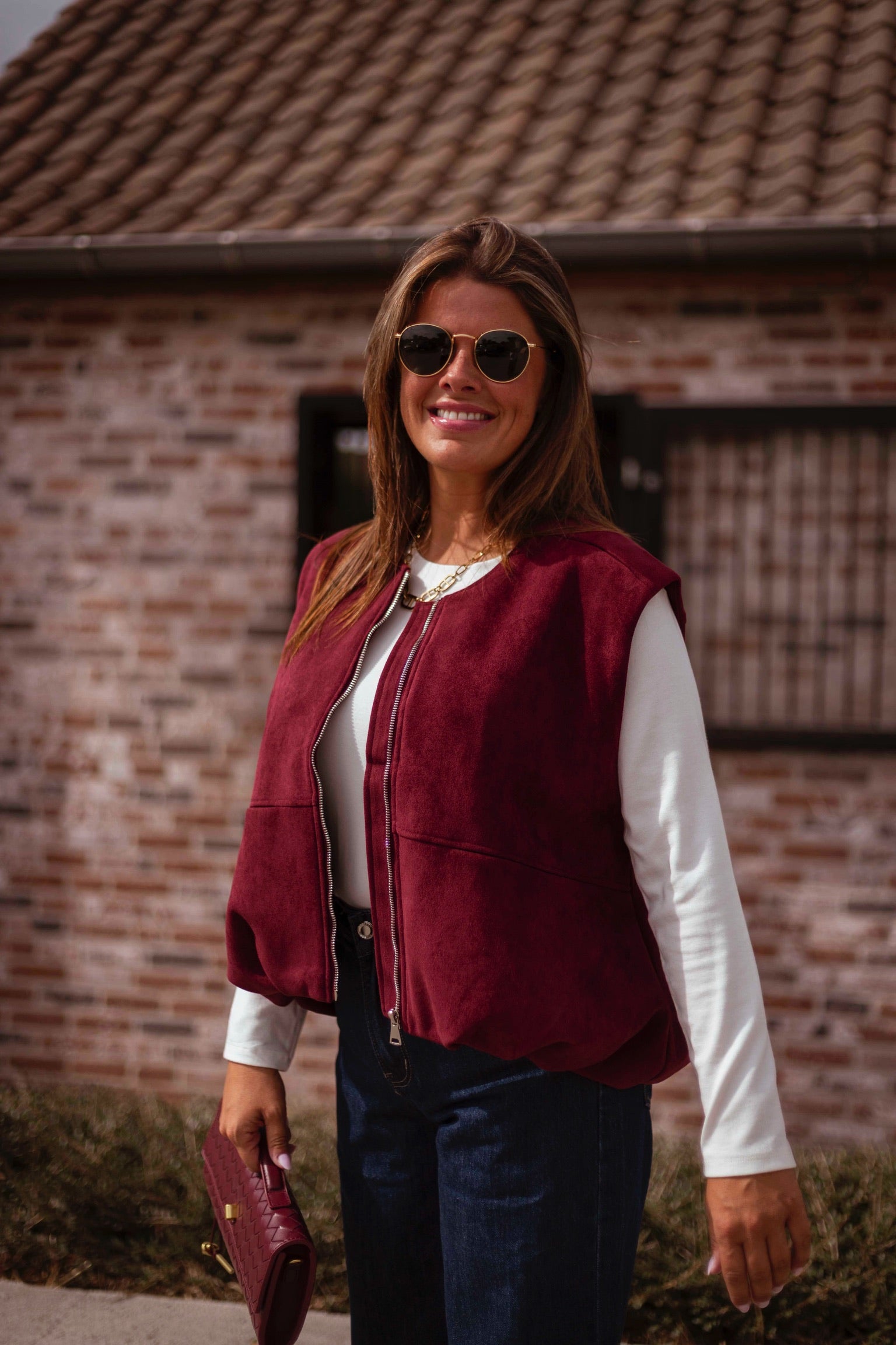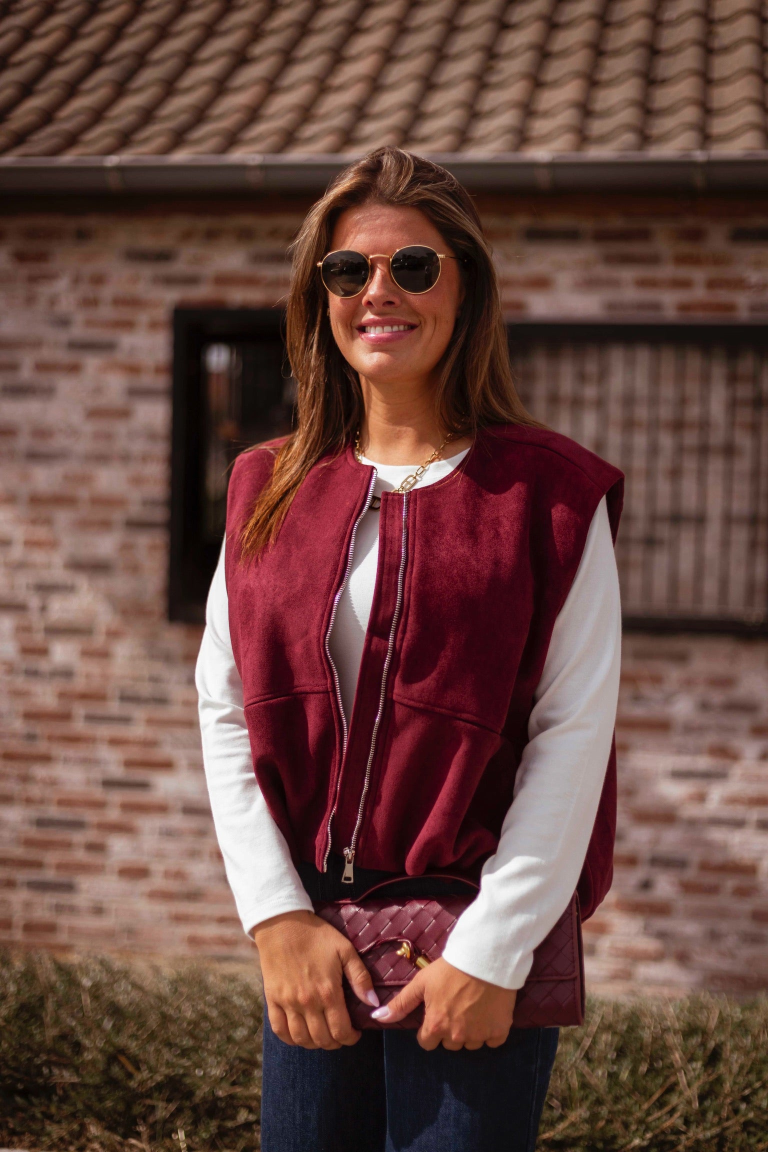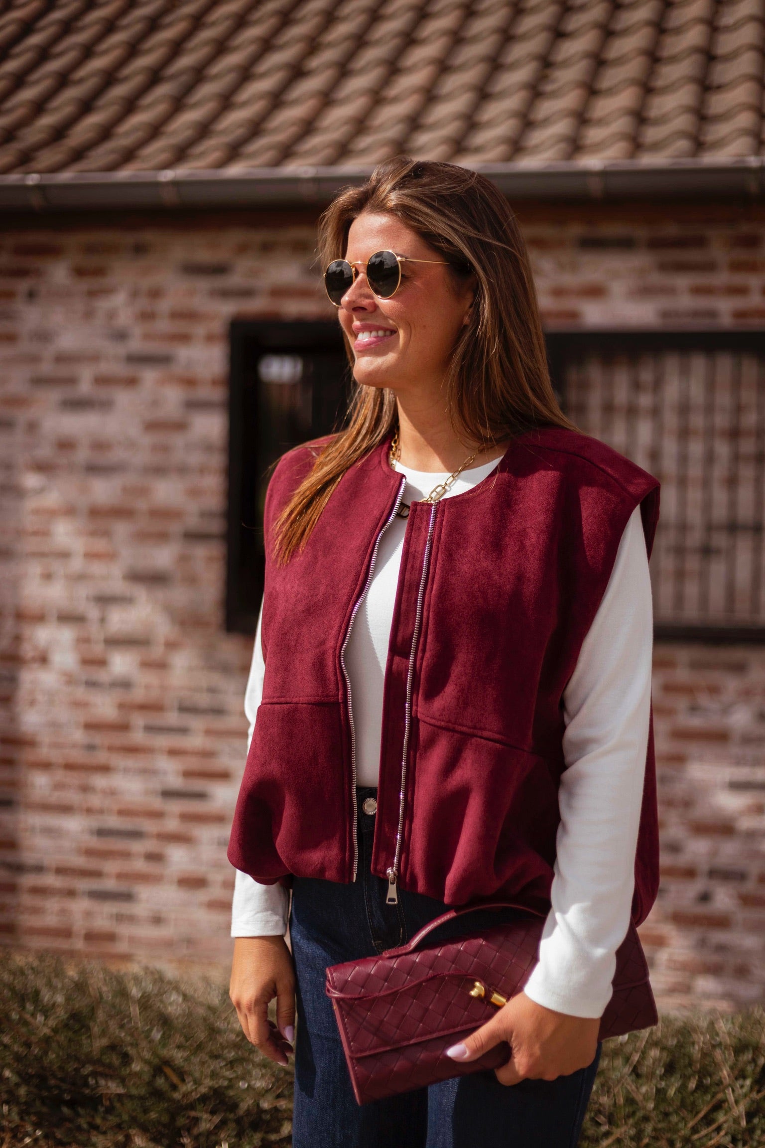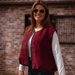 Een mouwloos jasje in zachte bordeau suède dat een stoere maar verfijnde uitstraling geeft. Perfect om over een knit of blouse te dragen en zo een gelaagde, herfstige look te creëren.
