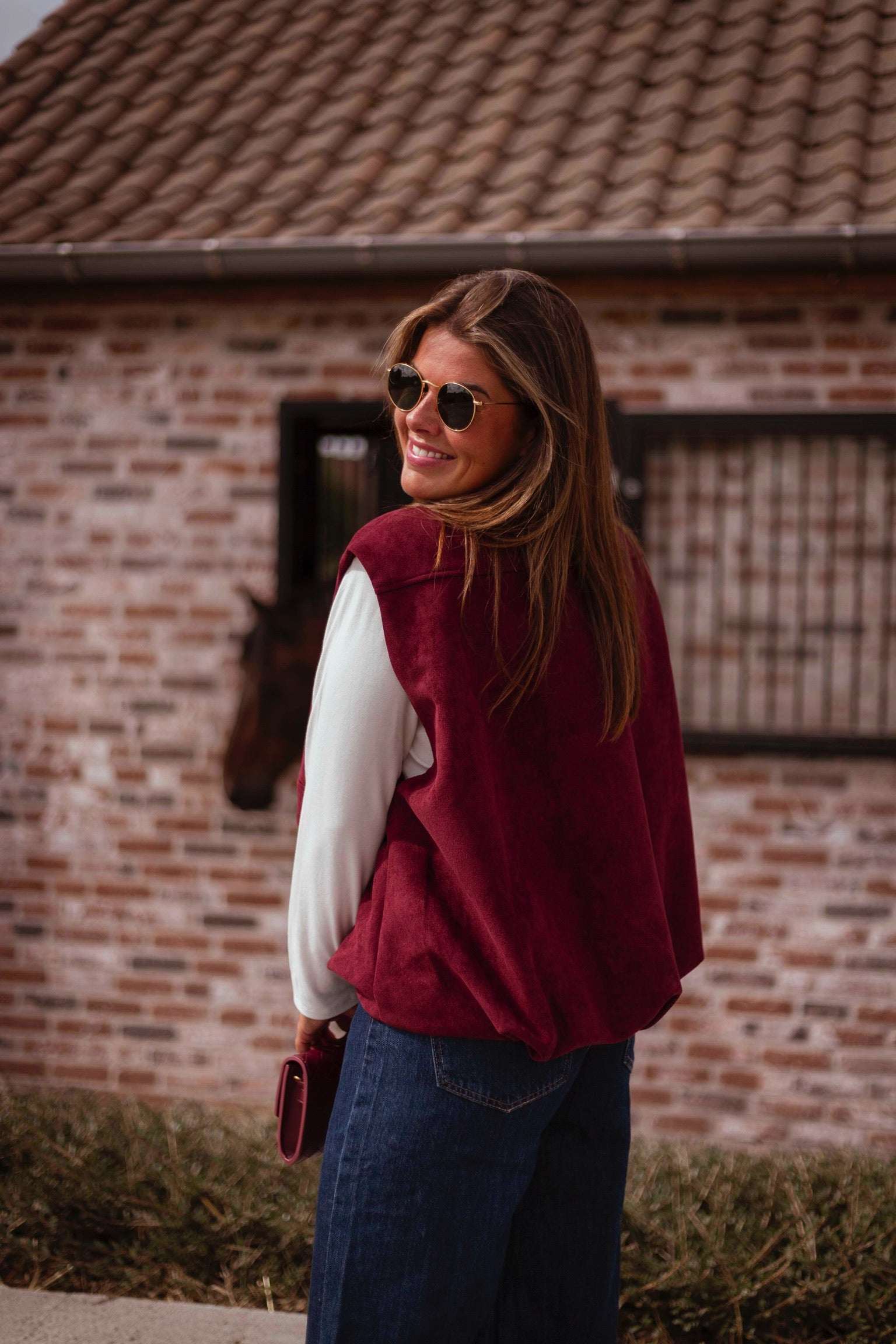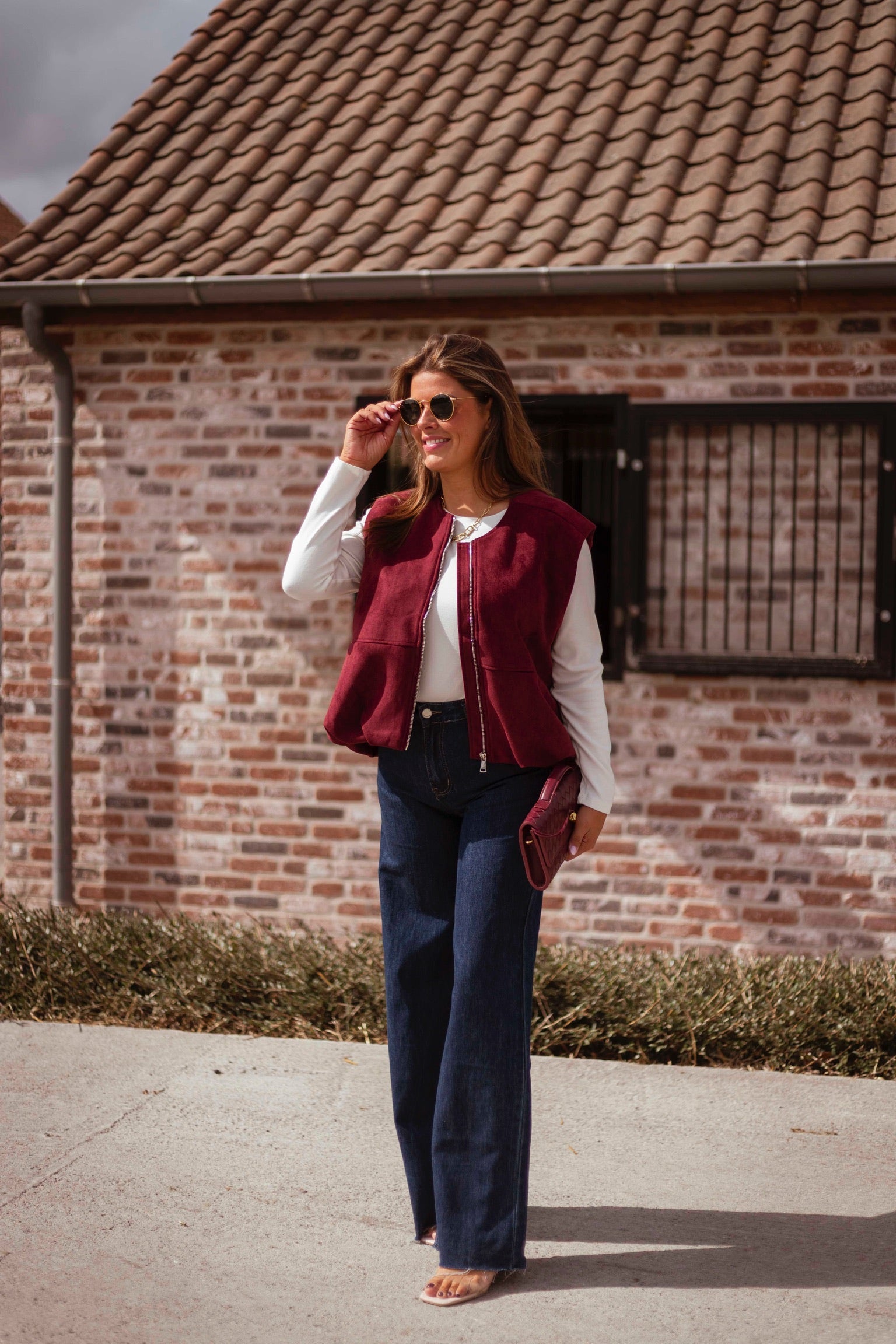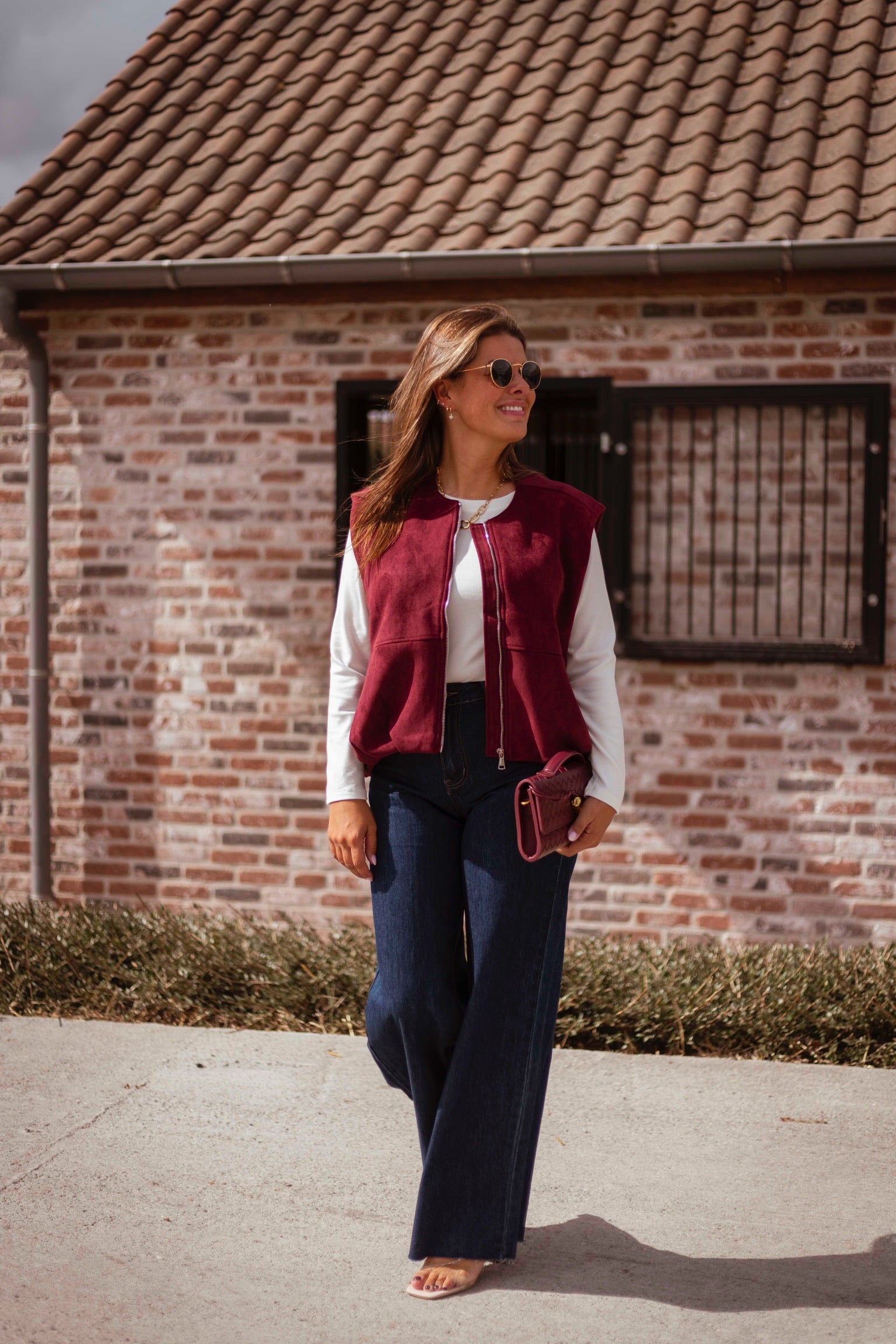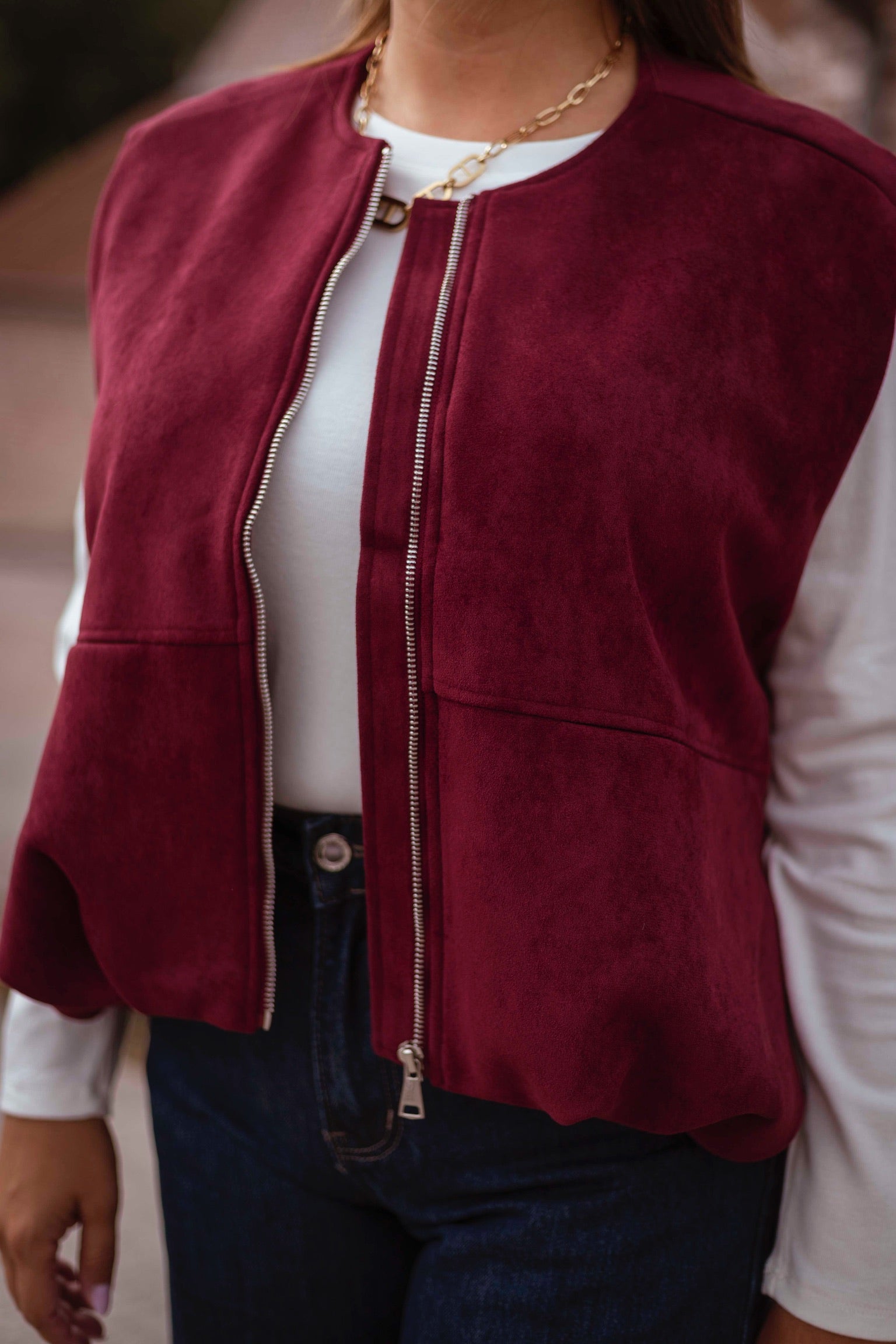 Een mouwloos jasje in zachte bordeau suède dat een stoere maar verfijnde uitstraling geeft. Perfect om over een knit of blouse te dragen en zo een gelaagde, herfstige look te creëren.